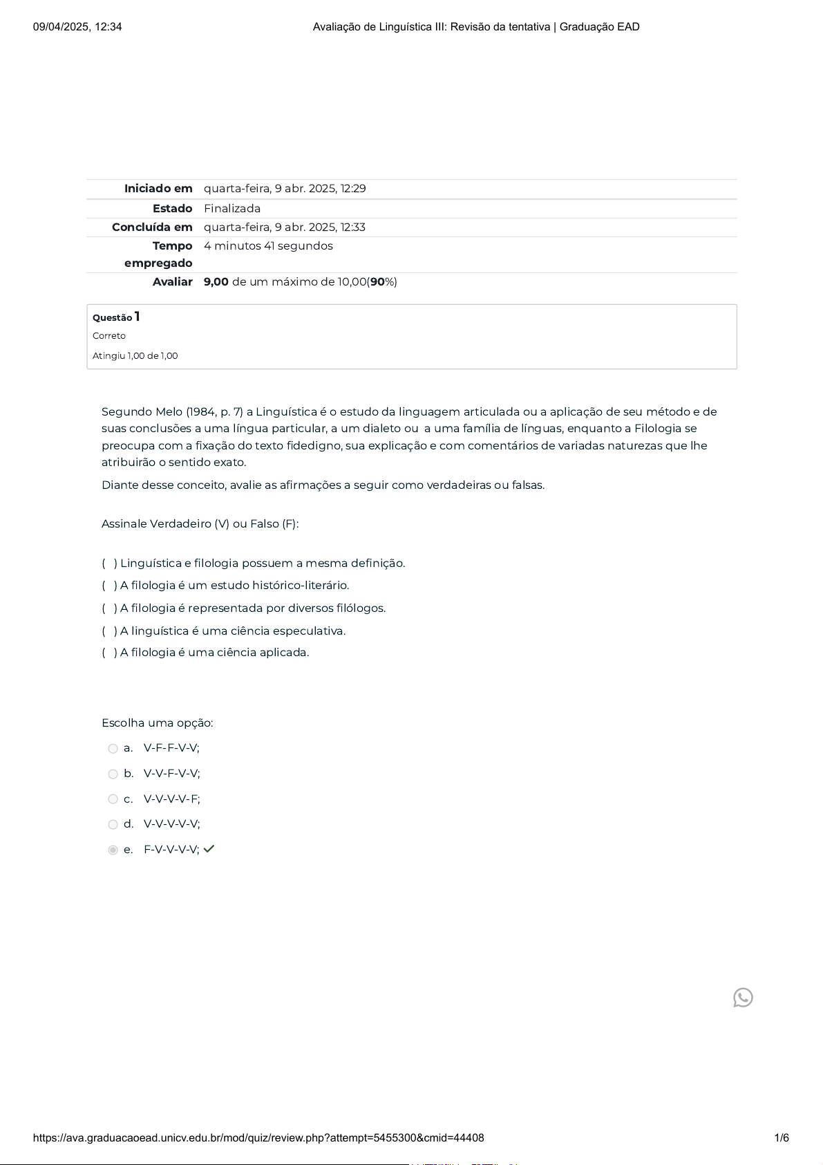 Iniciado em quarta-feira, 9 abr. 2025, 12:29 Estado Finalizada Concluída em quarta-feira, 9 abr. 2025, 12:33 Tempo empregado 4 minutos 41 segundos Avaliar 9,00 de um máximo de 10,00(90%) Questão 1 Correto Atingiu 1,00 de 1,00 Segundo Melo (1984, p. 7) a Linguística é o estudo da linguagem articulada ou a aplicação de seu método e de suas conclusões a uma língua particular, a um dialeto ou a uma família de línguas, enquanto a Filologia se preocupa com a fixação do texto fidedigno, sua explicação e com comentários de variadas naturezas que lhe atribuirão o sentido exato. Diante desse conceito, avalie as afirmações a seguir como verdadeiras ou falsas. Assinale Verdadeiro (V) ou Falso (F): ( ) Linguística e filologia possuem a mesma definição. ( ) A filologia é um estudo histórico-literário. ( ) A filologia é representada por diversos filólogos. ( ) A linguística é uma ciência especulativa. ( ) A filologia é uma ciência aplicada. Escolha uma opção: a. V-F-F-V-V; b. V-V-F-V-V; c. V-V-V-V-F; d. V-V-V-V-V; e. F-V-V-V-V; ✓ 09/04/2025, 12:34 Avaliação de Linguística III: Revisão da tentativa | Graduação EAD https://ava.graduacaoead.unicv.edu.br/mod/quiz/review.php?attempt=5455300&cmid=44408 1/6 https://api.whatsapp.com/send?phone=554491540086&text=Ol%C3%A1,%20como%20podemos%20te%20ajudar%20hoje? Questão 2 Incorreto Atingiu 0,00 de 1,00 Questão 3 Correto Atingiu 1,00 de 1,00 Na disciplina em questão, você estudou sobre descrição e prescrição. Embora a gramática ainda seja muito valorizada e nunca deve ser menosprezada, a língua não serve apenas para estudiosos. A língua é bem comum a toda comunidade; e, como composição dela há diversas camadas sociais, sejam elas escolarizadas ou não. Devido a situações expressas neste primeiro parágrafo é que as aplicações da gramática tradicional se tornam perigosas. A conclusão da autora é que? Considerando o exposto, assinale a opção correta: Escolha uma opção: a. Não pode difundir as duas gramáticas. Elas são existentes em suas particularidades; tanto a Gramática Normativa e Gramática Descritiva. b. A Gramática Normativa e Gramática Descritiva devem seguir a necessidade coloquial da língua. c. As duas gramáticas devem ser tratadas diferentemente. × d. A Gramática Normativa e Gramática Descritiva são contraditórias. e. A Gramática Normativa e Gramática Descritiva usam a norma padrão da língua. As figuras de construção são definidas por Martino (2018, p. 278) como aquelas que “trabalham a construção da frase”. São elas: o anacoluto, a anáfora, o apóstrofo, o assíndeto, a elipse, o hipérbato, o pleonasmo, o polissíndeto, a silepse e a zeugma. O anacoluto é? Diante do exposto, marque a opção correta: Escolha uma opção: a. A mudança repentina no significado da palavra. b. A mudança fonética das letras. c. A mudança no sentido do texto. d. A mudança na ordem da frase. e. A mudança repentina na estrutura da frase. ✓ 09/04/2025, 12:34 Avaliação de Linguística III: Revisão da tentativa | Graduação EAD https://ava.graduacaoead.unicv.edu.br/mod/quiz/review.php?attempt=5455300&cmid=44408 2/6 https://api.whatsapp.com/send?phone=554491540086&text=Ol%C3%A1,%20como%20podemos%20te%20ajudar%20hoje? Questão 4 Correto Atingiu 1,00 de 1,00 Questão 5 Correto Atingiu 1,00 de 1,00 Para desenvolver um trabalho e análise do discurso, Orlandi (1987, p. 57-58) orienta a seguir o seguinte percurso: “análise de palavras; análise de construções; construção de uma rede semântica, intermediária entre o social e o gramatical; consideração da produção social do texto como constitutiva de seu sentido”. Assim sendo, de acordo com a autora, o analista precisa: Sobre isso, marque a opção correta: Escolha uma opção: a. Associar a gramática com a sua aplicação no discurso e no cenário ou contexto social em que ele está inserido. ✓ b. Associar a gramática com o discurso. c. Associar a gramática com a sua aplicação no cotidiano das palavras. d. Associar a gramática com a escrita. e. Associar a palavra com seu significado. Na disciplina em questão, você estudou sobre a teoria da informação. A comunicação é uma das principais funções da linguagem. Segundo Saussure, a língua é fundamentalmente um instrumento utilizado para que as pessoas possam se comunicar umas com as outras. A respeito da comunicação, analise as afirmações a seguir: I – A comunicação pode ser definida como o processo pelo qual as pessoas transmitem as suas ideias ou sentimentos. II – O processo de se comunicar precisa necessariamente ser falado ou verbalizado. III – O processo de se comunicar não precisa necessariamente ser falado ou verbalizado, também é possível se comunicar de forma escrita, por meio de códigos, por gestos que são culturalmente identificados pelo outro etc. IV – A comunicação conta com, pelo menos, dois elementos: o locutor e o interlocutor. Sabendo disso, assinale a alternativa correta: Escolha uma opção: a. Apenas I, III e IV estão corretas. ✓ b. Apenas II, III e IV estão corretas. c. Apenas I e II estão corretas. d. Apenas I está correta. e. Apenas II está correta. 09/04/2025, 12:34 Avaliação de Linguística III: Revisão da tentativa | Graduação EAD https://ava.graduacaoead.unicv.edu.br/mod/quiz/review.php?attempt=5455300&cmid=44408 3/6 https://api.whatsapp.com/send?phone=554491540086&text=Ol%C3%A1,%20como%20podemos%20te%20ajudar%20hoje? Questão 6 Correto Atingiu 1,00 de 1,00 Questão 7 Correto Atingiu 1,00 de 1,00 Segundo Marcuchi (2006, p.48) a hesitação é intrínseca à competência comunicativa em contextos interativos de natureza oral e não uma disfunção do falante. Diante desse conceito, podemos dizer que a hesitação indica que: Diante do exposto, marque a opção correta: Escolha uma opção: a. Há falta de habilidade por parte do falante em se fazer entender b. O falante entrou em contradiç