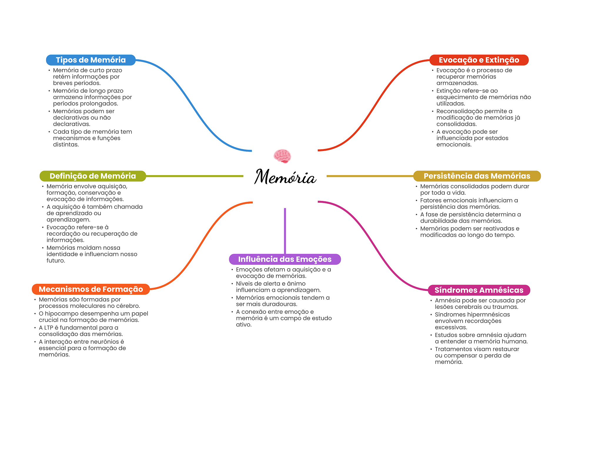 Tipos de Memória Evocação e Extinção Memória de curto prazo Evocação é processo de retém informações por recuperar memórias breves períodos. armazenadas. Memória de longo prazo Extinção refere-se ao armazena informações por esquecimento de memórias não períodos prolongados. utilizadas. Memórias podem ser Reconsolidação permite a declarativas ou não modificação de memórias já declarativas. consolidadas. Cada tipo de memória tem A evocação pode ser mecanismos e funções influenciada por estados distintas. emocionais. Definição de Memória Memória Persistência das Memórias Memória envolve aquisição, Memórias consolidadas podem durar formação, conservação e por toda a vida. evocação de informações. Fatores emocionais influenciam a A aquisição é também chamada persistência das memórias. de aprendizado ou A fase de persistência determina a aprendizagem. durabilidade das memórias. Evocação refere-se à Memórias podem ser reativadas e recordação ou recuperação de modificadas ao longo do tempo. informações. Memórias moldam nossa identidade e influenciam nosso futuro. Influência das Emoções Emoções afetam a aquisição e a evocação de memórias. Níveis de alerta e ânimo Mecanismos de Formação influenciam a aprendizagem. Síndromes Amnésicas Memórias são formadas por Memórias emocionais tendem a processos moleculares no cérebro. ser mais duradouras. Amnésia pode ser causada por lesões cerebrais ou traumas. hipocampo desempenha um papel A conexão entre emoção e Síndromes hipermnésicas crucial na formação de memórias. memória é um campo de estudo ativo. envolvem recordações A LTP é fundamental para a excessivas. consolidação das memórias. Estudos sobre amnésia ajudam A interação entre neurônios é a entender a memória humana. essencial para a formação de Tratamentos visam restaurar memórias. ou compensar a perda de memória.