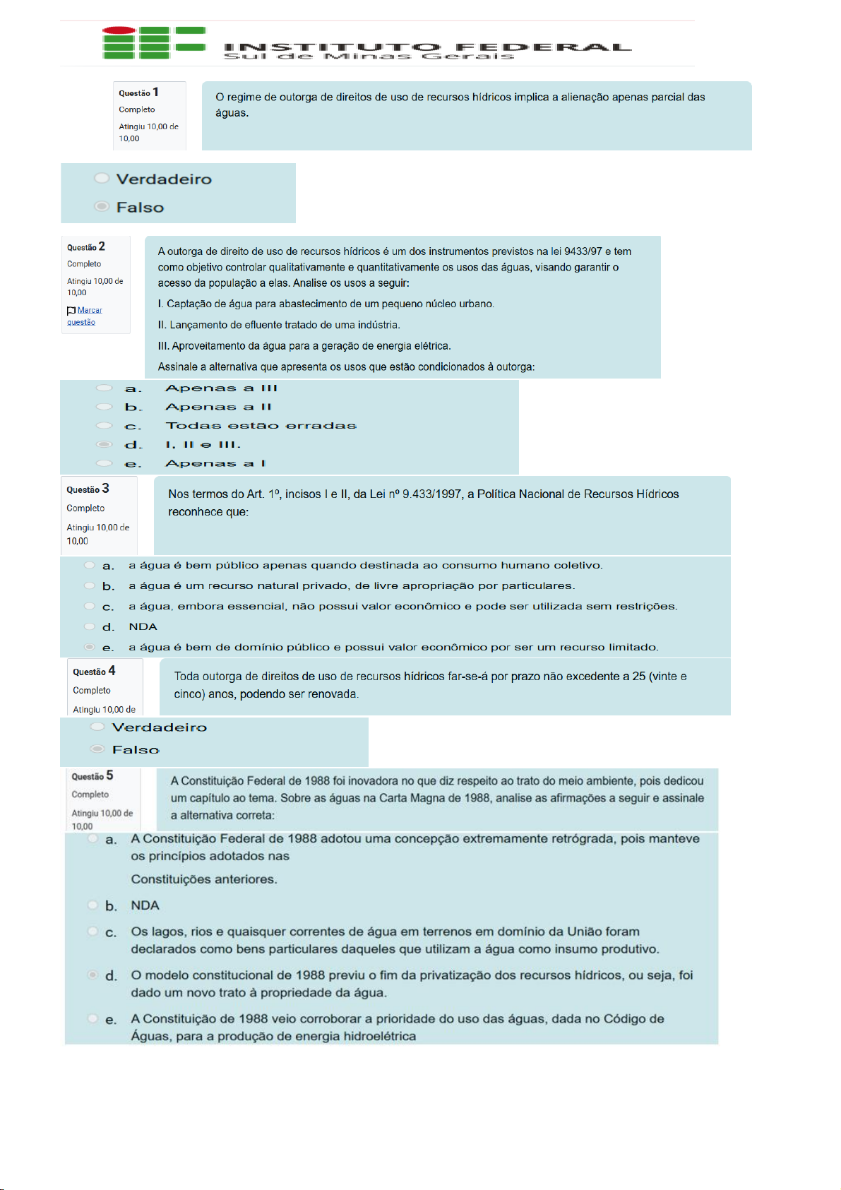 Questão 1 regime de outorga de direitos de uso de recursos hídricos implica a alienação apenas parcial das Completo águas. Atingiu 10,00 de 10,00 Verdadeiro Falso Questão 2 A outorga de direito de uso de recursos hídricos é um dos instrumentos previstos na lei 9433/97 e tem Completo como objetivo controlar qualitativamente e quantitativamente os usos das águas, visando garantir Atingiu 10,00 de acesso da população a elas. Analise os usos a seguir: 10,00 I. Captação de água para abastecimento de um pequeno núcleo urbano. Marcar II. Lançamento de efluente tratado de uma indústria. III. Aproveitamento da água para a geração de energia elétrica. Assinale a alternativa que apresenta os usos que estão condicionados à outorga: a. Apenas a III b. Apenas a Todas estão erradas d. I, II e III. e. Apenas a Questão 3 Nos termos do Art. 1°, incisos e II, da Lei n° 9.433/1997, a Política Nacional de Recursos Hídricos Completo reconhece que: Atingiu 10,00 de 10,00 a. a água é bem público apenas quando destinada ao consumo humano coletivo. b. a água é um recurso natural privado, de livre apropriação por particulares. a água, embora essencial, não possui valor econômico e pode ser utilizada sem restrições. d. NDA e. a água é bem de domínio público e possui valor econômico por ser um recurso limitado. Questão 4 Toda outorga de direitos de uso de recursos hídricos far-se-á por prazo não excedente a 25 (vinte e Completo cinco) anos, podendo ser renovada. Atingiu 10,00 de Verdadeiro Falso Questão 5 A Constituição Federal de 1988 foi inovadora no que diz respeito ao trato do meio ambiente, pois dedicou Completo um capítulo ao tema. Sobre as águas na Carta Magna de 1988, analise as afirmações a seguir e assinale Atingiu 10,00 de a alternativa correta: 10,00 a. A Constituição Federal de 1988 adotou uma concepção extremamente retrógrada, pois manteve os princípios adotados nas Constituições anteriores. b. NDA Os lagos, rios e quaisquer correntes de água em terrenos em domínio da União foram declarados como bens particulares daqueles que utilizam a água como insumo produtivo. d. modelo constitucional de 1988 previu fim da privatização dos recursos hídricos, ou seja, foi dado um novo trato à propriedade da água. e. A Constituição de 1988 veio corroborar a prioridade do uso das águas, dada no Código de Águas, para a produção de energia hidroelétricaQuestão 6 De acordo com a Agência Nacional de Águas ANA, a PNRH é conhecida como uma lei moderna por Completo possuir caráter descentralizador, por criar um sistema nacional que integra União e estados, e Atingiu 10,00 de 10,00 participativo, por inovar com a instalação de comitês de bacias hidrográficas que une poderes públicos nas três instâncias, usuários e sociedade civil na gestão de recursos hídricos. Além disso, criou Marcar questão condições para identificar conflitos pelo uso das águas, por meio dos planos de recursos hídricos das bacias hidrográficas, e arbitrar conflitos no âmbito administrativo. Verdadeiro Falso Questão 7 De acordo com Art. 49 da Política Nacional de Recursos Hídricos PNRH, (Lei n. 9.433/1997) constitui Completo infração das normas de utilização de recursos hídricos superficiais ou subterrâneos, analise as assertivas Atingiu 10,00 de 10,00 e marque V para as asserções verdadeiras e F para as asserções falsas: Marcar questão I. Derivar ou utilizar recursos hídricos para qualquer finalidade, com a respectiva outorga de direito de uso II. Perfurar poços para extração de água subterrânea ou operá-los sem a devida autorização III. Iniciar a implantação ou implantar empreendimento relacionado com a derivação ou a utilização de recursos hídricos, superficiais ou subterrâneos, que implique alterações no regime, quantidade ou qualidade dos mesmos, sem autorização dos órgãos ou entidades competentes IV. Permitir a ação fiscalizadora das autoridades competentes no exercício de suas funções a. F-F-V-F b. F-V-V-F Questão 8 Os fundamentos da Lei Federal n. 9.433/97 estão dispostos no Título I, Da Política Nacional de Recursos Completo Hídricos. Sobre assunto, analise as assertivas a seguir e assinale a alternativa correspondente: Atingiu 10,00 de 10,00 I. A água foi considerada um bem de domínio público, ou seja, pode ser apropriada por quem primeiro reivindicar. Marcar questão II. A água foi considerada um bem infinito e dotado de valor econômico, por isso a exploração pode ser perpétua. III. Foi destacado que em situações de escassez uso prioritário dos recursos hídricos é o consumo humano e a dessedentação de animais. IV. A gestão dos recursos hídricos deve priorizar uso múltiplo, diferentemente do Código de Águas que privilegiava a produção de energia. Estão corretas apenas: a. Apenas a IV está Correta b. Apenas I e II estão Corretas C. Apenas III e IV estão Corretas d. Apenas a está correta e. Apenas está corretaQuestão 9 A outorga de direito de uso dos recursos hídricos é um importante instrumento de gestão das águas. A Completo sua liberação precisa estar de acordo com o planejamento estabelecido para a bacia hidrográfica, Atingiu 10,00 de respeitando os usos múltiplos da água e o enquadramento dos corpos hídricos. A respeito da outorga de 10,00 direito de uso e desse enquadramento em classe, analise as Marcar questão assertivas a seguir. I. Todos os usos das águas estão condicionados à liberação de uma outorga, independentemente da vazão da água a ser utilizada. Tal documento deve ser solicitado à Agência Nacional de Águas (ANA). II. A outorga tem prazo de validade variável, podendo chegar a 35 anos e ser prorrogável. III. Para que haja lançamento de efluentes em um corpo hídrico, é necessário que um padrão seja obedecido a fim de se garantir a qualidade da água, de acordo com enquadramento do corpo hídrico. Após a análise das assertivas,