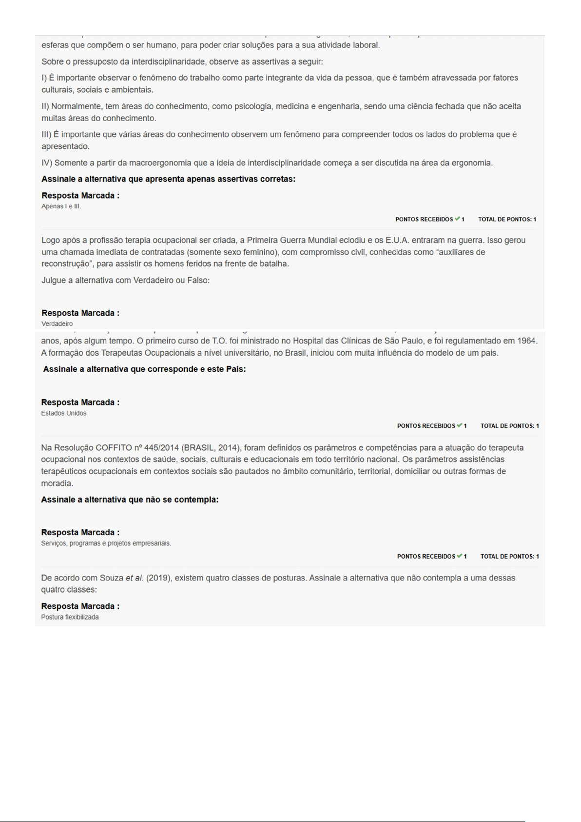 esferas que compõem ser humano, para poder criar soluções para a sua atividade laboral. Sobre o pressuposto da interdisciplinaridade, observe as assertivas a seguir: I) É importante observar o fenômeno do trabalho como parte integrante da vida da pessoa, que é também atravessada por fatores culturais, sociais e ambientais. II) Normalmente, tem áreas do conhecimento, como psicologia, medicina e engenharia, sendo uma ciência fechada que não aceita muitas áreas do conhecimento. III) É importante que várias áreas do conhecimento observem um fenômeno para compreender todos os lados do problema que é apresentado. IV) Somente a partir da macroergonomia que a ideia de interdisciplinaridade começa a ser discutida na área da ergonomia. Assinale a alternativa que apresenta apenas assertivas corretas: Resposta Marcada Apenas e III. PONTOS RECEBIDOS 1 TOTAL DE PONTOS: 1 Logo após a profissão terapia ocupacional ser criada, a Primeira Guerra Mundial eclodiu e os E.U.A. entraram na guerra. Isso gerou uma chamada imediata de contratadas (somente sexo feminino), com compromisso civil, conhecidas como "auxiliares de reconstrução", para assistir os homens feridos na frente de batalha. Julgue a alternativa com Verdadeiro ou Falso: Resposta Marcada : Verdadeiro anos, após algum tempo. O primeiro curso de T.O. foi ministrado no Hospital das Clínicas de São Paulo, e foi regulamentado em 1964. A formação dos Terapeutas Ocupacionais a nível universitário, no Brasil, iniciou com muita influência do modelo de um pais. Assinale a alternativa que corresponde e este Pais: Resposta Marcada : Estados Unidos PONTOS RECEBIDOS 1 TOTAL DE PONTOS: 1 Na Resolução COFFITO n° 445/2014 (BRASIL, 2014), foram definidos os parâmetros e competências para a atuação do terapeuta ocupacional nos contextos de saúde, sociais, culturais e educacionais em todo território nacional. Os parâmetros assistências terapêuticos ocupacionais em contextos sociais são pautados no âmbito comunitário, territorial, domiciliar ou outras formas de moradia. Assinale a alternativa que não se contempla: Resposta Marcada : Serviços, programas e projetos empresariais. PONTOS RECEBIDOS 1 TOTAL DE PONTOS: 1 De acordo com Souza et al. (2019), existem quatro classes de posturas. Assinale a alternativa que não contempla a uma dessas quatro classes: Resposta Marcada : Postura flexibilizada