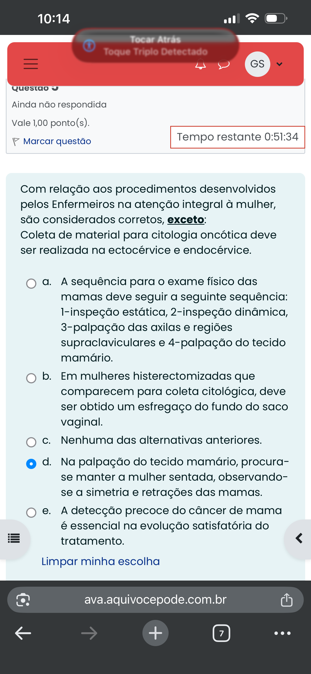 10:14 Tocar Atrás Toque Triplo Detectado GS Ainda não respondida Vale 1,00 ponto(s). Marcar questão Tempo restante 0:51:34 Com relação aos procedimentos desenvolvidos pelos Enfermeiros na atenção integral à mulher, são considerados corretos, exceto: Coleta de material para citologia oncótica deve ser realizada na ectocérvice e endocérvice. a. sequência para exame físico das mamas deve seguir a seguinte sequência: 1-inspeção estática, 2-inspeção dinâmica, 3-palpação das axilas e regiões supraclaviculares e 4-palpação do tecido mamário. b. Em mulheres histerectomizadas que comparecem para coleta citológica, deve ser obtido um esfregaço do fundo do saco vaginal. Nenhuma das alternativas anteriores. d. Na palpação do tecido mamário, procura- se manter a mulher sentada, observando- se a simetria e retrações das mamas. e. A detecção precoce do câncer de mama é essencial na evolução satisfatória do tratamento. Limpar minha escolha ava.aquivocepode.com.br + 7