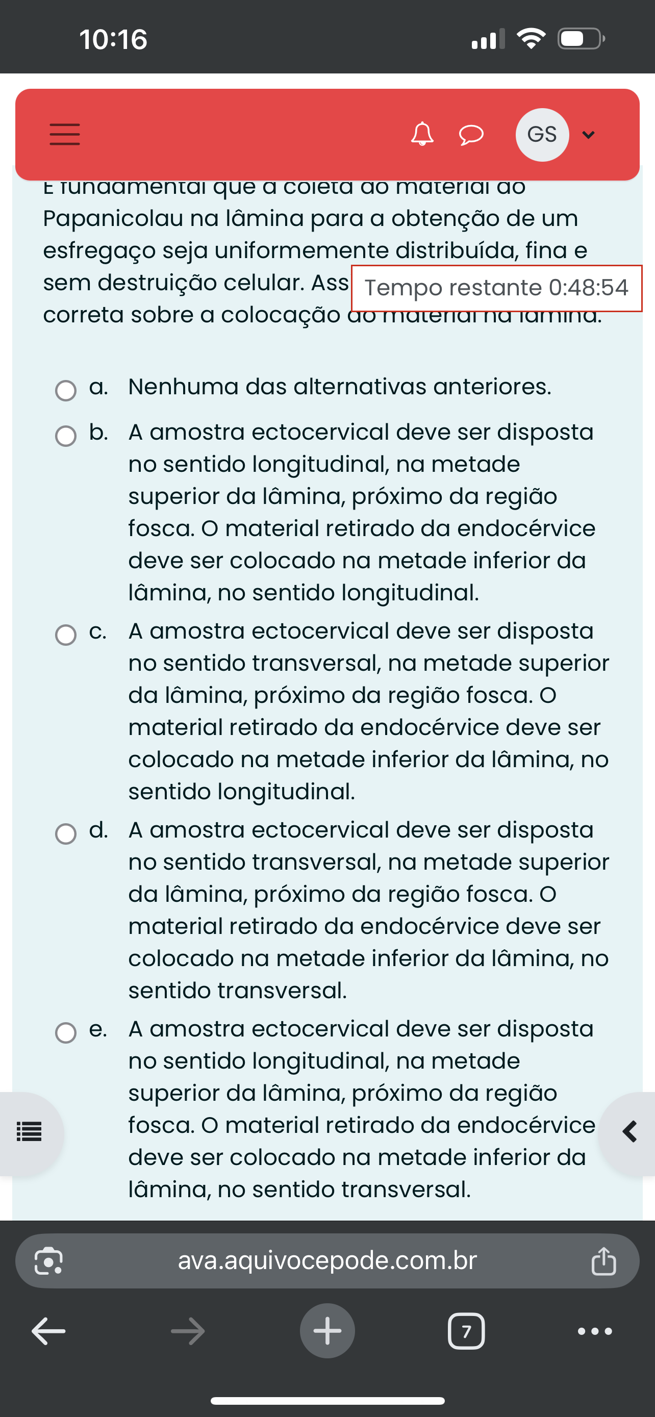 10:16 GS E que a coleta ao material ao Papanicolau na lâmina para a obtenção de um esfregaço seja uniformemente distribuída, fina e sem destruição celular. Ass Tempo restante 0:48:54 correta sobre a colocação ao material na a. Nenhuma das alternativas anteriores. b. amostra ectocervical deve ser disposta no sentido longitudinal, na metade superior da lâmina, próximo da região fosca. material retirado da endocérvice deve ser colocado na metade inferior da lâmina, no sentido longitudinal. A amostra ectocervical deve ser disposta no sentido transversal, na metade superior da lâmina, próximo da região fosca. material retirado da endocérvice deve ser colocado na metade inferior da lâmina, no sentido longitudinal. d. amostra ectocervical deve ser disposta no sentido transversal, na metade superior da lâmina, próximo da região fosca. material retirado da endocérvice deve ser colocado na metade inferior da lâmina, no sentido transversal. e. amostra ectocervical deve ser disposta no sentido longitudinal, na metade superior da lâmina, próximo da região fosca. material retirado da endocérvice deve ser colocado na metade inferior da lâmina, no sentido transversal. ava.aquivocepode.com.br + 7