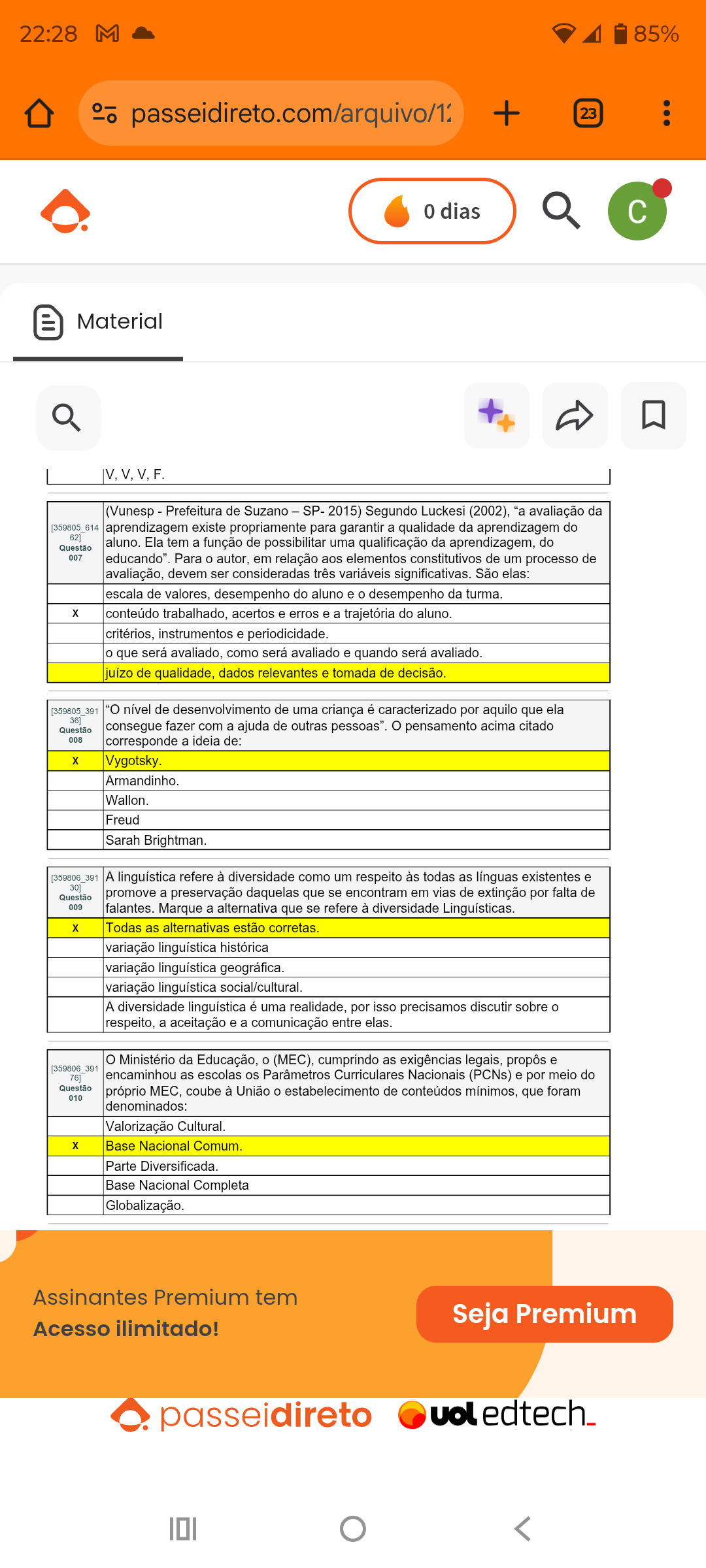 22:28 M 85% passeidireto.com/arquivo/1 + 23 0 dias Material V,V,V,F. (Vunesp Prefeitura de Suzano SP- 2015) Segundo Luckesi (2002), "a avaliação da 614 aprendizagem existe propriamente para garantir a qualidade da aprendizagem do 62] Questão aluno. Ela tem a função de possibilitar uma qualificação da aprendizagem, do 007 educando". Para autor, em relação aos elementos constitutivos de um processo de avaliação, devem ser consideradas três variáveis significativas. São elas: escala de valores, desempenho do aluno e desempenho da turma. X conteúdo trabalhado, acertos e erros e a trajetória do aluno. critérios, instrumentos e periodicidade. que será avaliado, como será avaliado e quando será avaliado. juízo de qualidade, dados relevantes e tomada de decisão. 391 "O nível de desenvolvimento de uma criança é caracterizado por aquilo que ela 36] Questão consegue fazer com a ajuda de outras pessoas". pensamento acima citado 008 corresponde a ideia de: Vygotsky Wallon. Freud Sarah Brightman. A linguística refere à diversidade como um respeito às todas as línguas existentes e 30] Questão promove a preservação daquelas que se encontram em vias de extinção por falta de 009 falantes. Marque a alternativa que se refere à diversidade Linguísticas. X Todas as alternativas estão corretas. variação linguística histórica variação linguística geográfica. variação linguística social/cultural. A diversidade linguística é uma realidade, por isso precisamos discutir sobre respeito, a aceitação e a comunicação entre Ministério da Educação, (MEC), cumprindo as exigências legais, propôs e [359806 391 76] encaminhou as escolas os Parâmetros Curriculares Nacionais (PCNs) e por meio do Questão próprio MEC, coube à União estabelecimento de conteúdos mínimos, que foram 010 denominados: Valorização Cultural. X Base Nacional Parte Diversificada. Base Nacional Completa Globalização. Assinantes Premium tem Acesso ilimitado! Seja Premium passeidireto