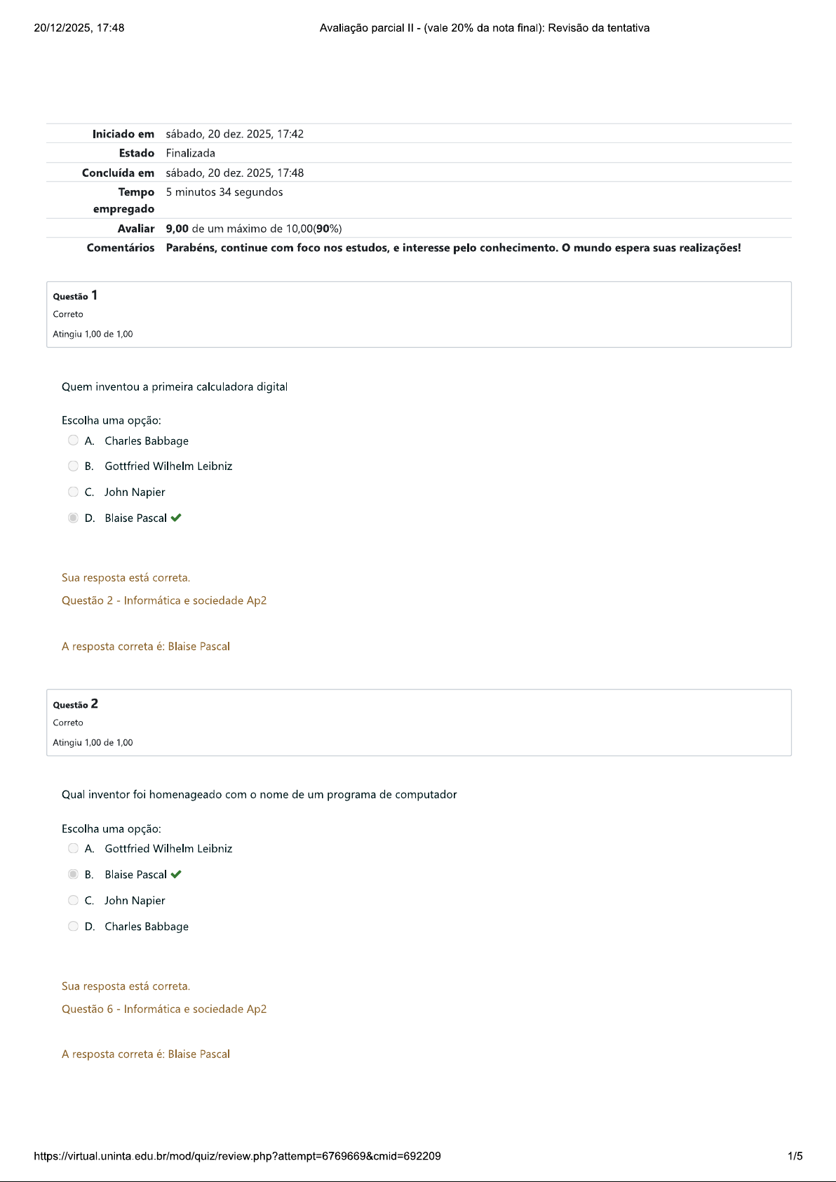 20/12/2025, 17:48 Avaliação parcial (vale 20% da nota final): Revisão da tentativa Iniciado em sábado, 20 dez. 2025, 17:42 Estado Finalizada Concluída em sábado, 20 dez. 2025, 17:48 Tempo 5 minutos 34 segundos empregado Avaliar 9,00 de um máximo de 10,00(90%) Comentários Parabéns, continue com foco nos estudos, e interesse pelo conhecimento. mundo espera suas realizações! Questão 1 Correto Atingiu 1,00 de 1,00 Quem inventou a primeira calculadora digital Escolha uma opção: Charles Babbage B. Gottfried Wilhelm Leibniz C. John Napier D. Blaise Pascal Sua resposta está correta. Questão 2 Informática e sociedade Ap2 A resposta correta é: Blaise Pascal Questão 2 Correto Atingiu 1,00 de 1,00 Qual inventor foi homenageado com o nome de um programa de computador Escolha uma opção: A. Gottfried Wilhelm Leibniz Blaise Pascal C. John Napier D. Charles Babbage Sua resposta está correta. Questão 6 Informática e sociedade Ap2 A resposta correta é: Blaise Pascal 1/520/12/2025, 17:48 Avaliação parcial (vale 20% da nota final): Revisão da tentativa Questão 3 Correto Atingiu 1,00 de 1,00 Quem desenvolveu logaritmos e um conjunto de nove bastões para auxiliar na multiplicação Escolha uma opção: John Napier Charles Babbage C. Gottfried Wilhelm Leibniz D. Blaise Pascal Sua resposta está correta. Questão 5 Informática e sociedade Ap2 A resposta correta é: John Napier Questão 4 Correto Atingiu 1,00 de 1,00 que acontece com pessoas que tem o domínio da informação, perante o mercado de trabalho Escolha uma opção: A. Estão desamparadas. Diminuíram seu salário. C. Estão desempregadas. D. Estão recebendo altas remunerações. Sua resposta está correta. Questão 15 Informática e sociedade Ap2 A resposta correta é: Estão recebendo altas remunerações. 2/520/12/2025, 17:48 Avaliação parcial (vale 20% da nota final): Revisão da tentativa Questão 5 Correto Atingiu 1,00 de 1,00 Quem construiu uma máquina analítica Escolha uma opção: Blaise Pascal John Napier C. Charles Babbage D. Gottfried Wilhelm Leibniz Sua resposta está correta. Questão 3 Informática e sociedade Ap2 A resposta correta é: Charles Babbage Questão 6 Correto Atingiu 1,00 de 1,00 Durante a Revolução Industrial, para atender as suas necessidades, como as empresas viam o individuo Escolha uma opção: viam como ser humano. viam como um ser incapaz. viam como um meio de produção. D. viam apenas como despesa. Sua resposta está correta. Questão 11 Informática e sociedade Ap2 A resposta correta é: viam como um meio de produção. 3/520/12/2025, 17:48 Avaliação parcial (vale 20% da nota final): Revisão da tentativa Questão 7 Correto Atingiu 1,00 de 1,00 Atualmente, estamos vivendo em qual Era Industrial Escolha uma opção: Quarta Segunda C. Terceira D. Primeira Sua resposta está correta. Questão 17 Informática e sociedade Ap2 A resposta correta é: Quarta Questão 8 Correto Atingiu 1,00 de 1,00 Quem foi primeiro a inventar uma calculadora que realizava as quatro operações básicas Escolha uma opção: John Napier Charles Babbage Blaise Pascal D. Gottfried Wilhelm Leibniz Sua resposta está correta. Questão 4 Informática e sociedade Ap2 A resposta correta é: Gottfried Wilhelm Leibniz 4/520/12/2025, 17:48 Avaliação parcial (vale 20% da nota final): Revisão da tentativa Questão 9 Correto Atingiu 1,00 de 1,00 Atualmente, as pessoas que não compreendem os benefícios dos computadores e outras tecnologias da revolução da informação, geralmente, referem-se a eles de forma indevida. Marque a alternativa que não corresponde a essa visão das pessoas em relação aos computadores e as demais tecnologias: Escolha uma opção: Eles estão reduzindo salários e consumindo empregos. Eles estão aumentando calor na atmosfera terrestre. Eles são monstros mecânicos. D. Eles estão ameaçando seu meio de sobrevivência. Sua resposta está correta. Questão 14 - Informática e sociedade Ap2 A resposta correta é: Eles estão aumentando o calor na atmosfera terrestre. Questão 10 Incorreto Atingiu 0,00 de 1,00 Qual inventor que chegou a cogitar a possibilidade de construir uma maquina pensante Escolha uma opção: A. Gottfried Wilhelm Leibniz Charles Babbage John Napier D. Blaise Pascal Sua resposta está incorreta. Questão 7 Informática e sociedade Ap2 A resposta correta é: Blaise Pascal 5/5