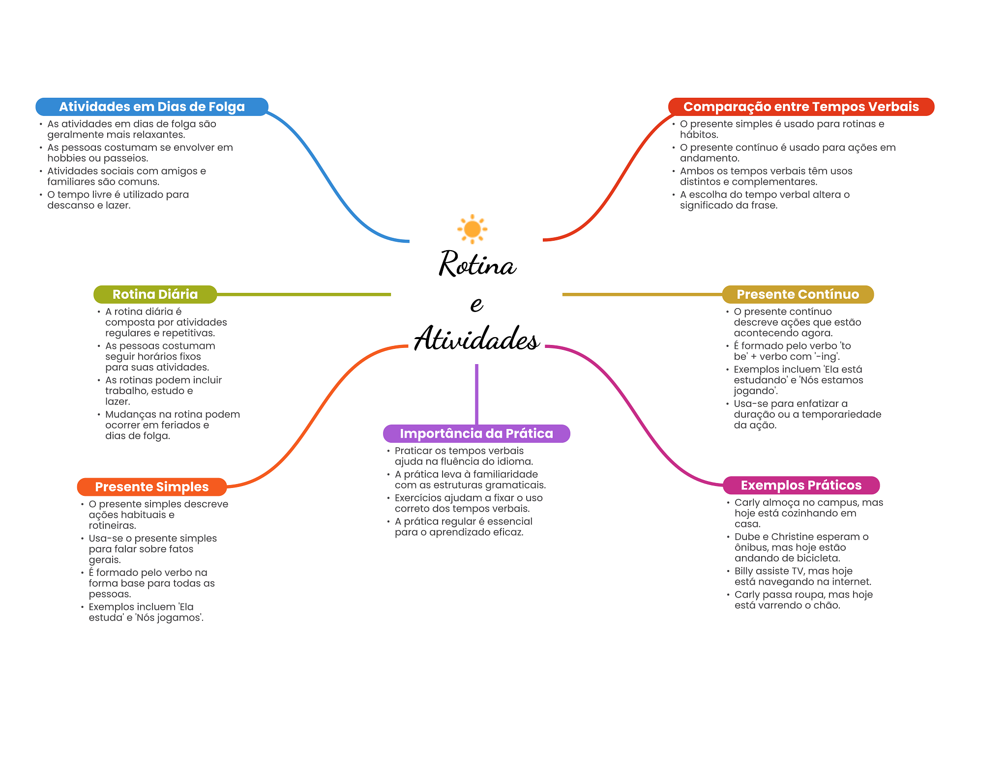 Atividades em Dias de Folga Comparação entre Tempos Verbais As atividades em dias de folga são O presente simples é usado para rotinas e geralmente mais relaxantes. hábitos. As pessoas costumam se envolver em presente contínuo é usado para ações em hobbies ou passeios. andamento. Atividades sociais com amigos e Ambos tempos verbais têm usos familiares são comuns. distintos e complementares. tempo livre é utilizado para A escolha do tempo verbal altera descanso e lazer. significado da frase. Rotina Rotina Diária Presente Contínuo A rotina diária é e O presente contínuo composta por atividades descreve ações que estão regulares e repetitivas. As pessoas costumam Atividades acontecendo agora. É formado pelo verbo 'to seguir horários fixos be' + verbo com '-ing'. para suas atividades. Exemplos incluem 'Ela está As rotinas podem incluir e Nós estamos trabalho, estudo e lazer. Usa-se para enfatizar a Mudanças na rotina podem duração ou a temporariedade ocorrer em feriados e da ação. dias de folga. Importância da Prática Praticar tempos verbais ajuda na fluência do idioma. A prática leva à familiaridade Presente Simples com as estruturas gramaticais. Exemplos Práticos Exercícios ajudam a fixar uso presente simples descreve Carly almoça no campus, mas correto dos tempos verbais. ações habituais e hoje está cozinhando em rotineiras. A prática regular é essencial casa. para aprendizado eficaz. Usa-se presente simples Dube e Christine esperam O para falar sobre fatos ônibus, mas hoje estão gerais. andando de bicicleta. É formado pelo verbo na Billy assiste TV, mas hoje forma base para todas as está navegando na internet. pessoas. Carly passa roupa, mas hoje Exemplos incluem está varrendo chão. estuda' e jogamos.