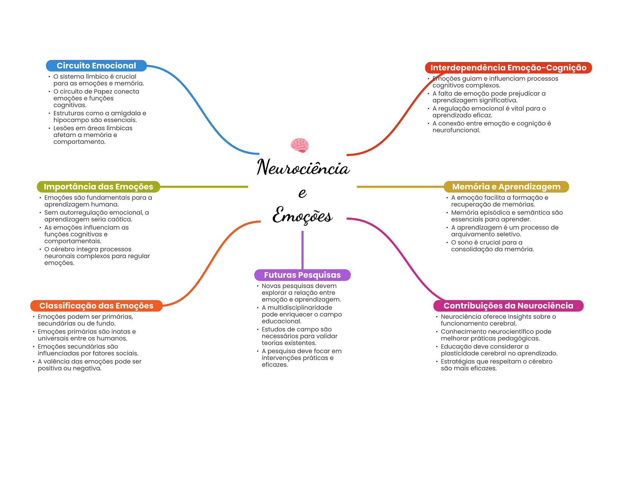 Circuito Emocional Interdependência Emoção-Cognição sistema límbico é crucial Emoções guiam e influenciam processos para as emoções e memória. cognitivos complexos. circuito de Papez conecta A falta de emoção pode prejudicar a emoções e funções aprendizagem significativa. cognitivas. A regulação emocional é vital para Estruturas como a amígdala e aprendizado eficaz. hipocampo são essenciais. A conexão entre emoção e cognição é Lesões em áreas límbicas neurofuncional. afetam a memória e comportamento. Neurociência Importância das Emoções Memória e Aprendizagem Emoções são fundamentais para a e A emoção facilita a formação e aprendizagem humana. recuperação de memórias. Sem autorregulação emocional, a Emoções Memória episódica e semântica são aprendizagem seria caótica. essenciais para aprender. As emoções influenciam as A aprendizagem é um processo de funções cognitivas e arquivamento seletivo. comportamentais. sono é crucial para a cérebro integra processos consolidação da memória. neuronais complexos para regular emoções. Futuras Pesquisas Novas pesquisas devem explorar a relação entre emoção e aprendizagem. Classificação das Emoções A multidisciplinaridade Contribuições da Neurociência Emoções podem ser primárias, pode enriquecer campo Neurociência oferece insights sobre secundárias ou de fundo. educacional. funcionamento cerebral. Emoções primárias são inatas e Estudos de campo são Conhecimento neurocientífico pode universais entre OS humanos. necessários para validar melhorar práticas pedagógicas. teorias existentes. Emoções secundárias são Educação deve considerar a influenciadas por fatores sociais. A pesquisa deve focar em plasticidade cerebral no aprendizado. A valência das emoções pode ser intervenções práticas e eficazes. Estratégias que respeitam O cérebro positiva ou negativa. são mais eficazes.