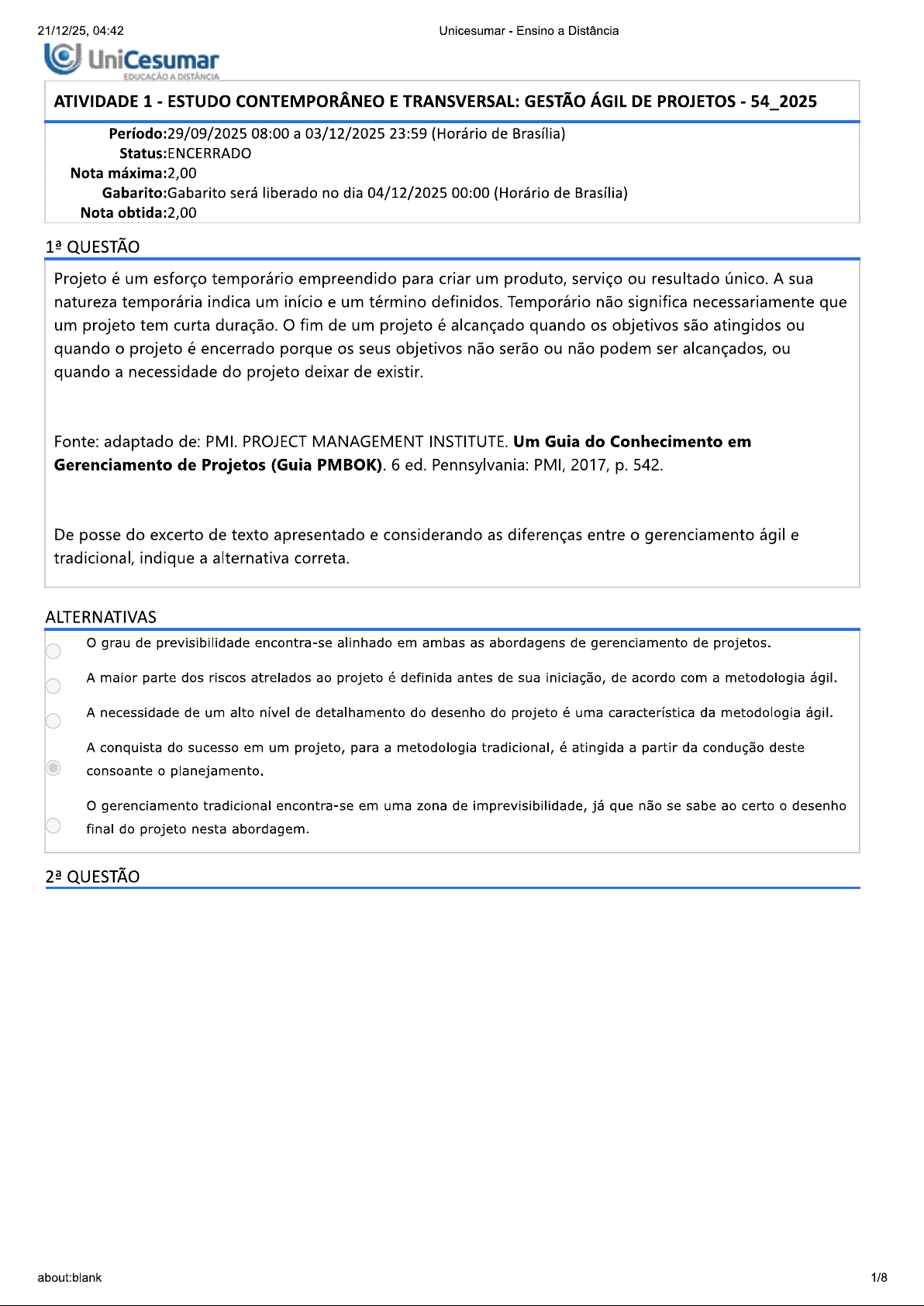 21/12/25, 04:42 Unicesumar Ensino a Distância UniCesumar EDUCAÇÃO A ATIVIDADE 1 ESTUDO CONTEMPORÂNEO E TRANSVERSAL: GESTÃO ÁGIL DE PROJETOS 54_2025 Período:29/09/2025 08:00 a 03/12/2025 23:59 (Horário de Brasília) Status:ENCERRADO Nota máxima:2,00 Gabarito:Gabarito será liberado no dia 04/12/2025 00:00 (Horário de Brasília) Nota obtida:2,00 QUESTÃO Projeto é um esforço temporário empreendido para criar um produto, serviço ou resultado único. A sua natureza temporária indica um início e um término definidos. Temporário não significa necessariamente que um projeto tem curta duração. O fim de um projeto é alcançado quando os objetivos são atingidos ou quando o projeto é encerrado porque os seus objetivos não serão ou não podem ser alcançados, ou quando a necessidade do projeto deixar de existir. Fonte: adaptado de: PMI. PROJECT MANAGEMENT INSTITUTE. Um Guia do Conhecimento em Gerenciamento de Projetos (Guia 6 ed. Pennsylvania: PMI, 2017, p. 542. De posse do excerto de texto apresentado e considerando as diferenças entre o gerenciamento ágil e tradicional, indique a alternativa correta. ALTERNATIVAS grau de previsibilidade encontra-se alinhado em ambas as abordagens de gerenciamento de projetos. A maior parte dos riscos atrelados ao projeto é definida antes de sua iniciação, de acordo com a metodologia ágil. A necessidade de um alto nível de detalhamento do desenho do projeto é uma característica da metodologia ágil. A conquista do sucesso em um projeto, para a metodologia tradicional, é atingida a partir da condução deste consoante o planejamento. gerenciamento tradicional encontra-se em uma zona de imprevisibilidade, já que não se sabe ao certo o desenho final do projeto nesta abordagem. QUESTÃO about:blank 1/821/12/25, 04:42 Unicesumar Ensino a Distância O termo Gerenciamento Ágil de Projetos (APM) difundiu-se em 2001 devido a um movimento iniciado pela comunidade internacional de desenvolvimento de sistemas de informação. Seus autores preconizaram que era preciso um novo enfoque de desenvolvimento de software, calcado na "agilidade", na "flexibilidade", nas habilidades de comunicação e na capacidade de oferecer novos produtos e serviços de valor ao mercado em curtos períodos." Fonte: adaptado de: AMARAL, D. et al. Gerenciamento ágil de projetos: aplicação em produtos inovadores. Edição. São Paulo: Saraiva, 2011, p. 8-9. Com base nas informações apresentadas, avalie as asserções a seguir e a relação proposta entre elas: I. Os requisitos do projeto podem sofrer alterações constantemente. PORQUE II. As mudanças são intrínsecas ao desenvolvimento de projetos ágeis. A respeito dessas asserções, assinale a opção correta: ALTERNATIVAS As asserções I e II são verdadeiras, e a II é uma justificativa correta da I. As asserções I e II são verdadeiras, mas a II não é uma justificativa correta da I. A asserção I é uma proposição verdadeira e a II é uma proposição falsa. A asserção I é uma proposição falsa e a II é uma proposição verdadeira. As asserções I e II são falsas. QUESTÃO Paulo, gestor de uma empresa de desenvolvimento de softwares, deseja aumentar o engajamento entre os membros de sua equipe e ofertar transparência a seus clientes. Deste modo, está buscando por ferramentas eletrônicas para métodos ágeis, como Trello e Jira. A partir do exposto e considerando as funcionalidades dessas ferramentas eletrônicas de métodos ágeis citadas, indique a alternativa correta. ALTERNATIVAS Jira oferece um suporte bastante completo. A velocidade e o processamento do Trello é maior que o Jira. Trello e Jira são ferramentas utilizadas em prol de estimar os custos do projeto. Trello é uma ferramenta eletrônica para métodos ágeis mais robusta que a ferramenta Jira. A ferramenta eletrônica Trello possui, além da versão gratuita, outras versões, diferente do Jira, que possui apenas a gratuita. QUESTÃO about:blank 2/821/12/25, 04:42 Unicesumar Ensino a Distância O Scrum é um framework para desenvolver e manter produtos complexos que também pode ser utilizado no gerenciamento ágil de projetos que também se destinam à criação de produtos. Scrum, apesar de muito difundido e utilizado na área de desenvolvimento de software, pode muito bem ser utilizado no desenvolvimento de qualquer produto complexo, principalmente pela sua característica de ser um framework iterativo e incremental. É muito efetivo na transferência de conhecimento de forma iterativa e incremental, por isso, está cada vez mais sendo utilizado para produtos, serviços e no gerenciamento da própria empresa. CRUZ, F. Scrum e Agile em Projetos. Edição. Rio de Janeiro: Editora Brasport, 2018. p. 52. A partir do excerto de texto apresentado e considerando as particularidades do Scrum, analise a veracidade das afirmativas a seguir: I. As reuniões diárias são chamadas de Sprint. II. As reuniões são realizadas no final do período de trabalho. III. Product Owner é responsável por definir o que irá integrar o Product Backlog. IV. As listas de ações do Sprint agrupam as funções necessárias para um determinado produto. É correto o que se afirma em: ALTERNATIVAS I, apenas. II e IV, apenas. III e IV, apenas. I, II e III, apenas. I, II, III e IV. QUESTÃO about:blank 3/821/12/25, 04:42 Unicesumar Ensino a Distância Jira e Trello são dois softwares de gerenciamento de projetos da Atlassian que se integram dinamicamente para que você e sua equipe possam trabalhar juntos, executar projetos e manter a transparência com a liderança ou qualquer outra equipe que precise estar atualizada. MESH, J. Como usar Trello e Jira integrados para gerenciar projetos. 2020. Disponível em: https://bit.ly/3XIcLRQ. Acesso em: 1° dez. 2022. Com base nas informações apresentadas, avalie as asserções a seguir e a relação proposta entre elas: I. Trello é uma ferramenta eletrônica para métodos ágeis mais robusta que a fer