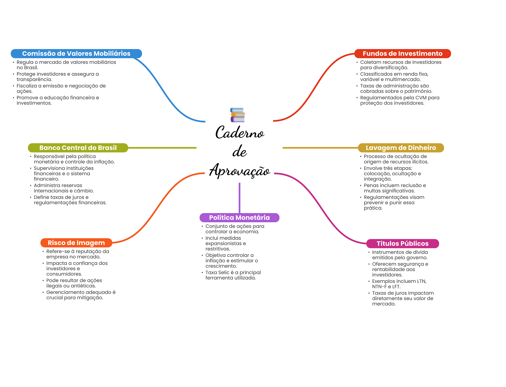 Comissão de Valores Mobiliários Fundos de Investimento Regula mercado de valores mobiliários Coletam recursos de investidores no Brasil. para diversificação. Protege investidores e assegura a Classificados em renda fixa, transparência. variável e multimercado. Fiscaliza a emissão e negociação de Taxas de administração são ações. cobradas sobre patrimônio. Promove a educação financeira e Regulamentados pela CVM para investimentos. proteção dos investidores. Caderno Banco Central do Brasil de Lavagem de Dinheiro Responsável pela política Processo de ocultação de monetária e controle da inflação. origem de recursos ilícitos. Supervisiona instituições Aprovação Envolve três etapas: financeiras e sistema colocação, ocultação e financeiro. integração. Administra reservas Penas incluem reclusão e internacionais e câmbio. multas significativas. Define taxas de juros e Regulamentações visam regulamentações financeiras. prevenir e punir essa prática. Política Monetária Conjunto de ações para controlar a economia. Inclui medidas Risco de Imagem expansionistas e Títulos Públicos restritivas. Refere-se à reputação da Instrumentos de dívida empresa no mercado. Objetiva controlar a emitidos pelo governo. Impacta a confiança dos inflação e estimular crescimento. Oferecem segurança e investidores e rentabilidade aos consumidores. Taxa Selic é a principal investidores. ferramenta utilizada. Pode resultar de ações Exemplos incluem LTN, ilegais ou antiéticas. NTN-F e LFT. Gerenciamento adequado é Taxas de juros impactam crucial para mitigação. diretamente seu valor de mercado.