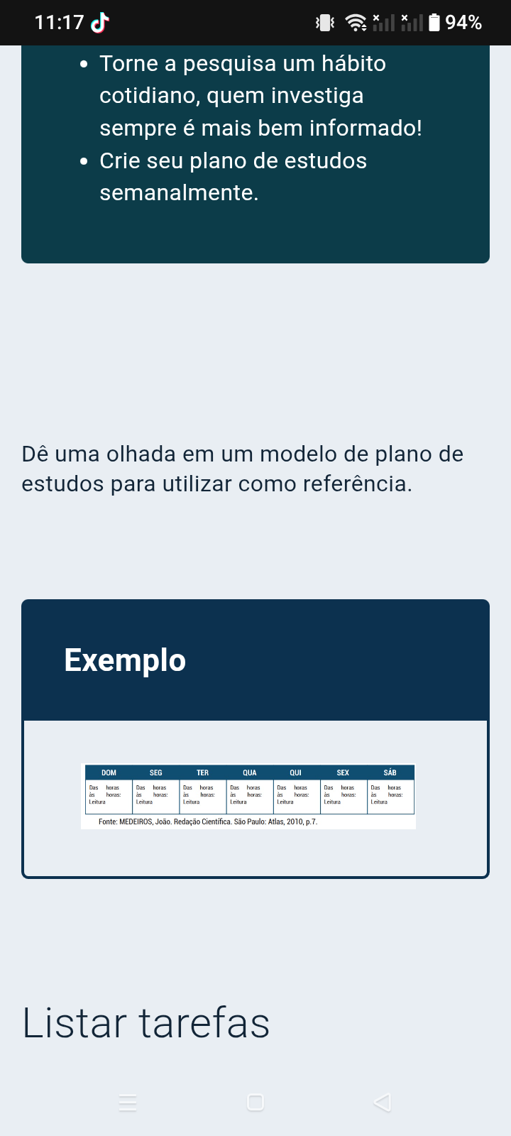 11:17 94% Torne a pesquisa um hábito cotidiano, quem investiga sempre é mais bem informado! Crie seu plano de estudos semanalmente. Dê uma olhada em um modelo de plano de estudos para utilizar como referência. Exemplo DOM SEG TER QUA QUI SEX SAB Das horas Das heras Das Das horas Das horas Das horas Das heras horas: as as horas: horas: Leitura Leitura Leitura Leitura Leitura Leitura Leitura Fonte: MEDEIROS, João. Redação São Paulo: Atlas, 2010, p.7. Listar tarefas