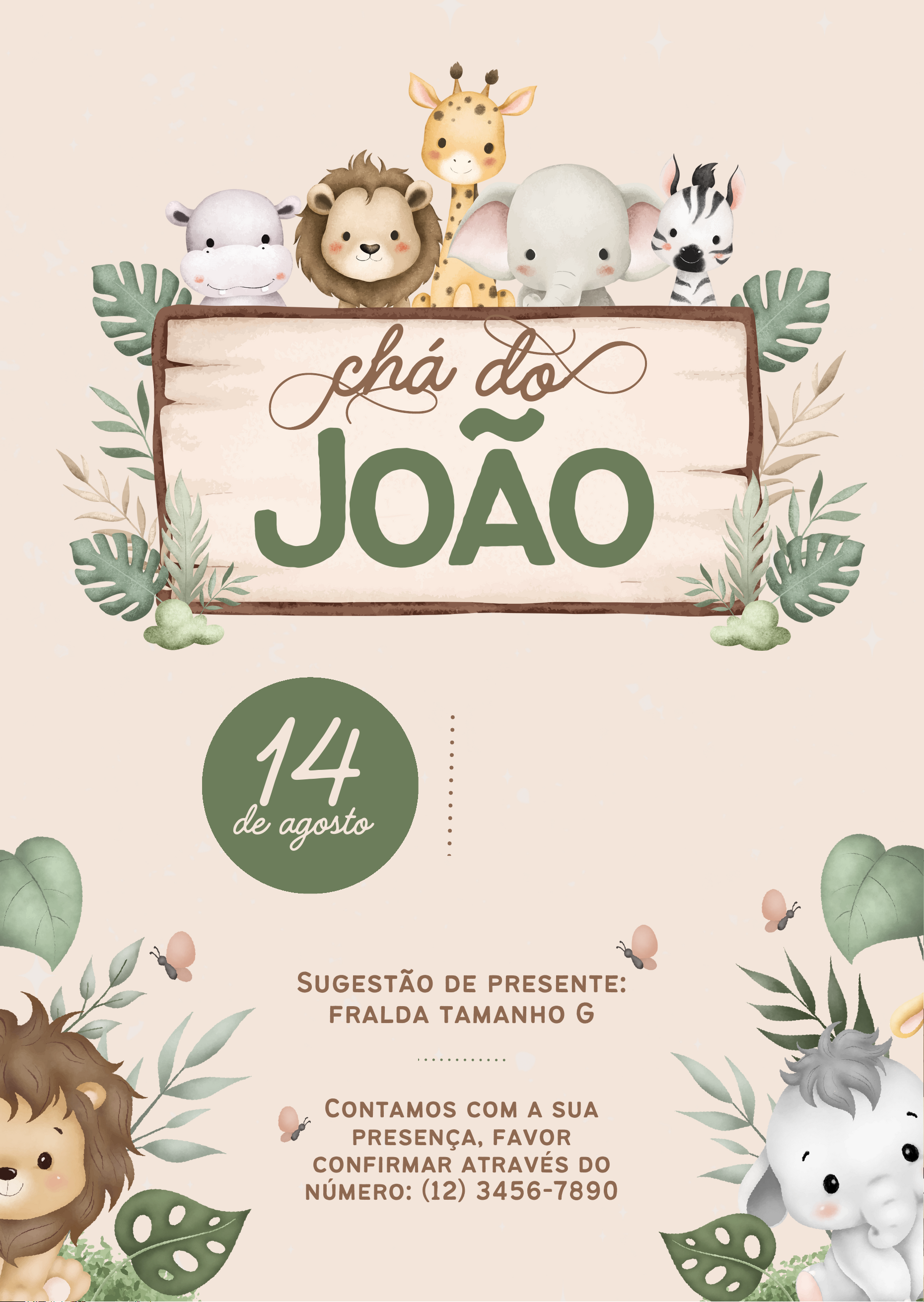 João chá do 14de agosto Ás 15 horas Na casa da vovó Sugestão de presente: fralda tamanho G Contamos com a sua presença, favor confirmar através do número: (12) 3456-7890