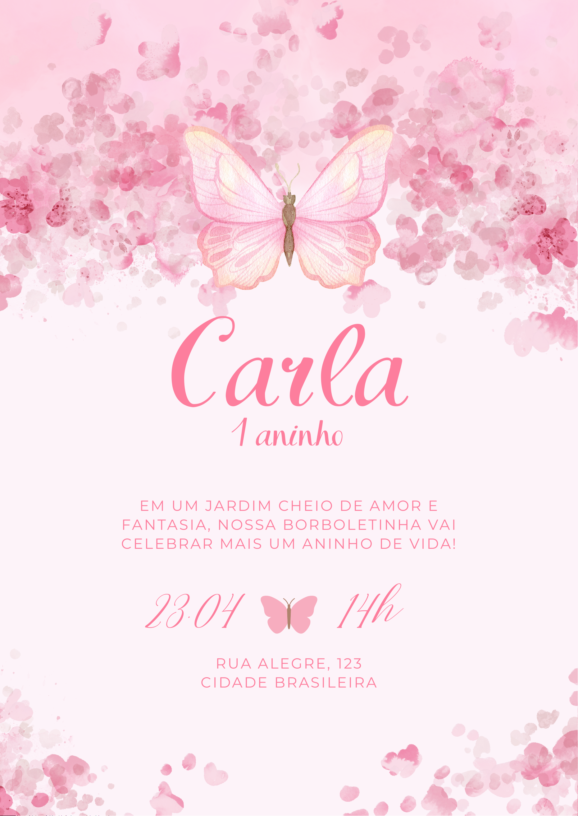 Carla 1 aninho 23 .04 14h RUA ALEGRE, 123 CIDADE BRASILEIRA EM UM JARDIM CHEIO DE AMOR E FANTASIA, NOSSA BORBOLETINHA VAI CELEBRAR MAIS UM ANINHO DE VIDA!