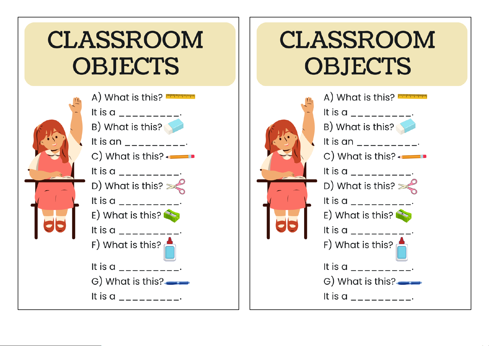 CLASSROOM CLASSROOM OBJECTS OBJECTS A) What is this? A) What is this? It is a It is a B) What is this? B) What is this? It is an It is an c) What is this? c) What is this? It is a It is a D) What is this? D) What is this? It is a It is a E) What is this? E) What is this? It is a It is a F) What is this? F) What is this? It is a It is a G) What is this? G) What is this? It is a It is aSCHOOL SUPPLIES SCHOOL SUPPLIES (MATERIAIS ESCOLARES) (MATERIAIS ESCOLARES) Associe as palavras em inglês às imagens. Associe as palavras em inglês às imagens. pen schoolbag pencil sharpener ruler book pen schoolbag pencil sharpener ruler book notebook stapler eraser scissors glue pencil case notebook stapler eraser scissors glue pencil case GLUE GLUE