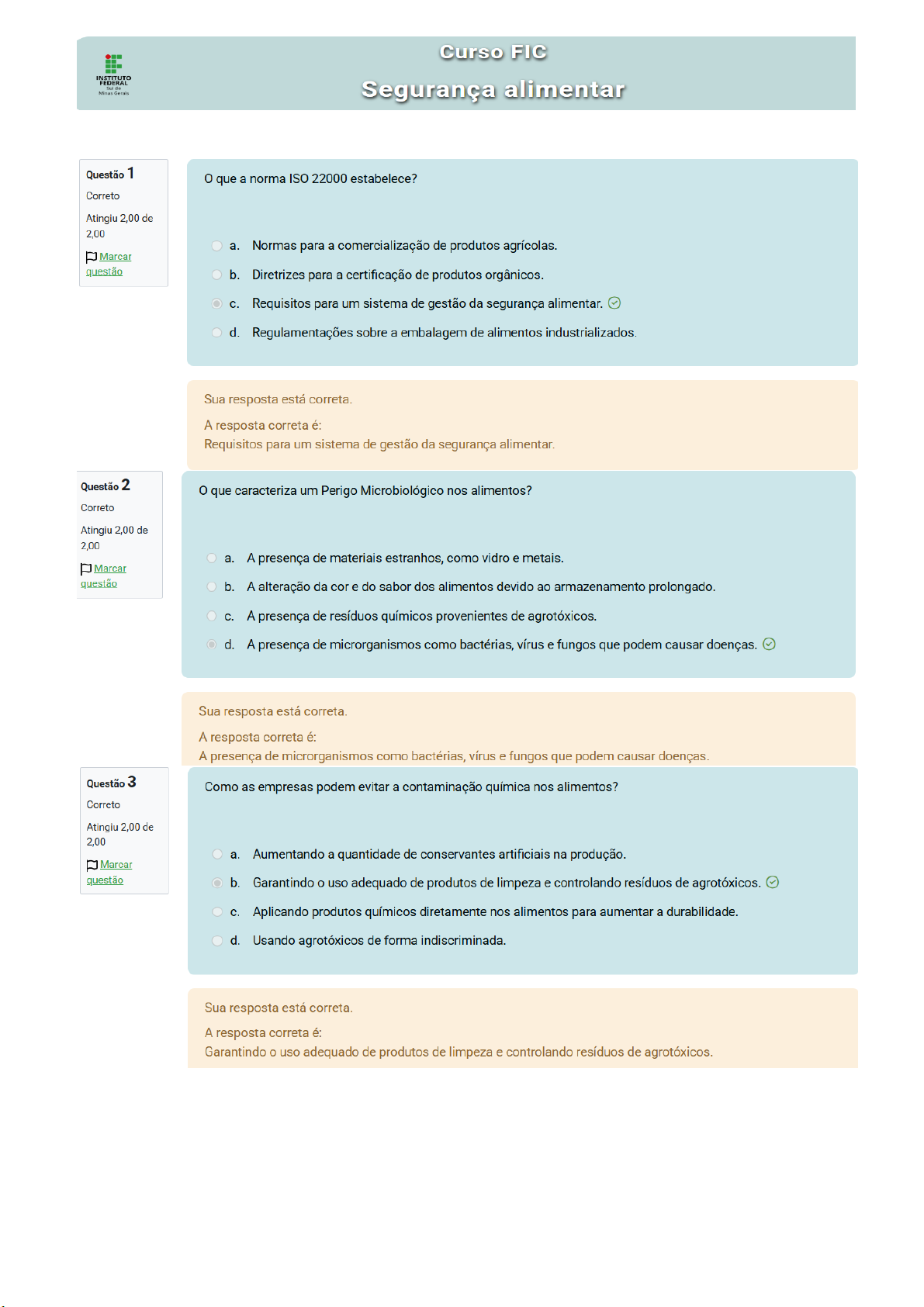 Curso FIC INSTITUTO FEDERAL Minas Gerais Segurança alimentar Questão 1 que a norma ISO 22000 estabelece? Correto Atingiu 2,00 de 2,00 a. Normas para a comercialização de produtos agrícolas. Marcar b. Diretrizes para a certificação de produtos orgânicos. Requisitos para um sistema de gestão da segurança alimentar. d. Regulamentações sobre a embalagem de alimentos industrializados. Sua resposta está correta. A resposta correta é: Requisitos para um sistema de gestão da segurança alimentar. Questão 2 que caracteriza um Perigo Microbiológico nos alimentos? Correto Atingiu 2,00 de 2,00 a. A presença de materiais estranhos, como vidro e metais. Marcar questão b. A alteração da cor e do sabor dos alimentos devido ao armazenamento prolongado. A presença de resíduos químicos provenientes de agrotóxicos. d. A presença de microrganismos como bactérias, vírus e fungos que podem causar doenças. Sua resposta está correta. A resposta correta é: A presença de microrganismos como bactérias, vírus e fungos que podem causar doenças. Questão 3 Como as empresas podem evitar a contaminação química nos alimentos? Correto Atingiu 2,00 de 2,00 a. Aumentando a quantidade de conservantes artificiais na produção. Marcar b. Garantindo o uso adequado de produtos de limpeza e controlando resíduos de agrotóxicos. Aplicando produtos químicos diretamente nos alimentos para aumentar a durabilidade. d. Usando agrotóxicos de forma indiscriminada. Sua resposta está correta. A resposta correta é: Garantindo uso adequado de produtos de limpeza e controlando resíduos de agrotóxicos.Questão 4 Qual das alternativas NÃO é um benefício da certificação ISO 9000? Correto Atingiu 2,00 de 2,00 a. Aumento da padronização dos processos. Marcar questão b. Redução de falhas e desperdícios. Garantia da segurança alimentar sem necessidade de outras normas complementares. d. Maior credibilidade no mercado. Sua resposta está correta. A resposta correta é: Garantia da segurança alimentar sem necessidade de outras normas complementares. Questão 5 As Boas Práticas de Fabricação (BPF) são importantes porque: Correto Atingiu 2,00 de 2,00 a. Auxiliam na segurança alimentar ao prevenir contaminações físicas, químicas e microbiológicas. Marcar questão b. Eliminam completamente qualquer tipo de contaminação em alimentos processados. Substituem completamente a necessidade de certificações como a ISO 22000. d. Reduzem os custos de produção sem impactar a segurança dos alimentos. Sua resposta está correta. A resposta correta é: Auxiliam na segurança alimentar ao prevenir contaminações físicas, químicas e microbiológicas. Questão 6 Os perigos físicos nos alimentos incluem: Correto Atingiu 2,00 de 2,00 a. Resíduos de produtos de limpeza. Marcar b. Fragmentos de vidro, metais e plásticos. Resíduos de agrotóxicos. d. Microrganismos como bactérias e vírus. Sua resposta está correta. A resposta correta é: Fragmentos de vidro, metais e plásticos.Questão 7 Qual das alternativas a seguir NÃO é uma etapa do APPCC? Correto Atingiu 2,00 de 2,00 Marcar questão a. Identificação dos perigos. b. Adoção de novos ingredientes para melhorar o sabor dos alimentos. Monitoramento dos pontos críticos de controle e aplicação de ações corretivas. d. Definição dos pontos críticos de controle. Sua resposta está correta. A resposta correta é: Adoção de novos ingredientes para melhorar sabor dos alimentos. Questão 8 que é segurança alimentar? Correto Atingiu 2,00 de 2,00 a. Um sistema para reduzir desperdício de alimentos nas indústrias. Marcar questão b. Um conjunto de práticas para aumentar a produtividade agrícola. Um conjunto de normas que garantem a qualidade estética dos alimentos. d. Um conjunto de práticas, normas e sistemas que garantem que os alimentos não representem riscos à saúde dos consumidores. Sua resposta está correta. A resposta correta é: Um conjunto de práticas, normas e sistemas que garantem que os alimentos não representem riscos à saúde dos consumidores.Questão 9 Qual das alternativas NÃO é um dos principais desafios enfrentados pelas empresas para garantir a segurança Correto dos alimentos? Atingiu 2,00 de 2,00 Marcar questão a. Contaminação microbiológica. b. Mudanças nas normas regulatórias. Controle de matérias-primas. d. Controle de embalagens plásticas. Sua resposta está correta. A resposta correta é: Controle de embalagens plásticas. Questão 10 que é APPCC (Análise de Perigos e Pontos Críticos de Controle)? Correto Atingiu 2,00 de 2,00 a. Um programa de incentivo fiscal para empresas que seguem normas sanitárias. Marcar b. m sistema de controle de qualidade que analisa apenas os processos de embalagem de alimentos. Um sistema preventivo que identifica e controla perigos físicos, químicos e microbiológicos na produção de alimentos. d. Um regulamento que define os preços dos alimentos no mercado. Sua resposta está correta. A resposta correta é: Um sistema preventivo que identifica e controla perigos físicos, químicos e microbiológicos na produção de alimentos.