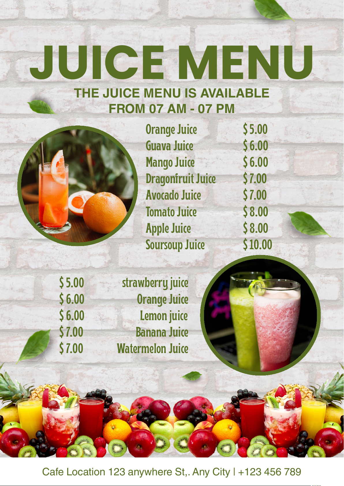 JUICE MENU $ 5.00 $ 6.00 $ 6.00 $ 7.00 $ 7.00 $ 8.00 $ 8.00 $ 10.00 Orange Juice Guava Juice Mango Juice Dragonfruit Juice Avocado Juice Tomato Juice Apple Juice Soursoup Juice Cafe Location 123 anywhere St,. Any City | +123 456 789 strawberry juice Orange Juice Lemon juice Banana Juice Watermelon Juice $ 5.00 $ 6.00 $ 6.00 $ 7.00 $ 7.00 THE JUICE MENU IS AVAILABLE FROM 07 AM - 07 PM