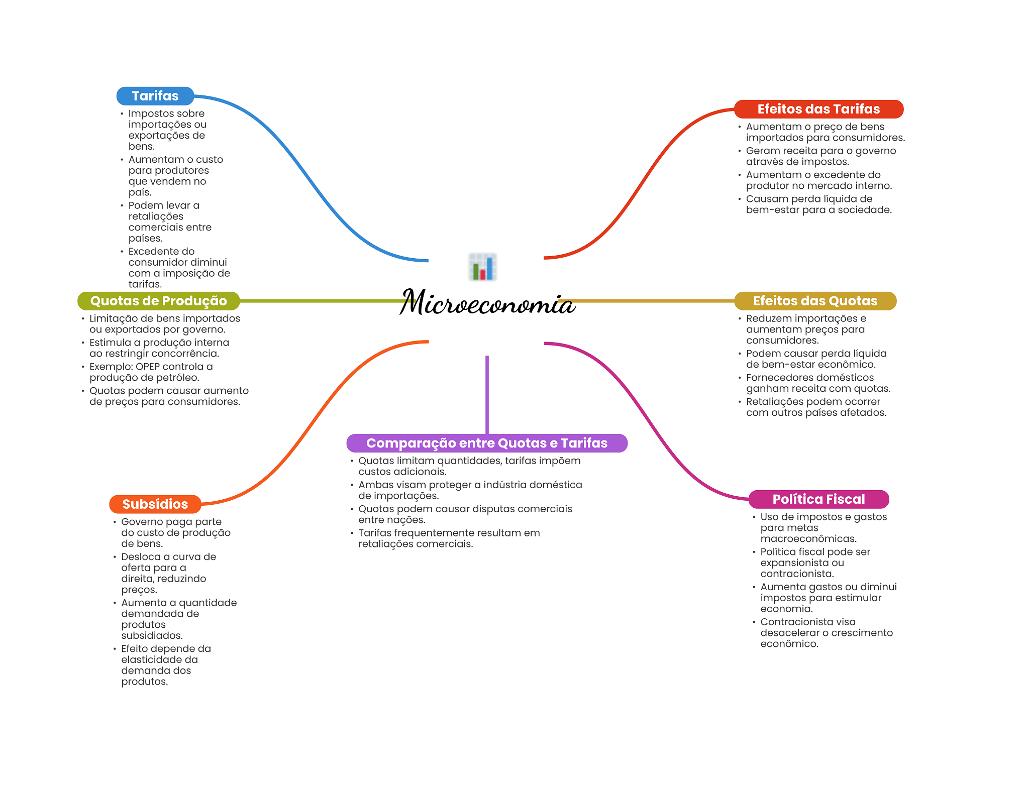 Tarifas Impostos sobre Efeitos das Tarifas importações ou Aumentam preço de bens exportações de importados para consumidores. bens. Geram receita para governo Aumentam custo através de impostos. para produtores Aumentam excedente do que vendem no produtor no mercado interno. país. Causam perda líquida de Podem levar a bem-estar para a sociedade. retaliações comerciais entre países. Excedente do consumidor diminui com a imposição de tarifas. Quotas de Produção Microeconomia Efeitos das Quotas Limitação de bens importados Reduzem importações e ou exportados por governo. aumentam preços para Estimula a produção interna consumidores. ao restringir concorrência. Podem causar perda líquida Exemplo: OPEP controla a de bem-estar econômico. produção de petróleo. Fornecedores domésticos Quotas podem causar aumento ganham receita com quotas. de preços para consumidores. Retaliações podem ocorrer com outros países afetados. Comparação entre Quotas e Tarifas Quotas limitam quantidades, tarifas impõem custos adicionais. Ambas visam proteger a indústria doméstica de importações. Subsídios Política Fiscal Quotas podem causar disputas comerciais Governo paga parte entre nações. Uso de impostos e gastos do custo de produção Tarifas frequentemente resultam em para metas macroeconômicas de bens. retaliações comerciais. Desloca a curva de Política fiscal pode ser oferta para a expansionista ou contracionista. direita, reduzindo preços. Aumenta gastos ou diminui Aumenta a quantidade impostos para estimular economia. demandada de produtos Contracionista visa subsidiados. desacelerar O crescimento econômico. Efeito depende da elasticidade da demanda dos produtos.