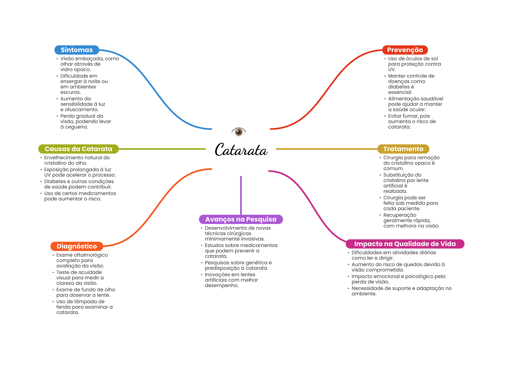 Sintomas Prevenção Visão embaçada, como Uso de óculos de sol olhar através de para proteção contra vidro opaco. UV. Dificuldade em Manter controle de enxergar à noite ou doenças como em ambientes diabetes é escuros. essencial. Aumento da Alimentação saudável sensibilidade à luz pode ajudar a manter e ofuscamento. a saúde ocular. Perda gradual da Evitar fumar, pois visão, podendo levar aumenta risco de à cegueira. catarata. Causas da Catarata Catarata Tratamento Envelhecimento natural do Cirurgia para remoção cristalino do olho. do cristalino opaco é Exposição prolongada à luz comum. UV pode acelerar processo. Substituição do Diabetes e outras condições cristalino por lente de saúde podem contribuir. artificial é Uso de certos medicamentos realizada. pode aumentar risco. Cirurgia pode ser feita sob medida para cada paciente. Recuperação Avanços na Pesquisa geralmente rápida, Desenvolvimento de novas com melhora na visão. técnicas cirúrgicas minimamente invasivas. Diagnóstico Estudos sobre medicamentos Impacto na Qualidade de Vida que podem prevenir a Dificuldades em atividades diárias Exame oftalmológico catarata. completo para como ler e dirigir. Pesquisas sobre genética e avaliação da visão. Aumento do risco de quedas devido à predisposição à catarata. Teste de acuidade visão comprometida. Inovações em lentes visual para medir a Impacto emocional e psicológico pela artificiais com melhor clareza da visão. perda de visão. desempenho. Exame de fundo de olho Necessidade de suporte e adaptação no para observar a lente. ambiente. Uso de lâmpada de fenda para examinar a catarata.