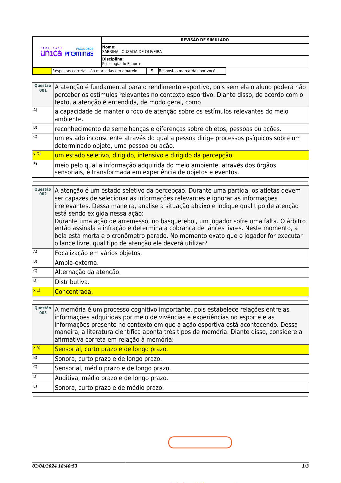 Impresso por sara queiroz, E-mail nadialuzcardoso@gmail.com para uso pessoal e privado. Este material pode ser protegido por direitos autorais e não pode ser reproduzido ou repassado para terceiros. 22/12/2025, 19:02:16 02/04/2024 18:40:53 1/3 REVISÃO DE SIMULADO Nome: SABRINA LOUZADA DE OLIVEIRA Disciplina: Psicologia do Esporte Respostas corretas são marcadas em amarelo Respostas marcardas por você.X Questão 001 A atenção é fundamental para o rendimento esportivo, pois sem ela o aluno poderá não perceber os estímulos relevantes no contexto esportivo. Diante disso, de acordo com o texto, a atenção é entendida, de modo geral, como A) a capacidade de manter o foco de atenção sobre os estímulos relevantes do meio ambiente. B) reconhecimento de semelhanças e diferenças sobre objetos, pessoas ou ações. C) um estado inconsciente através do qual a pessoa dirige processos psíquicos sobre um determinado objeto, uma pessoa ou ação. X D) um estado seletivo, dirigido, intensivo e dirigido da percepção. E) meio pelo qual a informação adquirida do meio ambiente, através dos órgãos sensoriais, é transformada em experiência de objetos e eventos. Questão 002 A atenção é um estado seletivo da percepção. Durante uma partida, os atletas devem ser capazes de selecionar as informações relevantes e ignorar as informações irrelevantes. Dessa maneira, analise a situação abaixo e indique qual tipo de atenção está sendo exigida nessa ação: Durante uma ação de arremesso, no basquetebol, um jogador sofre uma falta. O árbitro então assinala a infração e determina a cobrança de lances livres. Neste momento, a bola está morta e o cronômetro parado. No momento exato que o jogador for executar o lance livre, qual tipo de atenção ele deverá utilizar? A) Focalização em vários objetos. B) Ampla-externa. C) Alternação da atenção. D) Distributiva. X E) Concentrada. Questão 003 A memória é um processo cognitivo importante, pois estabelece relações entre as informações adquiridas por meio de vivências e experiências no esporte e as informações presente no contexto em que a ação esportiva está acontecendo. Dessa maneira, a literatura científica aponta três tipos de memória. Diante disso, considere a afirmativa correta em relação à memória: X A) Sensorial, curto prazo e de longo prazo. B) Sonora, curto prazo e de longo prazo. C) Sensorial, médio prazo e de longo prazo. D) Auditiva, médio prazo e de longo prazo. E) Sonora, curto prazo e de médio prazo. Acesso vitalício + 1 ano de benefícios! Aproveitar oferta Impresso por sara queiroz, E-mail nadialuzcardoso@gmail.com para uso pessoal e privado. Este material pode ser protegido por direitos autorais e não pode ser reproduzido ou repassado para terceiros. 22/12/2025, 19:02:16 02/04/2024 18:40:53 2/3 Questão 004 A memória diz respeito ao processo de armazenamento e recuperação de informações. Estes autores sugerem que a memória não deve ser considerada como um armazém de informações, mas uma riquíssima fonte de operações e acontecimentos. Estas operações e acontecimentos estão relacionadas com aspecto: A memória diz respeito ao processo de armazenamento e recuperação de informações. Estes autores sugerem que a memória não deve ser considerada como um armazém de informações, mas uma riquíssima fonte de operações e acontecimentos. Estas operações e acontecimentos estão relacionadas com aspecto: A) Auditiva, médio prazo e de longo prazo. B) Sensorial, médio prazo e de longo prazo. C) Sonora, curto prazo e de longo prazo. X D) Sensorial, curto prazo e de longo prazo. E) Sonora, curto prazo e de médio prazo. Questão 005 A percepção ocorre através dos sentidos. Dentre eles, um se destaca dentre os processos sensoriais, pois é o responsável por cerca de 80 a 90% das informações extraídas do ambiente, no contexto dos esportes coletivos. Diante disso, qual sentido é responsável por essa extração de informações do ambiente? A) Olfato. B) Audição. C) Paladar. D) Tato. X E) Visão. Questão 006 (FUNARTE – 2014) Segundo Samulski, as percepções são processos presentes em todas as fases da ação esportiva, contribuindo para determinar as mudanças de velocidade, de espaço e de movimentos do corpo inteiro ou de parte dele, da posição do adversário, da forma de controle do equipamento, etc. O mesmo autor, baseando-se em Neumaier, afirma que a percepção (particularmente a visual) nos esportes deve cumprir quatro tarefas: A) controle da expectativa; assimilação das informações provenientes do meio ambiente; antecipação do movimento externo; avaliação do movimento. X B) formação de uma base para orientação; controle visual do próprio movimento; antecipação do movimento externo; avaliação do movimento. C) controle da expectativa; percepção de informações relevantes; antecipação da execução do movimento; percepção do estado psíquico do adversário direto. D) percepção do estado psíquico do adversário direto; percepção dos pontos fracos do sistema defensivo; percepção da forma de apitar dos árbitros; percepção dos movimentos de superioridade ou inferioridade numérica de defesa. E) percepção do comportamento dos colegas; percepção do comportamento do adversário direto; percepção do comportamento do defensor próximo; percepção do comportamento da defesa perante a movimentação do ataque. Acesso vitalício + 1 ano de benefícios! Aproveitar oferta Impresso por sara queiroz, E-mail nadialuzcardoso@gmail.com para uso pessoal e privado. Este material pode ser protegido por direitos autorais e não pode ser reproduzido ou repassado para terceiros. 22/12/2025, 19:02:16 02/04/2024 18:40:53 3/3 Questão 007 Durante uma partida de qualquer modalidade esportiva, a atenção tem um papel importante, pois essas partidas têm como características vários estímulos que estão disponíveis no ambiente e, dessa