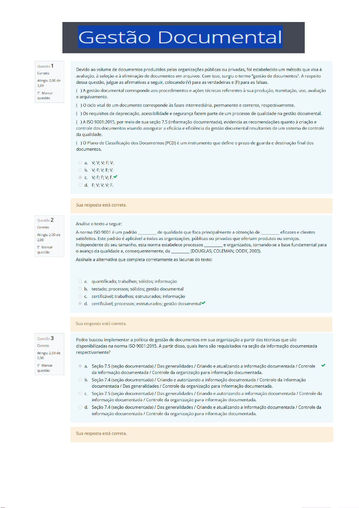 Gestão Documental Questão 1 Devido ao volume de documentos produzidos pelas organizações públicas ou privadas, foi estabelecido um método que visa à Correto avaliação, à seleção e à eliminação de documentos em arquivos. Com isso, surgiu o termo "gestão de documentos". A respeito Atingiu 2,00 de dessa questão, julgue as afirmativas a seguir, colocando (V) para as verdadeiras e (F) para as falsas. 2,00 A gestão documental corresponde aos procedimentos e ações técnicas referentes à sua produção, tramitação, uso, avaliação P Marcar questão e arquivamento. ciclo vital de um documento corresponde às fases intermediária, permanente e corrente, respectivamente. Os requisitos de depreciação, acessibilidade e segurança fazem parte de um processo de qualidade na gestão documental. A ISO 9001:2015, por meio de sua seção 7.5 (informação documentada), evidencia as recomendações quanto à criação e controle dos documentos visando assegurar a eficácia e eficiência da gestão documental resultantes de um sistema de controle da qualidade. Plano de Classificação dos Documentos (PCD) é um instrumento que define prazo de guarda e destinação final dos documentos. a. V;V;V;F;V. b. V;F;V;F;V. d. Sua resposta está correta. Questão 2 Analise o texto a seguir: Correto A norma ISO 9001 é um padrão de qualidade que foca principalmente a obtenção de eficazes e clientes Atingiu 2,00 de 2,00 satisfeitos. Este padrão é aplicável a todas as organizações, públicas ou privadas que ofertam produtos ou serviços. P Marcar Independente do seu tamanho, esta norma estabelece processos e organizados, tornando-se a base fundamental para questão avanço da qualidade e, consequentemente, da (DOUGLAS; COLEMAN; ODDY, 2003). Assinale a alternativa que completa corretamente as lacunas do texto: a. quantificado; trabalhos; sólidos; informação b. testado; processos; sólidos; gestão documental C. certificável; trabalhos; estruturados; informação d. certificável; processos; estruturados; gestão documental Sua resposta está correta. Questão 3 Pedro buscou implementar a política de gestão de documentos em sua organização a partir das técnicas que são Correto disponibilizadas na norma ISO 9001:2015. A partir disso, quais itens são requisitados na seção da informação documentada Atingiu 2,00 de respectivamente? 2,00 P Marcar a. Seção 7.5 (seção documentada) / Das generalidades / Criando e atualizando a informação documentada / Controle questão da informação documentada / Controle da organização para informação documentada. b. Seção 7.4 (seção documentada) / Criando e autorizando a informação documentada / Controle da informação documentada / Das generalidades / Controle da organização para informação documentada. C. Seção 7.5 (seção documentada) / Das generalidades / Criando e autorizando a informação documentada / Controle da informação documentada / Controle da organização para informação documentada. d. Seção 7.4 (seção documentada) / Das generalidades / Criando e atualizando a informação documentada / Controle da informação documentada / Controle da organização para informação documentada. Sua resposta está correta.Questão 4 Para a gestão documental, o sistema de gestão ambiental tem como finalidade orientar as organizações em relação à exclusão Incorreto dos documentos com consciência ao meio ambiente. A partir disso, assinale a alternativa correta em relação a este sistema. Atingiu 0,00 de 2,00 a. A ISO 9000 tem como finalidade para a gestão de documentos orientar as organizações em relação à exclusão dos P Marcar documentos com consciência ao meio ambiente, a partir da separação, organização, monitoramento e controle, questão optando-se pelo processo de reciclagem dos resíduos. b. A ISO 14001 tem como finalidade para a gestão de documentos orientar as organizações em relação à exclusão dos documentos com consciência ao meio ambiente, a partir da separação, organização, monitoramento e controle, optando-se pelo processo de reciclagem dos resíduos. C. A ISO 9001, por meio de sua seção 7.5 (informação documentada), tem como finalidade para a gestão de documentos orientar as organizações em relação à exclusão dos documentos com consciência ao meio ambiente, a partir da separação, organização, monitoramento e controle, optando-se pelo processo de reciclagem dos resíduos. d. A ISO 14001, por meio de sua seção 7.5 (informação documentada), tem como finalidade para a gestão de documentos, orientar as organizações em relação à exclusão dos documentos com consciência ao meio ambiente, a partir da separação, organização, monitoramento e controle, optando-se pelo processo de reciclagem dos resíduos. Sua resposta está incorreta. Questão 5 A interação entre os aspectos teórico, metodológico, legal e prático é essencial para um projeto de gestão documental eficiente e Correto que venha a se aperfeiçoar a partir da adoção tecnológica típica de um sistema de gestão da qualidade. Correlacione os aspectos Atingiu 2,00 de e assinale a alternativa correta. 2,00 P Marcar 1) Aspecto teórico Plano de Classificação e Tabela de Temporalidade questão 2) Aspecto metodológico Teoria das Três Idades 3) Aspecto legal Política de gestão de documentos 4) Aspecto prático Documento a. 1; 2; 3; 4. C. 4; 1; 2; 3. d. 2; 1; 4; Sua resposta está correta.