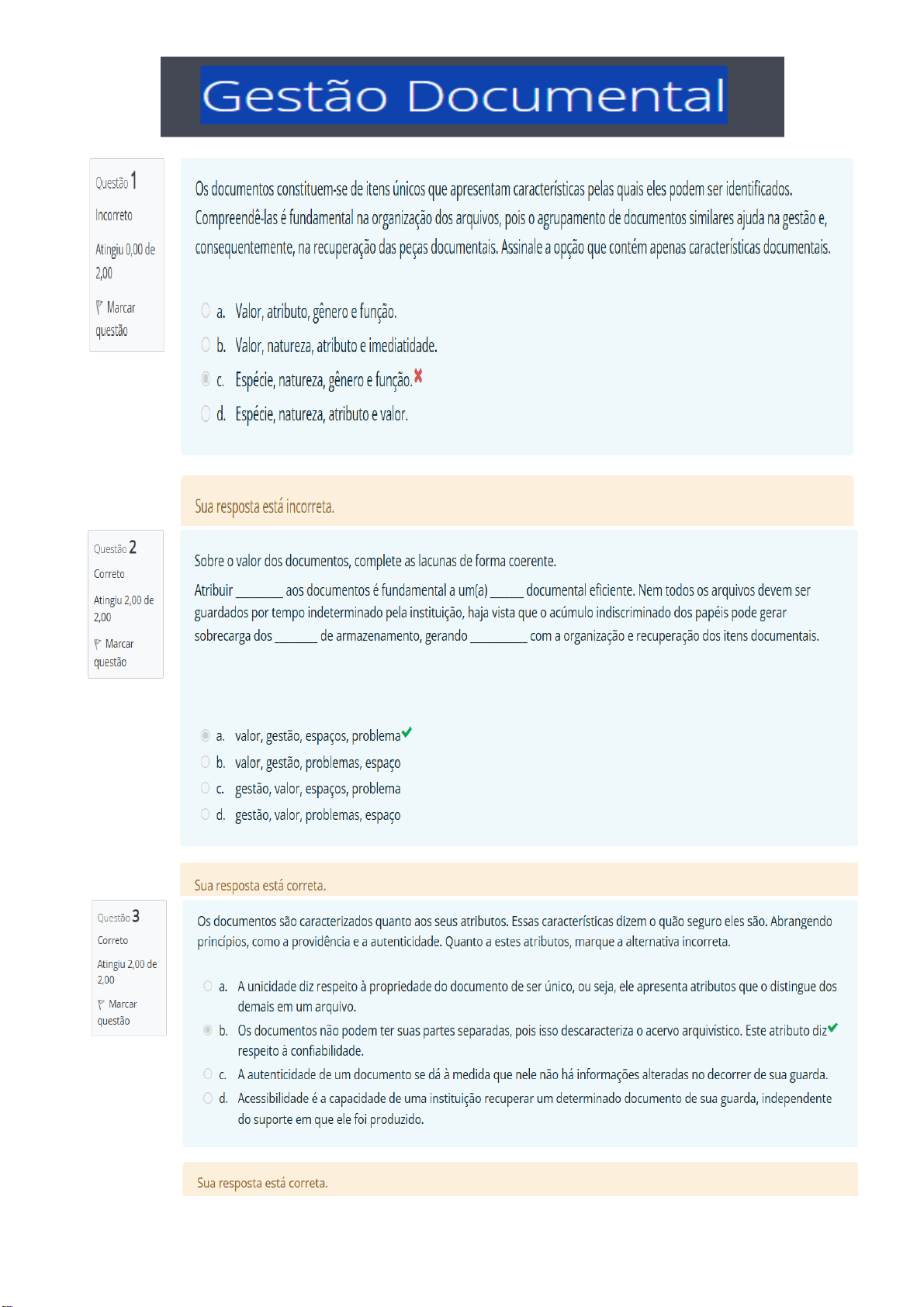 Gestão Documental Questão 1 Os documentos constituem-se de itens únicos que apresentam características pelas quais eles podem ser identificados. Incorreto Compreendê-las é fundamental na organização dos arquivos, pois 0 agrupamento de documentos similares ajuda na gestão e, Atingiu 0,00 de consequentemente, na recuperação das peças documentais. Assinale a opção que contém apenas características documentais. 2,00 P Marcar a. Valor, atributo, gênero e função. questão b. Valor, natureza, atributo e imediatidade. C. Espécie, natureza, gênero e função. d. Espécie, natureza, atributo e valor. Sua resposta está incorreta. Questão 2 Sobre valor dos documentos, complete as lacunas de forma coerente. Correto Atribuir aos documentos é fundamental a um(a) documental eficiente. Nem todos os arquivos devem ser Atingiu 2,00 de 2,00 guardados por tempo indeterminado pela instituição, haja vista que o acúmulo indiscriminado dos papéis pode gerar P Marcar sobrecarga dos de armazenamento, gerando com a organização e recuperação dos itens documentais. questão a. valor, gestão, espaços, problema b. valor, gestão, problemas, espaço C. gestão, valor, espaços, problema d. gestão, valor, problemas, espaço Sua resposta está correta. Questão 3 Os documentos são caracterizados quanto aos seus atributos. Essas características dizem o quão seguro eles são. Abrangendo Correto princípios, como a providência e a autenticidade. Quanto a estes atributos, marque a alternativa incorreta. Atingiu 2,00 de 2,00 a. A unicidade diz respeito à propriedade do documento de ser único, ou seja, ele apresenta atributos que o distingue dos P Marcar demais em um arquivo. questão b. Os documentos não podem ter suas partes separadas, pois isso descaracteriza acervo arquivístico. Este atributo diz respeito à confiabilidade. C. A autenticidade de um documento se dá à medida que nele não há informações alteradas no decorrer de sua guarda. d. Acessibilidade é a capacidade de uma instituição recuperar um determinado documento de sua guarda, independente do suporte em que ele foi produzido. Sua resposta está correta.Questão 4 Conforme 0 Dicionário Brasileiro de Terminologia Arquivística (BRASIL, 2005), 0 gênero documental caracteriza-se a partir da Correto identificação de suporte, formato e meios técnicos pelos quais eles podem ser agrupados. Marque abaixo a alternativa que Atingiu 2,00 de contém apenas gêneros documentais. 2,00 P Marcar a. Audiovisuais e mapográficos. questão b. Audiovisuais e eletromecânicos. C. Audiovisuais e biográficos. d. Audiovisuais e iconográficos. Sua resposta está correta. Questão 5 A classificação dos documentos quanto a sua natureza é regulamentada pela Lei n° 12.527, de 18 de novembro de 2011. Essa Correto legislação visa prevenir o vazamento de dados, pois a divulgação indevida dessas informações pode gerar prejuízos ao bom Atingiu 2,00 de funcionamento da instituição. Sobre a natureza dos documentos, marque (F) para falso e (V) para verdadeiro nas lacunas abaixo, 2,00 em seguida, assinale a opção correta. P Marcar questão Os documentos classificados com ostensivos não possuem informações de divulgação restrita; Os documentos classificados com sigilosos têm sua divulgação e guarda protegidos, pois se suas informações forem divulgadas podem gerar danos à instituição; Conforme a legislação brasileira, há alguns documentos que podem ser mantidos em sigilo indeterminadamente, se a instituição assim o desejar. a. b. C. d. Sua resposta está correta.