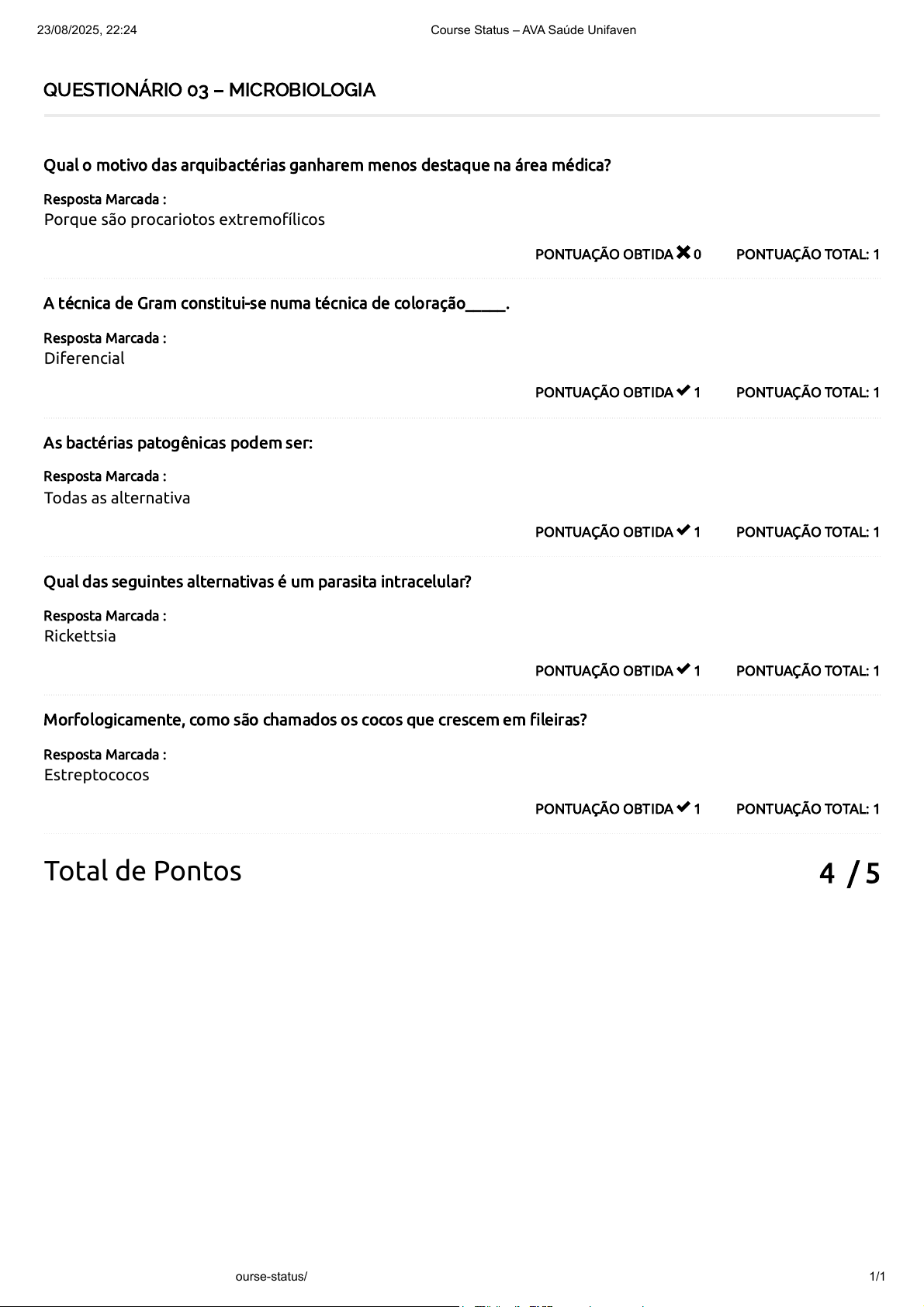 4 / 5 QUESTIONÁRIO 03 – MICROBIOLOGIA PONTUAÇÃO TOTAL: 1PONTUAÇÃO OBTIDA 0 Qual o motivo das arquibactérias ganharem menos destaque na área médica? Resposta Marcada : Porque são procariotos extremofílicos PONTUAÇÃO TOTAL: 1PONTUAÇÃO OBTIDA 1 A técnica de Gram constitui-se numa técnica de coloração_____. Resposta Marcada : Diferencial PONTUAÇÃO TOTAL: 1PONTUAÇÃO OBTIDA 1 As bactérias patogênicas podem ser: Resposta Marcada : Todas as alternativas PONTUAÇÃO TOTAL: 1PONTUAÇÃO OBTIDA 1 Qual das seguintes alternativas é um parasita intracelular? Resposta Marcada : Rickettsia PONTUAÇÃO TOTAL: 1PONTUAÇÃO OBTIDA 1 Morfologicamente, como são chamados os cocos que crescem em fileiras? Resposta Marcada : Estreptococos Total de Pontos 23/08/2025, 22:24 Course Status – AVA Saúde Unifaveni https://ava.saude.unifaveni.com.br/course-status/ 1/1