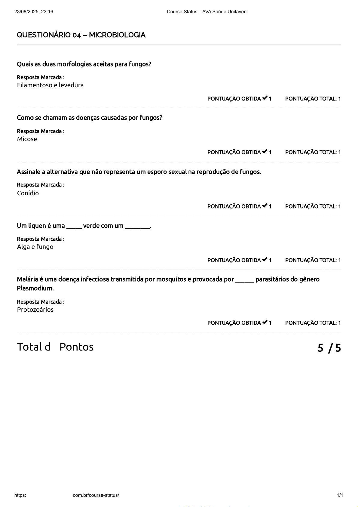 5 / 5 QUESTIONÁRIO 04 – MICROBIOLOGIA PONTUAÇÃO TOTAL: 1PONTUAÇÃO OBTIDA 1 Quais as duas morfologias aceitas para fungos? Resposta Marcada : Filamentoso e levedura PONTUAÇÃO TOTAL: 1PONTUAÇÃO OBTIDA 1 Como se chamam as doenças causadas por fungos? Resposta Marcada : Micose PONTUAÇÃO TOTAL: 1PONTUAÇÃO OBTIDA 1 Assinale a alternativa que não representa um esporo sexual na reprodução de fungos. Resposta Marcada : Conídio PONTUAÇÃO TOTAL: 1PONTUAÇÃO OBTIDA 1 Um liquen é uma _____ verde com um ________. Resposta Marcada : Alga e fungo PONTUAÇÃO TOTAL: 1PONTUAÇÃO OBTIDA 1 Malária é uma doença infecciosa transmitida por mosquitos e provocada por ______ parasitários do gênero Plasmodium. Resposta Marcada : Protozoários Total de Pontos 23/08/2025, 23:16 Course Status – AVA Saúde Unifaveni https://ava.saude.unifaveni.com.br/course-status/ 1/1
