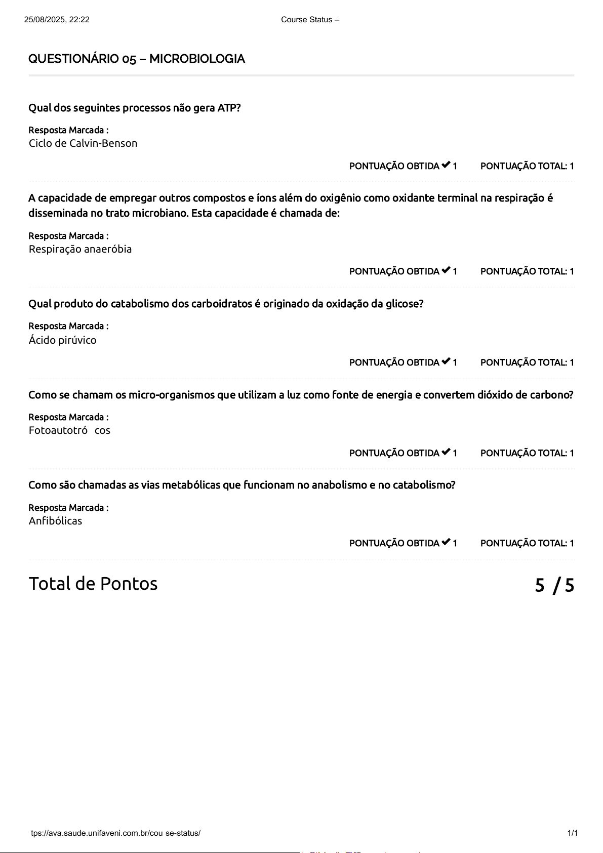 5 / 5 QUESTIONÁRIO 05 – MICROBIOLOGIA PONTUAÇÃO TOTAL: 1PONTUAÇÃO OBTIDA 1 Qual dos seguintes processos não gera ATP? Resposta Marcada : Ciclo de Calvin-Benson PONTUAÇÃO TOTAL: 1PONTUAÇÃO OBTIDA 1 A capacidade de empregar outros compostos e íons além do oxigênio como oxidante terminal na respiração é disseminada no trato microbiano. Esta capacidade é chamada de: Resposta Marcada : Respiração anaeróbia PONTUAÇÃO TOTAL: 1PONTUAÇÃO OBTIDA 1 Qual produto do catabolismo dos carboidratos é originado da oxidação da glicose? Resposta Marcada : Ácido pirúvico PONTUAÇÃO TOTAL: 1PONTUAÇÃO OBTIDA 1 Como se chamam os micro-organismos que utilizam a luz como fonte de energia e convertem dióxido de carbono? Resposta Marcada : Fotoautotróficos PONTUAÇÃO TOTAL: 1PONTUAÇÃO OBTIDA 1 Como são chamadas as vias metabólicas que funcionam no anabolismo e no catabolismo? Resposta Marcada : Anfibólicas Total de Pontos 25/08/2025, 22:22 Course Status – AVA Saúde Unifaveni https://ava.saude.unifaveni.com.br/course-status/ 1/1