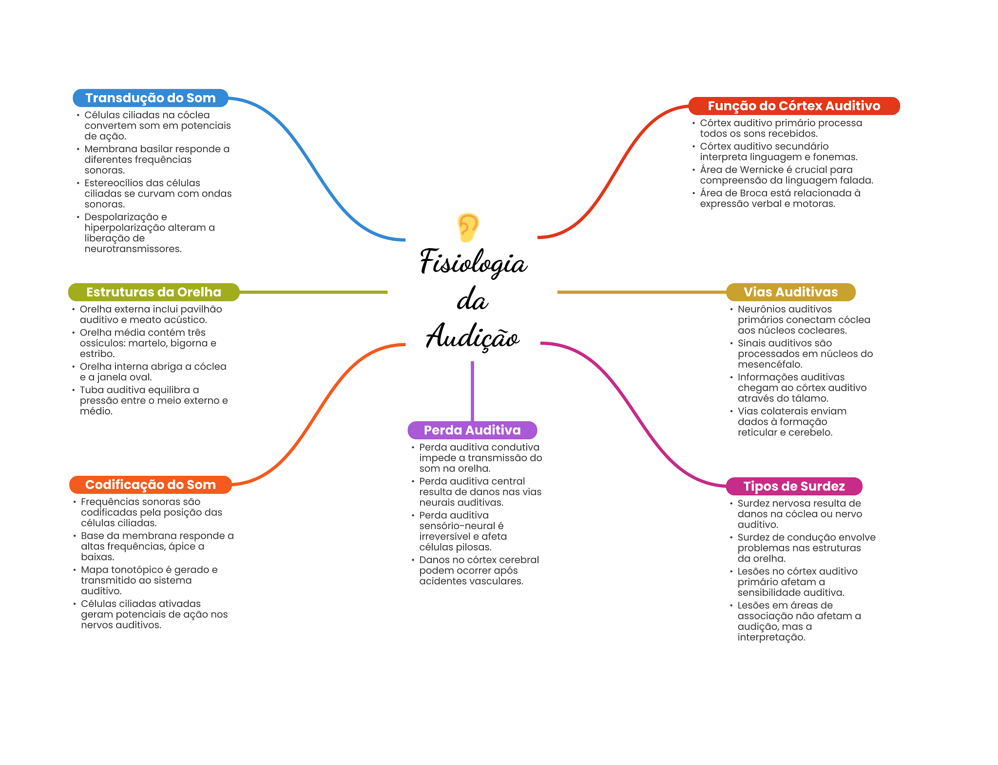 Transdução do Som Função do Córtex Auditivo Células ciliadas na cóclea convertem som em potenciais Córtex auditivo primário processa de ação. todos sons recebidos. Membrana basilar responde a Córtex auditivo secundário diferentes frequências interpreta linguagem e fonemas. sonoras. Área de Wernicke é crucial para Estereocílios das células compreensão da linguagem falada. ciliadas se curvam com ondas Área de Broca está relacionada à sonoras. expressão verbal e motoras. Despolarização e hiperpolarização alteram a liberação de ? neurotransmissores. Fisiologia Estruturas da Orelha da Vias Auditivas Orelha externa inclui pavilhão Neurônios auditivos auditivo e meato acústico. primários conectam cóclea Orelha média contém três Audição aos núcleos cocleares. ossículos: martelo, bigorna e Sinais auditivos são estribo. processados em núcleos do Orelha interna abriga a cóclea mesencéfalo. e a janela oval. Informações auditivas Tuba auditiva equilibra a chegam ao córtex auditivo pressão entre meio externo e através do tálamo. médio. Vias colaterais enviam dados à formação Perda Auditiva reticular e cerebelo. Perda auditiva condutiva impede a transmissão do som na orelha. Codificação do Som Perda auditiva central resulta de danos nas vias Tipos de Surdez Frequências sonoras são neurais auditivas. Surdez nervosa resulta de codificadas pela posição das Perda auditiva danos na cóclea ou nervo células ciliadas. sensório-neural é auditivo. Base da membrana responde a irreversível e afeta Surdez de condução envolve altas frequências, ápice a células pilosas. problemas nas estruturas baixas. Danos no córtex cerebral da orelha. tonotópico é gerado e podem ocorrer após Lesões no córtex auditivo transmitido ao sistema acidentes vasculares. primário afetam a auditivo. sensibilidade auditiva. Células ciliadas ativadas Lesões em áreas de geram potenciais de ação nos associação não afetam a nervos auditivos. audição, mas a interpretação.