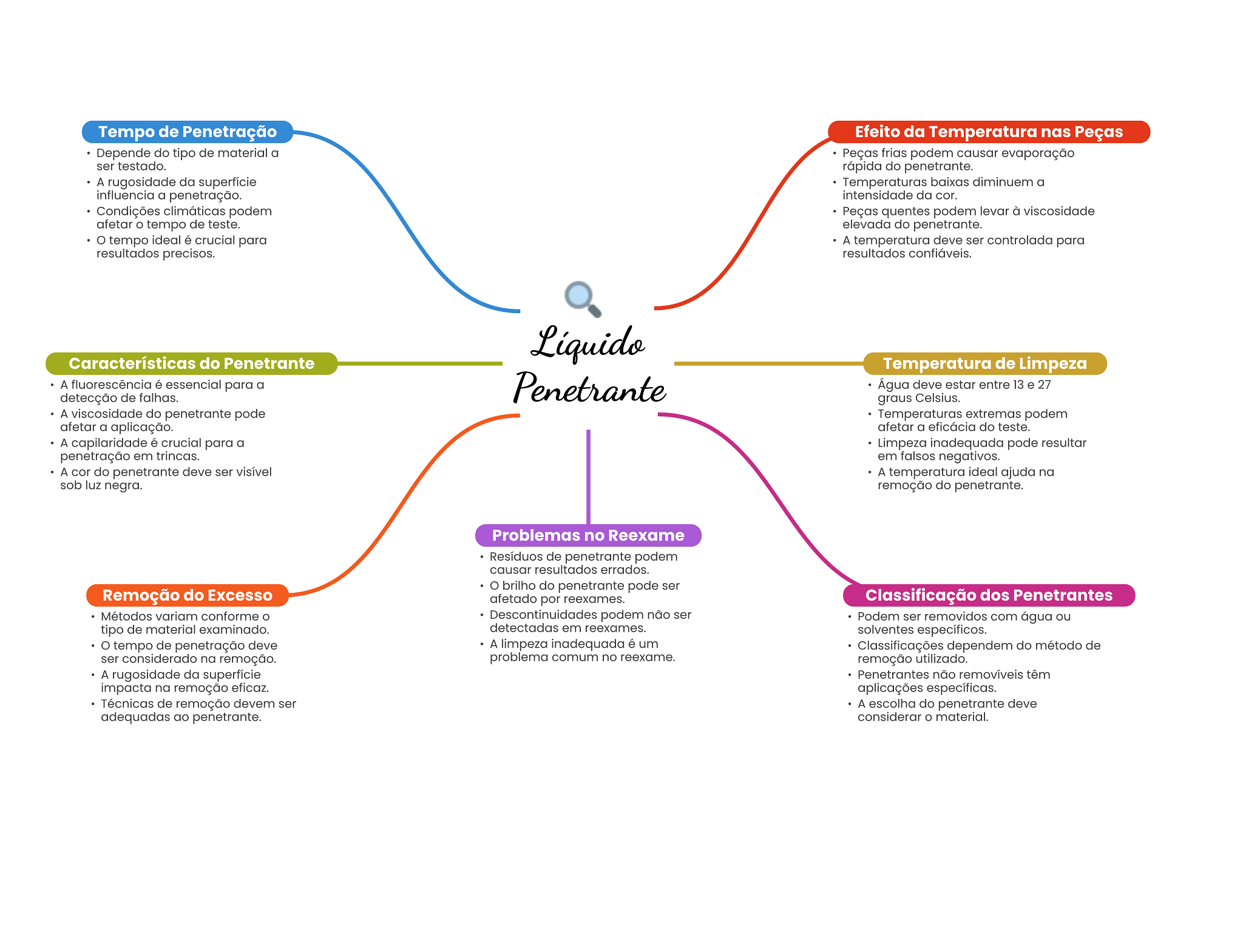 Tempo de Penetração Efeito da Temperatura nas Peças Depende do tipo de material a Peças frias podem causar evaporação ser testado. rápida do penetrante. A rugosidade da superfície Temperaturas baixas diminuem a influencia a penetração. intensidade da cor. Condições climáticas podem Peças quentes podem levar à viscosidade afetar tempo de teste. elevada do penetrante. tempo ideal é crucial para A temperatura deve ser controlada para resultados precisos. resultados confiáveis. Líquido Características do Penetrante Temperatura de Limpeza A fluorescência é essencial para a Penetrante Água deve estar entre 13 e 27 detecção de falhas. graus Celsius. A viscosidade do penetrante pode Temperaturas extremas podem afetar a aplicação. afetar a eficácia do teste. A capilaridade é crucial para a Limpeza inadequada pode resultar penetração em trincas. em falsos negativos. A cor do penetrante deve ser visível A temperatura ideal ajuda na sob luz negra. remoção do penetrante. Problemas no Reexame Resíduos de penetrante podem causar resultados errados. brilho do penetrante pode ser Remoção do Excesso afetado por reexames. Classificação dos Penetrantes Métodos variam conforme Descontinuidades podem não ser Podem ser removidos com água ou tipo de material examinado. detectadas em reexames. solventes específicos. tempo de penetração deve A limpeza inadequada é um Classificações dependem do método de ser considerado na remoção. problema comum no reexame. remoção utilizado. A rugosidade da superfície Penetrantes não removíveis têm impacta na remoção eficaz. aplicações específicas. Técnicas de remoção devem ser A escolha do penetrante deve adequadas ao penetrante. considerar material.