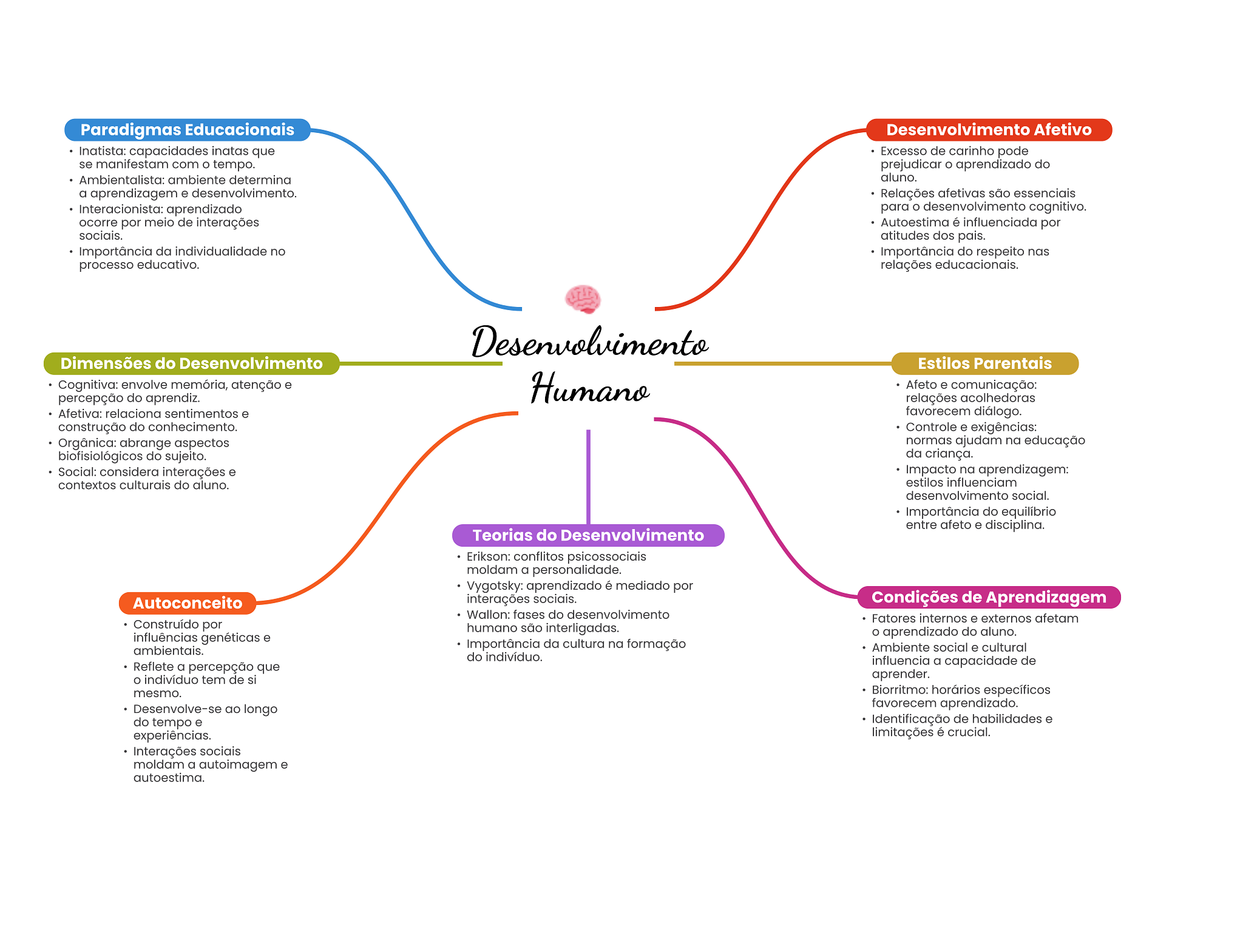 Paradigmas Educacionais Desenvolvimento Afetivo Inatista: capacidades inatas que Excesso de carinho pode se manifestam com tempo. prejudicar o aprendizado do Ambientalista: ambiente determina aluno. a aprendizagem e desenvolvimento. Relações afetivas são essenciais Interacionista: aprendizado para desenvolvimento cognitivo. ocorre por meio de interações Autoestima é influenciada por sociais. atitudes dos pais. Importância da individualidade no Importância do respeito nas processo educativo. relações educacionais. Desenvolvimento Dimensões do Desenvolvimento Estilos Parentais Cognitiva: envolve memória, atenção e percepção do aprendiz. Humano Afeto e comunicação: relações acolhedoras Afetiva: relaciona sentimentos e favorecem diálogo. construção do conhecimento. Controle e exigências: Orgânica: abrange aspectos normas ajudam na educação biofisiológicos do sujeito. da criança. Social: considera interações e Impacto na aprendizagem: contextos culturais do aluno. estilos influenciam desenvolvimento social. Importância do equilíbrio entre afeto e disciplina. Teorias do Desenvolvimento Erikson: conflitos psicossociais moldam a personalidade. Vygotsky: aprendizado é mediado por Autoconceito interações sociais. Condições de Aprendizagem Wallon: fases do desenvolvimento Fatores internos e externos afetam Construído por humano são interligadas. influências genéticas e O aprendizado do aluno. ambientais. Importância da cultura na formação Ambiente social e cultural do indivíduo. Reflete a percepção que influencia a capacidade de indivíduo tem de si aprender. mesmo. Biorritmo: horários específicos Desenvolve-se ao longo favorecem aprendizado. do tempo e Identificação de habilidades e experiências. limitações é crucial. Interações sociais moldam a autoimagem e autoestima.