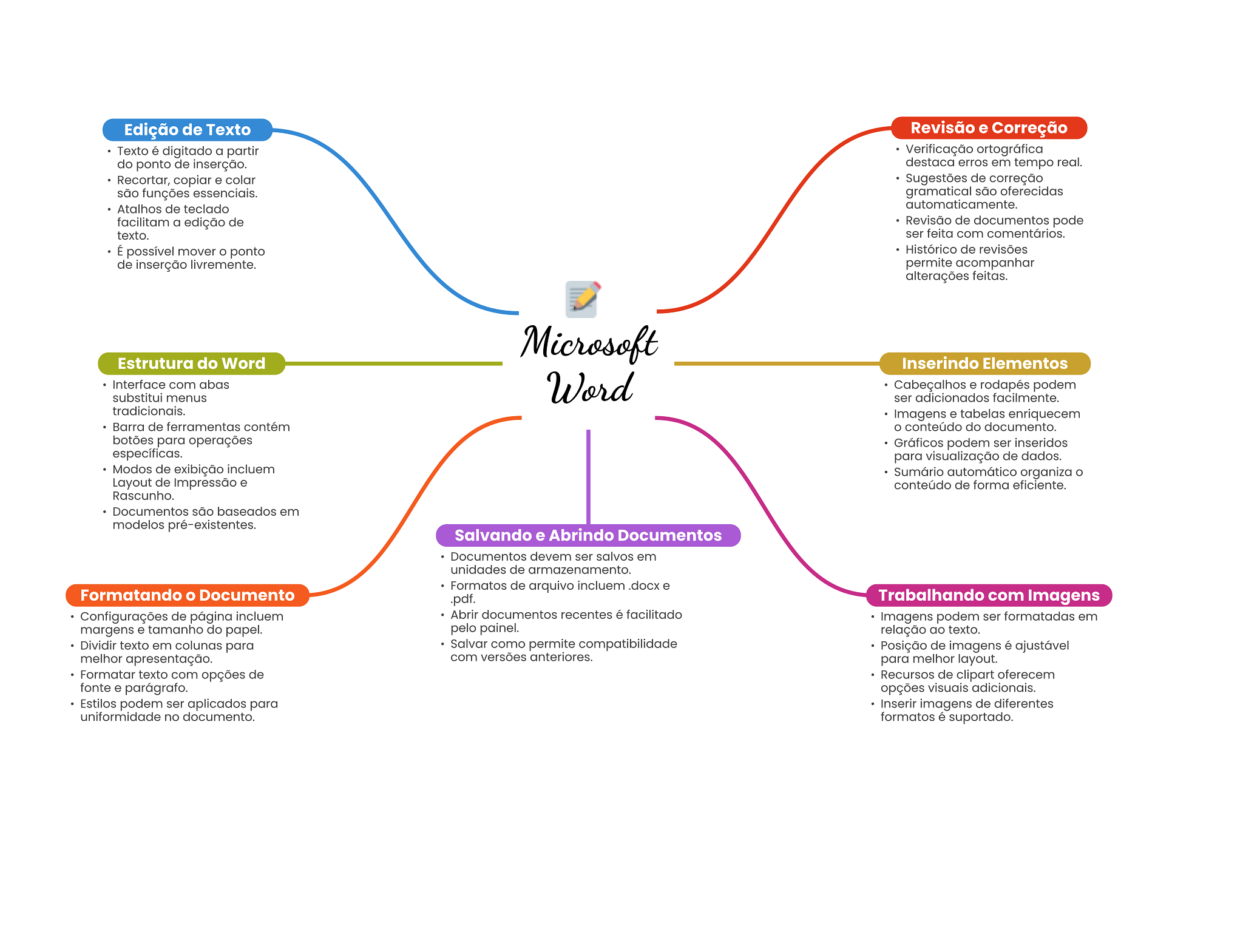 Edição de Texto Revisão e Correção Texto é digitado a partir Verificação ortográfica do ponto de inserção. destaca erros em tempo real. Recortar, copiar e colar Sugestões de correção são funções essenciais. gramatical são oferecidas Atalhos de teclado automaticamente facilitam a edição de Revisão de documentos pode texto. ser feita com comentários. É possível mover ponto Histórico de revisões de inserção livremente. permite acompanhar alterações feitas. Microsoft Estrutura do Word Inserindo Elementos Interface com abas substitui menus Word Cabeçalhos e rodapés podem ser adicionados facilmente. tradicionais. Imagens e tabelas enriquecem Barra de ferramentas contém conteúdo do documento. botões para operações Gráficos podem ser inseridos específicas. para visualização de dados. Modos de exibição incluem Sumário automático organiza O Layout de Impressão e conteúdo de forma eficiente. Rascunho. Documentos são baseados em modelos pré-existentes. Salvando e Abrindo Documentos Documentos devem ser salvos em unidades de armazenamento. Formatos de arquivo incluem e Formatando Documento .pdf. Trabalhando com Imagens Configurações de página incluem Abrir documentos recentes é facilitado Imagens podem ser formatadas em margens e tamanho do papel. pelo painel. relação ao texto. Dividir texto em colunas para Salvar como permite compatibilidade Posição de imagens é ajustável melhor apresentação. com versões anteriores. para melhor layout. Formatar texto com opções de Recursos de clipart oferecem fonte e parágrafo. opções visuais adicionais. Estilos podem ser aplicados para Inserir imagens de diferentes uniformidade no documento. formatos é suportado.
