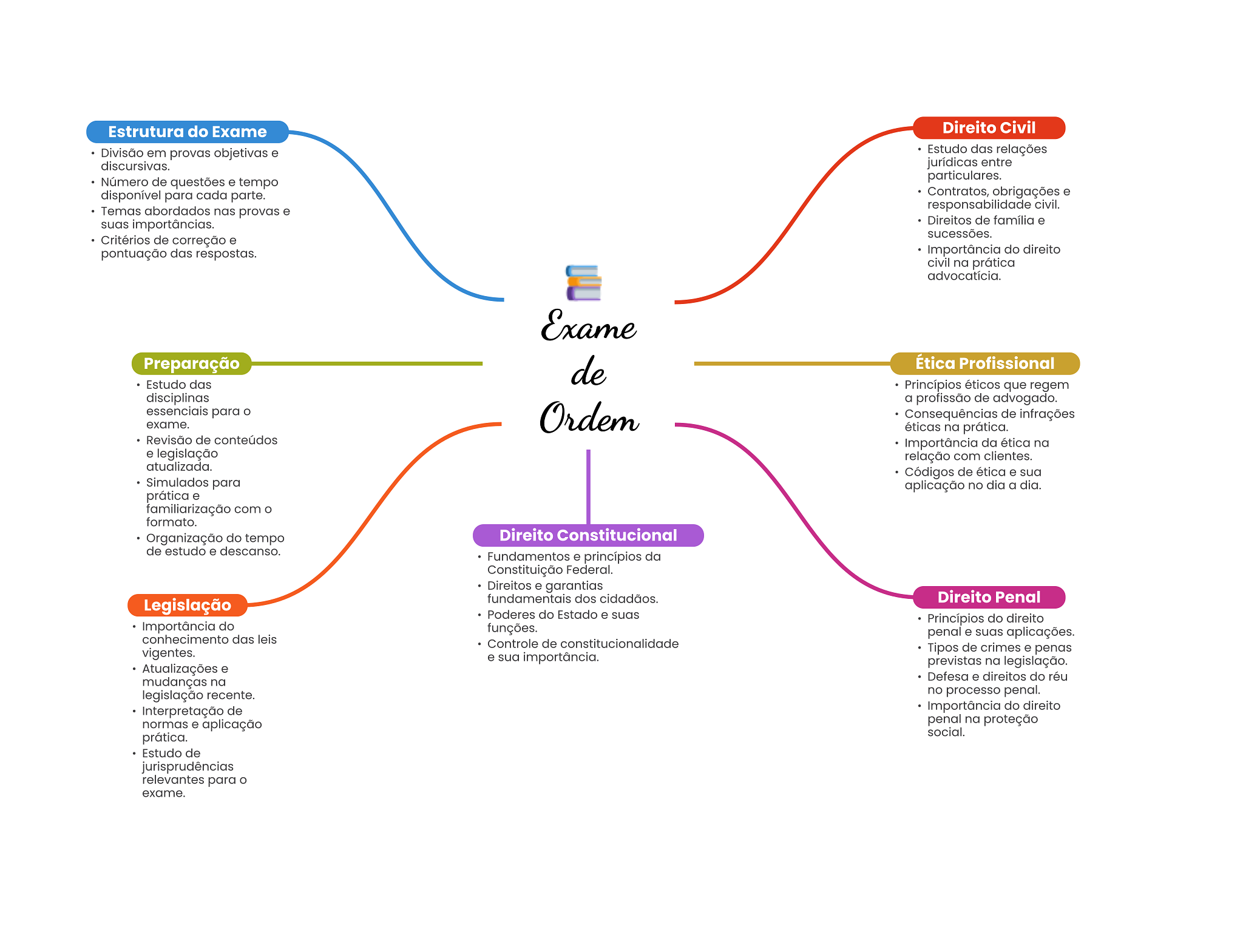 Estrutura do Exame Direito Civil Divisão em provas objetivas e Estudo das relações discursivas. jurídicas entre Número de questões e tempo particulares. disponível para cada parte. Contratos, obrigações e Temas abordados nas provas e responsabilidade civil. suas importâncias. Direitos de família e sucessões. Critérios de correção e pontuação das respostas. Importância do direito civil na prática advocatícia. Exame Preparação de Ética Profissional Estudo das Princípios éticos que regem disciplinas a profissão de advogado. essenciais para exame. Ordem Consequências de infrações éticas na prática. Revisão de conteúdos Importância da ética na e legislação relação com clientes. atualizada. Códigos de ética e sua Simulados para aplicação no dia a dia. prática e familiarização com formato. Organização do tempo Direito Constitucional de estudo e descanso. Fundamentos e princípios da Constituição Federal. Direitos e garantias fundamentais dos cidadãos. Direito Penal Legislação Poderes do Estado e suas Princípios do direito Importância do funções. penal e suas aplicações. conhecimento das leis Controle de constitucionalidade vigentes. Tipos de crimes e penas e sua importância. previstas na legislação. Atualizações e Defesa e direitos do réu mudanças na legislação recente. no processo penal. Interpretação de Importância do direito normas e aplicação penal na proteção social. prática. Estudo de jurisprudências relevantes para exame.