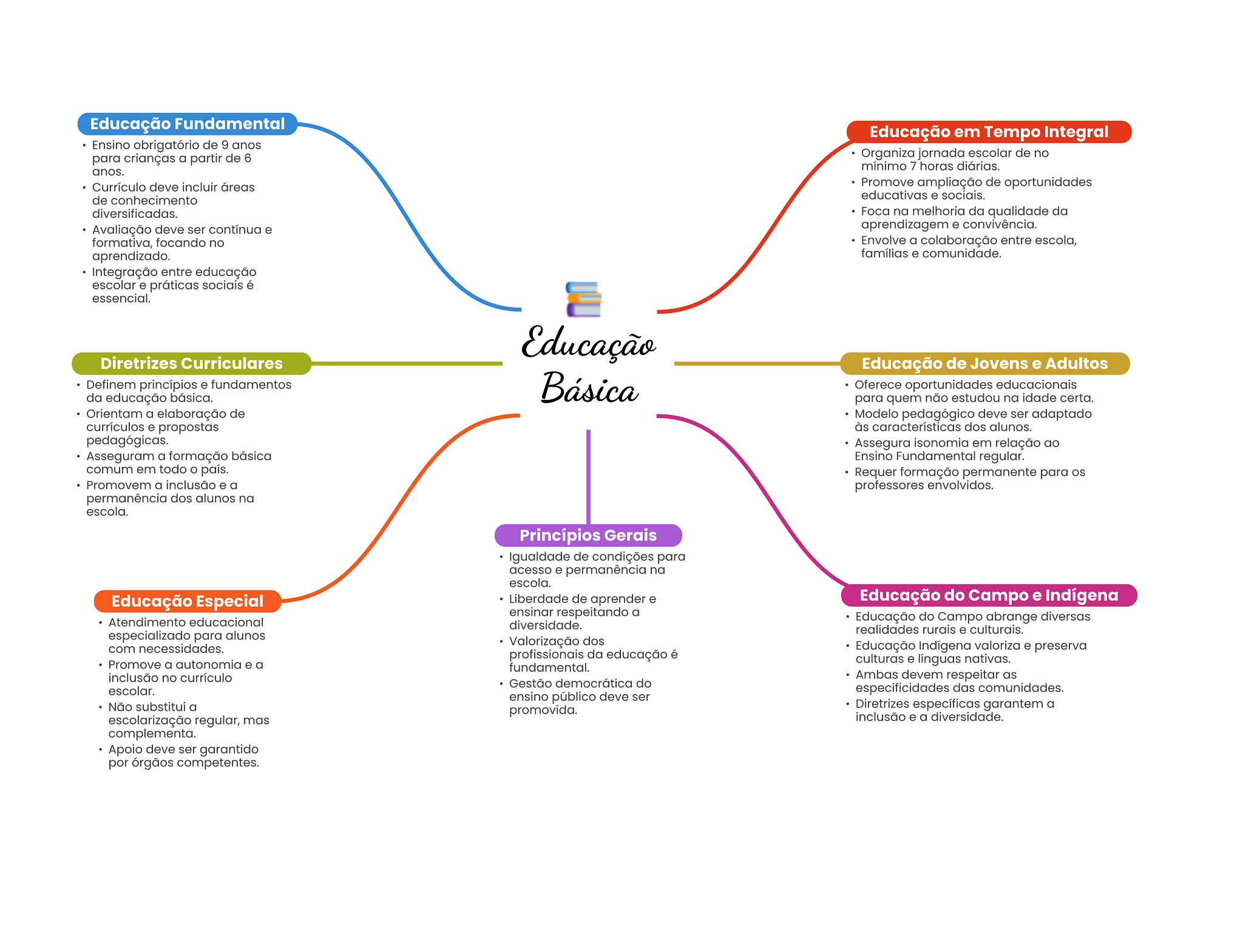 Educação Fundamental Educação em Tempo Integral Ensino obrigatório de 9 anos para crianças a partir de 6 Organiza jornada escolar de no mínimo 7 horas diárias. anos. Currículo deve incluir áreas Promove ampliação de oportunidades de conhecimento educativas e sociais. diversificadas. Foca na melhoria da qualidade da Avaliação deve ser contínua e aprendizagem e convivência. formativa, focando no Envolve a colaboração entre escola, aprendizado. famílias e comunidade. Integração entre educação escolar e práticas sociais é essencial. Educação Diretrizes Curriculares Educação de Jovens e Adultos Definem princípios e fundamentos Básica Oferece oportunidades educacionais da educação básica. para quem não estudou na idade certa. Orientam a elaboração de Modelo pedagógico deve ser adaptado currículos e propostas às características dos alunos. pedagógicas. Assegura isonomia em relação ao Asseguram a formação básica Ensino Fundamental regular. comum em todo país. Requer formação permanente para os Promovem a inclusão e a professores envolvidos. permanência dos alunos na escola. Princípios Gerais Igualdade de condições para acesso e permanência na escola. Educação Especial Liberdade de aprender e Educação do Campo e Indígena ensinar respeitando a Atendimento educacional Educação do Campo abrange diversas diversidade. realidades rurais e culturais. especializado para alunos Valorização dos com necessidades. Educação Indígena valoriza e preserva profissionais da educação é Promove a autonomia e a culturas e línguas nativas. fundamental. inclusão no currículo Ambas devem respeitar as Gestão democrática do escolar. especificidades das comunidades. ensino público deve ser Não substitui a promovida. Diretrizes específicas garantem a escolarização regular, mas inclusão e a diversidade. complementa. Apoio deve ser garantido por órgãos competentes.