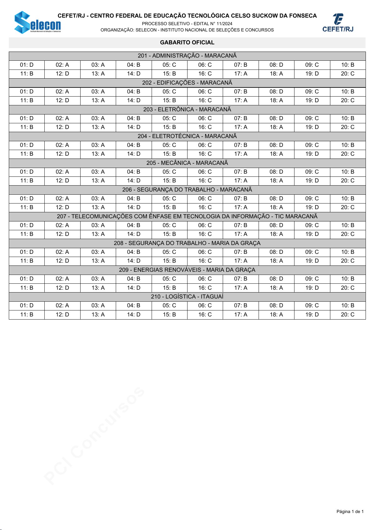 pcimarkpci MmEwOTpiYWM1OjA2ZDQ6MzA1YTowMDAwOjAwMDA6MDRkMTowMDYx:VGh1LCAyNSBEZWMgMjAyNSAxNzo1Njo0NSAtMDMwMA== www.pciconcursos.com.br CEFET/RJ - CENTRO FEDERAL DE EDUCAÇÃO TECNOLÓGICA CELSO SUCKOW DA FONSECA PROCESSO SELETIVO - EDITAL N° 11/2024 ORGANIZAÇÃO: SELECON - INSTITUTO NACIONAL DE SELEÇÕES E CONCURSOS GABARITO OFICIAL 201 - ADMINISTRAÇÃO - MARACANÃ 01: D 02: A 03: A 04: B 05: C 06: C 07: B 08: D 09: C 10: B 11: B 12: D 13: A 14: D 15: B 16: C 17: A 18: A 19: D 20: C 202 - EDIFICAÇÕES - MARACANÃ 01: D 02: A 03: A 04: B 05: C 06: C 07: B 08: D 09: C 10: B 11: B 12: D 13: A 14: D 15: B 16: C 17: A 18: A 19: D 20: C 203 - ELETRÔNICA - MARACANÃ 01: D 02: A 03: A 04: B 05: C 06: C 07: B 08: D 09: C 10: B 11: B 12: D 13: A 14: D 15: B 16: C 17: A 18: A 19: D 20: C 204 - ELETROTÉCNICA - MARACANÃ 01: D 02: A 03: A 04: B 05: C 06: C 07: B 08: D 09: C 10: B 11: B 12: D 13: A 14: D 15: B 16: C 17: A 18: A 19: D 20: C 205 - MECÂNICA - MARACANÃ 01: D 02: A 03: A 04: B 05: C 06: C 07: B 08: D 09: C 10: B 11: B 12: D 13: A 14: D 15: B 16: C 17: A 18: A 19: D 20: C 206 - SEGURANÇA DO TRABALHO - MARACANÃ 01: D 02: A 03: A 04: B 05: C 06: C 07: B 08: D 09: C 10: B 11: B 12: D 13: A 14: D 15: B 16: C 17: A 18: A 19: D 20: C 207 - TELECOMUNICAÇÕES COM ÊNFASE EM TECNOLOGIA DA INFORMAÇÃO - TIC MARACANÃ 01: D 02: A 03: A 04: B 05: C 06: C 07: B 08: D 09: C 10: B 11: B 12: D 13: A 14: D 15: B 16: C 17: A 18: A 19: D 20: C 208 - SEGURANÇA DO TRABALHO - MARIA DA GRAÇA 01: D 02: A 03: A 04: B 05: C 06: C 07: B 08: D 09: C 10: B 11: B 12: D 13: A 14: D 15: B 16: C 17: A 18: A 19: D 20: C 209 - ENERGIAS RENOVÁVEIS - MARIA DA GRAÇA 01: D 02: A 03: A 04: B 05: C 06: C 07: B 08: D 09: C 10: B 11: B 12: D 13: A 14: D 15: B 16: C 17: A 18: A 19: D 20: C 210 - LOGÍSTICA - ITAGUAÍ 01: D 02: A 03: A 04: B 05: C 06: C 07: B 08: D 09: C 10: B 11: B 12: D 13: A 14: D 15: B 16: C 17: A 18: A 19: D 20: C Página 1 de 1