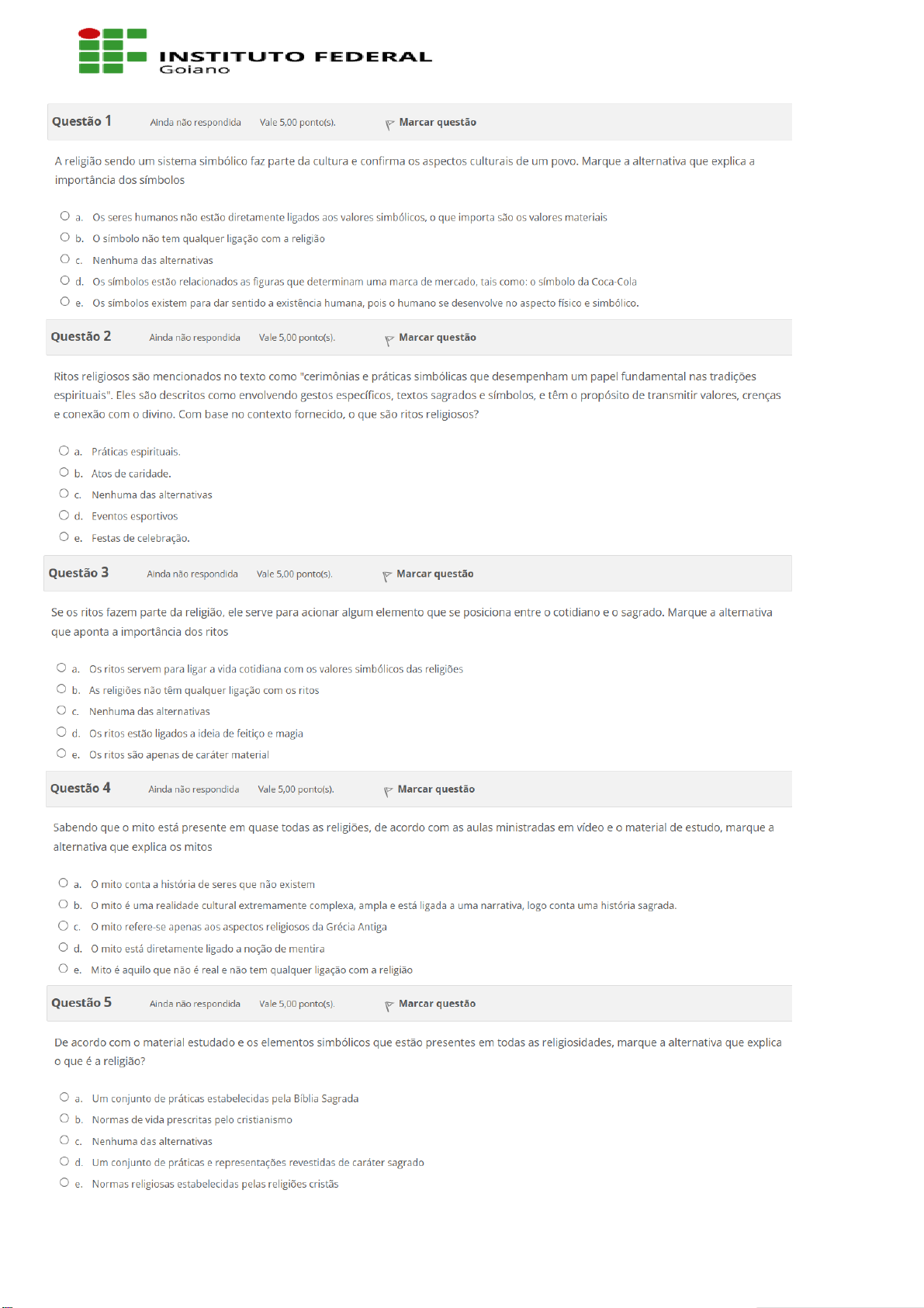 INSTITUTO FEDERAL Goiano Questão 1 Ainda não respondida Vale 5,00 ponto(s). Marcar questão A religião sendo um sistema simbólico faz parte da cultura e confirma os aspectos culturais de um povo. Marque a alternativa que explica a importância dos símbolos a. Os seres humanos não estão diretamente ligados aos valores simbólicos, que importa são os valores materiais b. símbolo não tem qualquer ligação com a religião C. Nenhuma das alternativas d. Os símbolos estão relacionados as figuras que determinam uma marca de mercado, tais como: 0 símbolo da Coca-Cola e. Os símbolos existem para dar sentido a existência humana, pois humano se desenvolve no aspecto físico e simbólico. Questão 2 Ainda não respondida Vale 5,00 ponto(s). Marcar questão Ritos religiosos são mencionados no texto como "cerimônias e práticas simbólicas que desempenham um papel fundamental nas tradições espirituais". Eles são descritos como envolvendo gestos específicos, textos sagrados e símbolos, e têm o propósito de transmitir valores, crenças e conexão com divino. Com base no contexto fornecido, o que são ritos religiosos? a. Práticas espirituais. b. Atos de caridade. C. Nenhuma das alternativas d. Eventos esportivos e. Festas de celebração. Questão 3 Ainda não respondida Vale 5,00 ponto(s). Marcar questão Se os ritos fazem parte da religião, ele serve para acionar algum elemento que se posiciona entre o cotidiano e o sagrado. Marque a alternativa que aponta a importância dos ritos a. Os ritos servem para ligar a vida cotidiana com os valores simbólicos das religiões b. As religiões não têm qualquer ligação com os ritos C. Nenhuma das alternativas d. Os ritos estão ligados a ideia de feitiço e magia e. Os ritos são apenas de caráter material Questão 4 Ainda não respondida Vale 5,00 ponto(s). Marcar questão Sabendo que mito está presente em quase todas as religiões, de acordo com as aulas ministradas em vídeo e o material de estudo, marque a alternativa que explica os mitos a. mito conta a história de seres que não existem b. mito é uma realidade cultural extremamente complexa, ampla e está ligada a uma narrativa, logo conta uma história sagrada. C. mito refere-se apenas aos aspectos religiosos da Grécia Antiga d. mito está diretamente ligado a noção de mentira e. Mito é aquilo que não é real e não tem qualquer ligação com a religião Questão 5 Ainda não respondida Vale 5,00 ponto(s). Marcar questão De acordo com material estudado e os elementos simbólicos que estão presentes em todas as religiosidades, marque a alternativa que explica que é a religião? a. Um conjunto de práticas estabelecidas pela Bíblia Sagrada b. Normas de vida prescritas pelo cristianismo C. Nenhuma das alternativas d. Um conjunto de práticas e representações revestidas de caráter sagrado e. Normas religiosas estabelecidas pelas religiões cristãs