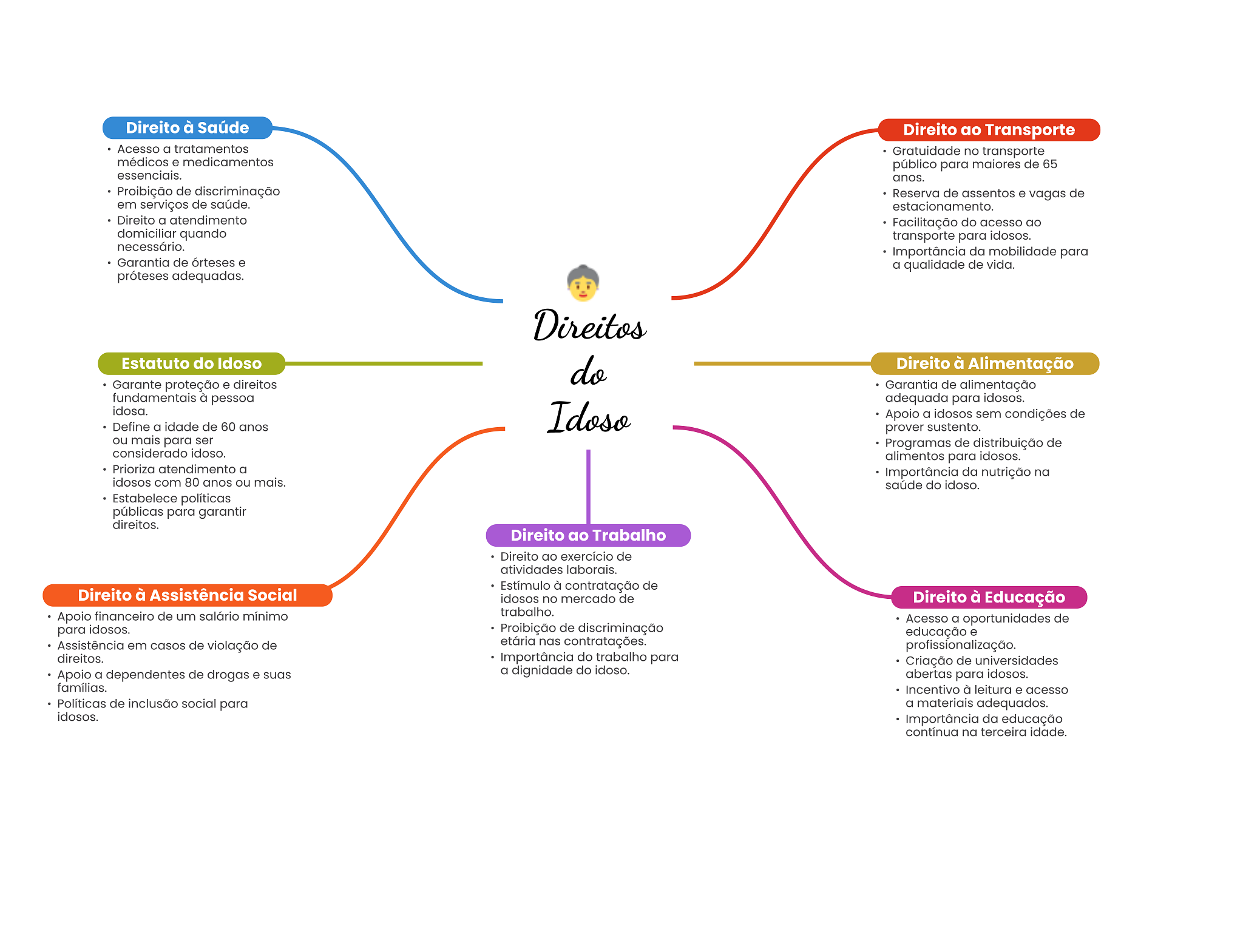 Direito à Saúde Direito ao Transporte Acesso a tratamentos Gratuidade no transporte médicos e medicamentos público para maiores de 65 essenciais. anos. Proibição de discriminação Reserva de assentos e vagas de em serviços de saúde. estacionamento. Direito a atendimento Facilitação do acesso ao domiciliar quando transporte para idosos. necessário. Importância da mobilidade para Garantia de órteses e a qualidade de vida. próteses adequadas. Direitos Estatuto do Idoso do Direito à Alimentação Garante proteção e direitos Garantia de alimentação fundamentais à pessoa adequada para idosos. idosa. Define a idade de 60 anos Idoso Apoio a idosos sem condições de prover sustento. ou mais para ser Programas de distribuição de considerado idoso. alimentos para idosos. Prioriza atendimento a Importância da nutrição na idosos com 80 anos ou mais. saúde do idoso. Estabelece políticas públicas para garantir direitos. Direito ao Trabalho Direito ao exercício de atividades laborais. Estímulo à contratação de Direito à Assistência Social idosos no mercado de Direito à Educação Apoio financeiro de um salário mínimo trabalho. Acesso a oportunidades de para idosos. Proibição de discriminação educação e Assistência em casos de violação de etária nas contratações. profissionalização. direitos. Importância do trabalho para Criação de universidades Apoio a dependentes de drogas e suas a dignidade do idoso. abertas para idosos. famílias. Incentivo à leitura e acesso Políticas de inclusão social para a materiais adequados. idosos. Importância da educação contínua na terceira idade.