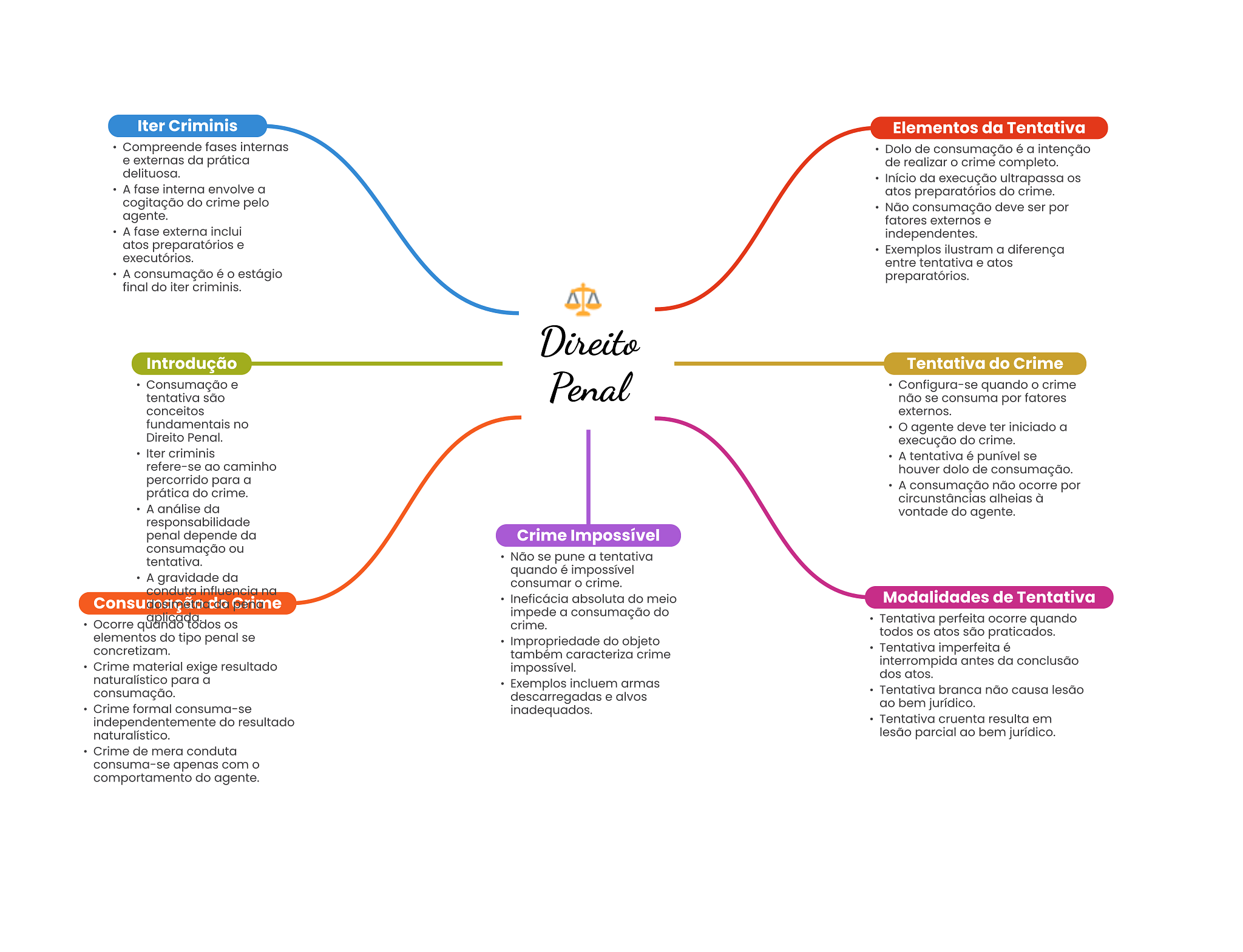 Iter Criminis Elementos da Tentativa Compreende fases internas Dolo de consumação é a intenção e externas da prática de realizar crime completo. delituosa. Início da execução ultrapassa fase interna envolve a atos preparatórios do crime. cogitação do crime pelo Não consumação deve ser por agente. fatores externos e A fase externa inclui independentes. atos preparatórios e Exemplos ilustram a diferença executórios. entre tentativa e atos A consumação é estágio preparatórios. final do iter criminis. Direito Introdução Tentativa do Crime Consumação e tentativa são Penal Configura-se quando crime não se consuma por fatores conceitos externos. fundamentais no agente deve ter iniciado a Direito Penal. execução do crime. Iter criminis A tentativa é punível se refere-se ao caminho houver dolo de consumação. percorrido para a A consumação não ocorre por prática do crime. circunstâncias alheias à A análise da vontade do agente. responsabilidade penal depende da Crime Impossível consumação ou tentativa. Não se pune a tentativa quando é impossível A gravidade da consumar O crime. conduta influencia na Ineficácia absoluta do meio Modalidades de Tentativa impede a consumação do Ocorre quando todos crime. Tentativa perfeita ocorre quando elementos do tipo penal se todos atos são praticados. Impropriedade do objeto concretizam. também caracteriza crime Tentativa imperfeita é Crime material exige resultado impossível. interrompida antes da conclusão dos atos. naturalístico para a Exemplos incluem armas consumação. Tentativa branca não causa lesão descarregadas e alvos Crime formal consuma-se inadequados. ao bem jurídico. independentemente do resultado Tentativa cruenta resulta em naturalístico. lesão parcial ao bem jurídico. Crime de mera conduta consuma-se apenas com comportamento do agente.