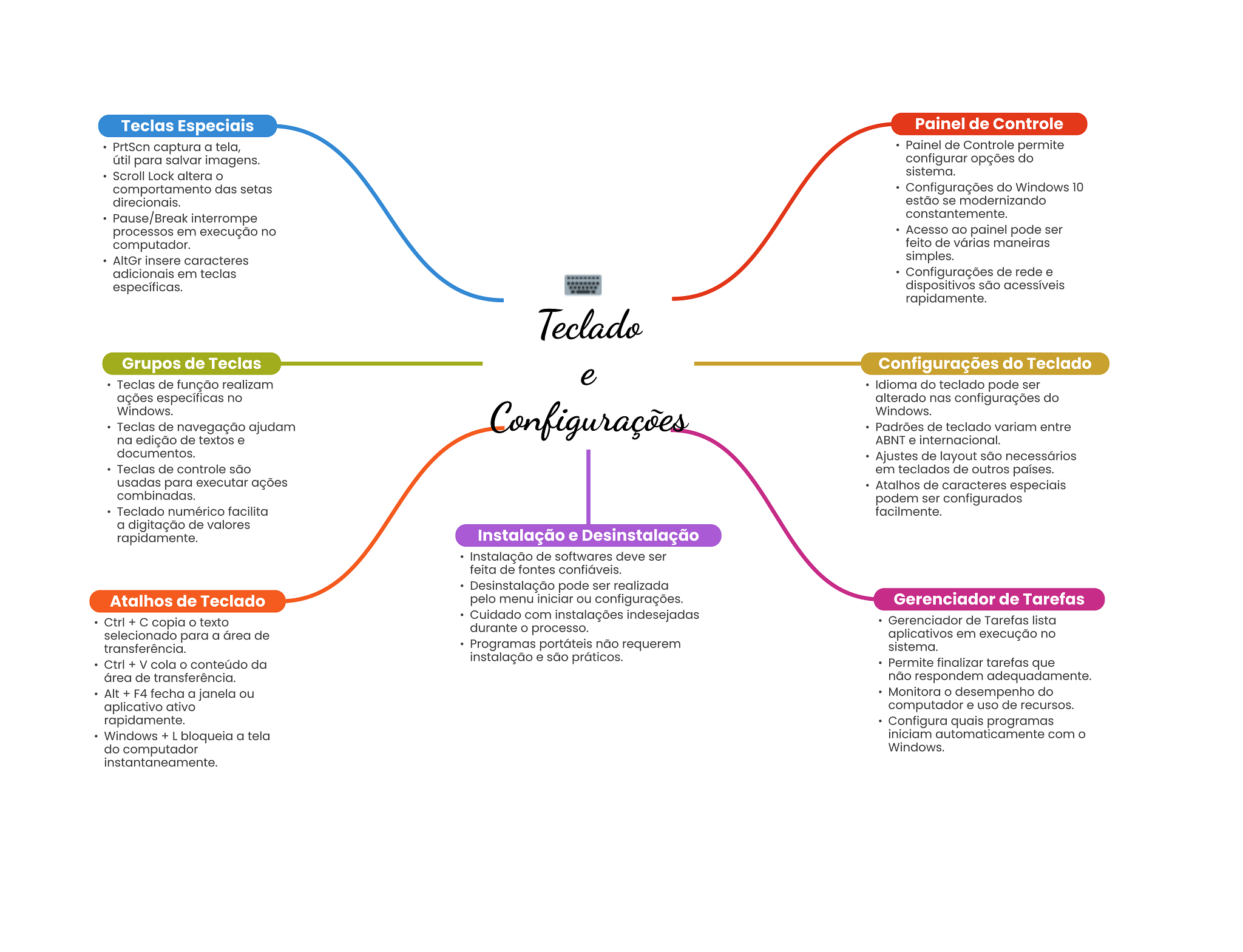 Teclas Especiais Painel de Controle PrtScn captura a tela, Painel de Controle permite útil para salvar imagens. configurar opções do Scroll Lock altera sistema. comportamento das setas Configurações do Windows 10 direcionais. estão se modernizando Pause/Break interrompe constantemente. processos em execução no Acesso ao painel pode ser computador. feito de várias maneiras AltGr insere caracteres simples. adicionais em teclas Configurações de rede e específicas. dispositivos são acessíveis rapidamente. Teclado Grupos de Teclas Configurações do Teclado Teclas de função realizam e Idioma do teclado pode ser ações específicas no alterado nas configurações do Windows. Teclas de navegação ajudam Configurações Windows. Padrões de teclado variam entre na edição de textos e ABNT e internacional. documentos. Ajustes de layout são necessários Teclas de controle são em teclados de outros países. usadas para executar ações Atalhos de caracteres especiais combinadas. podem ser configurados Teclado numérico facilita facilmente. a digitação de valores rapidamente. Instalação e Desinstalação Instalação de softwares deve ser feita de fontes confiáveis. Desinstalação pode ser realizada Atalhos de Teclado pelo menu iniciar ou configurações. Gerenciador de Tarefas Cuidado com instalações indesejadas Ctrl + copia texto Gerenciador de Tarefas lista durante processo. selecionado para a área de aplicativos em execução no transferência. Programas portáteis não requerem sistema. Ctrl + V cola conteúdo da instalação e são práticos. Permite finalizar tarefas que área de transferência. não respondem adequadamente. Alt + F4 fecha a janela ou Monitora desempenho do aplicativo ativo computador e uso de recursos. rapidamente. Configura quais programas Windows + L bloqueia a tela iniciam automaticamente com do computador Windows. instantaneamente.