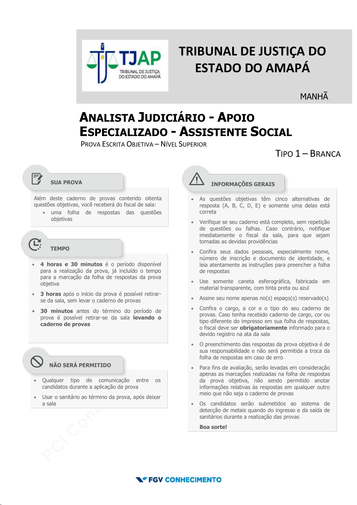 pcimarkpci MjgwNDowMTRkOjU4ODg6NTFhMTpkYWVmOjhmOTY6MDZjMjo4ZTIw:RnJpLCAyNiBEZWMgMjAyNSAxNjo0NzozMiAtMDMwMA== www.pciconcursos.com.br TRIBUNAL DE JUSTIÇA DO ESTADO DO AMAPÁ MANHÃ ANALISTA JUDICIÁRIO - APOIO ESPECIALIZADO - ASSISTENTE SOCIAL PROVA ESCRITA OBJETIVA – NÍVEL SUPERIOR TIPO 1 – BRANCA Além deste caderno de provas contendo oitenta questões objetivas, você receberá do fiscal de sala: uma folha de respostas das questões objetivas As questões objetivas têm cinco alternativas de resposta (A, B, C, D, E) e somente uma delas está correta Verifique se seu caderno está completo, sem repetição de questões ou falhas. Caso contrário, notifique imediatamente o fiscal da sala, para que sejam tomadas as devidas providências Confira seus dados pessoais, especialmente nome, número de inscrição e documento de identidade, e leia atentamente as instruções para preencher a folha de respostas Use somente caneta esferográfica, fabricada em material transparente, com tinta preta ou azul Assine seu nome apenas no(s) espaço(s) reservado(s) Confira o cargo, a cor e o tipo do seu caderno de provas. Caso tenha recebido caderno de cargo, cor ou tipo diferente do impresso em sua folha de respostas, o fiscal deve ser obrigatoriamente informado para o devido registro na ata da sala O preenchimento das respostas da prova objetiva é de sua responsabilidade e não será permitida a troca da folha de respostas em caso de erro Para fins de avaliação, serão levadas em consideração apenas as marcações realizadas na folha de respostas da prova objetiva, não sendo permitido anotar informações relativas às respostas em qualquer outro meio que não seja o caderno de provas Os candidatos serão submetidos ao sistema de detecção de metais quando do ingresso e da saída de sanitários durante a realização das provas Boa sorte! 4 horas e 30 minutos é o período disponível para a realização da prova, já incluído o tempo para a marcação da folha de respostas da prova objetiva 3 horas após o início da prova é possível retirar- se da sala, sem levar o caderno de provas 30 minutos antes do término do período de prova é possível retirar-se da sala levando o caderno de provas Qualquer tipo de comunicação entre os candidatos durante a aplicação da prova Usar o sanitário ao término da prova, após deixar a sala SUA PROVA TEMPO NÃO SERÁ PERMITIDO INFORMAÇÕES GERAIS pcimarkpci MjgwNDowMTRkOjU4ODg6NTFhMTpkYWVmOjhmOTY6MDZjMjo4ZTIw:RnJpLCAyNiBEZWMgMjAyNSAxNjo0NzozMiAtMDMwMA== www.pciconcursos.com.br pcimarkpci MjgwNDowMTRkOjU4ODg6NTFhMTpkYWVmOjhmOTY6MDZjMjo4ZTIw:RnJpLCAyNiBEZWMgMjAyNSAxNjo0NzozMiAtMDMwMA== www.pciconcursos.com.br Tribunal de Justiça do Estado do Amapá FGV Conhecimento Analista Judiciário - Apoio Especializado - Assistente Social Tipo 1 ̶ Branca – Página 3 Língua Portuguesa 1 O dicionário de Antônio Houaiss, na pág. 284, registra no verbete “biblioteconomia”: “1. parte da bibliotecologia que trata dos aspectos da armazenagem, do acesso e da circulação das coleções de livros, 2. conjunto de conhecimentos e técnicas necessários à gestão de uma biblioteca. ETIM fr. bibliothéconomie.” Sobre a estruturação e conteúdo desse verbete, é correto afirmar que: (A) sendo uma definição, o segmento 1 parte de um termo geral e acrescenta especificações; (B) os segmentos numerados mostram, em ordem cronológica, os significados adquiridos pelo termo “biblioteconomia”; (C) apesar de veiculado em linguagem culta, o verbete traz um erro de concordância nominal; (D) segundo o que se apreende do verbete, a bibliotecologia faz parte da biblioteconomia; (E) a informação sobre a etimologia da palavra “biblioteconomia” nos indica o significado dos segmentos componentes do vocábulo. 2 Um conto moderno do escritor paranaense Dalton Trevisan começa com a seguinte frase: “Primeira noite ele conheceu que Santina não era moça.” A marca essencial desse segmento que o insere no conjunto dos textos literários de ficção e não entre os textos informativos, é: (A) a seleção vocabular de linguagem erudita; (B) a absoluta correção gramatical na estruturação das frases; (C) o emprego da linguagem popular como sinal de inclusão; (D) a presença inicial de termos sem referentes na realidade; (E) a necessidade de situar no tempo e no espaço o fato referido. 3 Os textos, independentemente de seu modo de organização, possuem um conjunto de marcas específicas; entre as frases abaixo, aquela que mostra coesão e coerência, é: (A) O invisível é real. As almas têm seu mundo; (B) A palavra é dom de todos. A sabedoria cabe a Deus; (C) Em qualquer abundância há falta; (D) A melhor maneira de ir devagar é não ir; (E) O caminho que sobe é o mesmo que desce. 4 Em muitas frases podemos optar entre a presença de um termo preposicionado ou de um só vocábulo: tempo de escola = tempo escolar. A frase abaixo em que o termo preposicionado sublinhado pode ser adequadamente substituído por um só termo, é: (A) A sabedoria dos velhos é um grande erro. Não chegam a ser mais sábios, apenas mais prudentes; (B) Abrace muito, beije e ria, já que a vida é de graça; (C) Tente colocar bom senso na cabeça de um tolo e ele dirá que é tolice; (D) O ótimo é inimigo do bom; (E) Quem se senta no fundo de um poço vai achar pequeno o céu. 5 Um romance mostra o seguinte segmento: “Eu pergunto que tipo de história a menina deseja. Ela responde categoricamente que quer uma história de amor e de ficção científica. Então, comecei: ‘Um robô encontra uma jovem...’ Mas ela não me deixa prosseguir. ‘Você não sabe contar histórias’, disse ela. Uma verdadeira história é obrigatoriamente no passado. - Tá bom, se você quer: “Um robô encontrou uma jovem...” - Não, tem que ser no passado histórico... - Bom, lá vai: “Outrora, há muito tempo, um robô muito inteligente, ainda que totalmente metálico, encontrou num