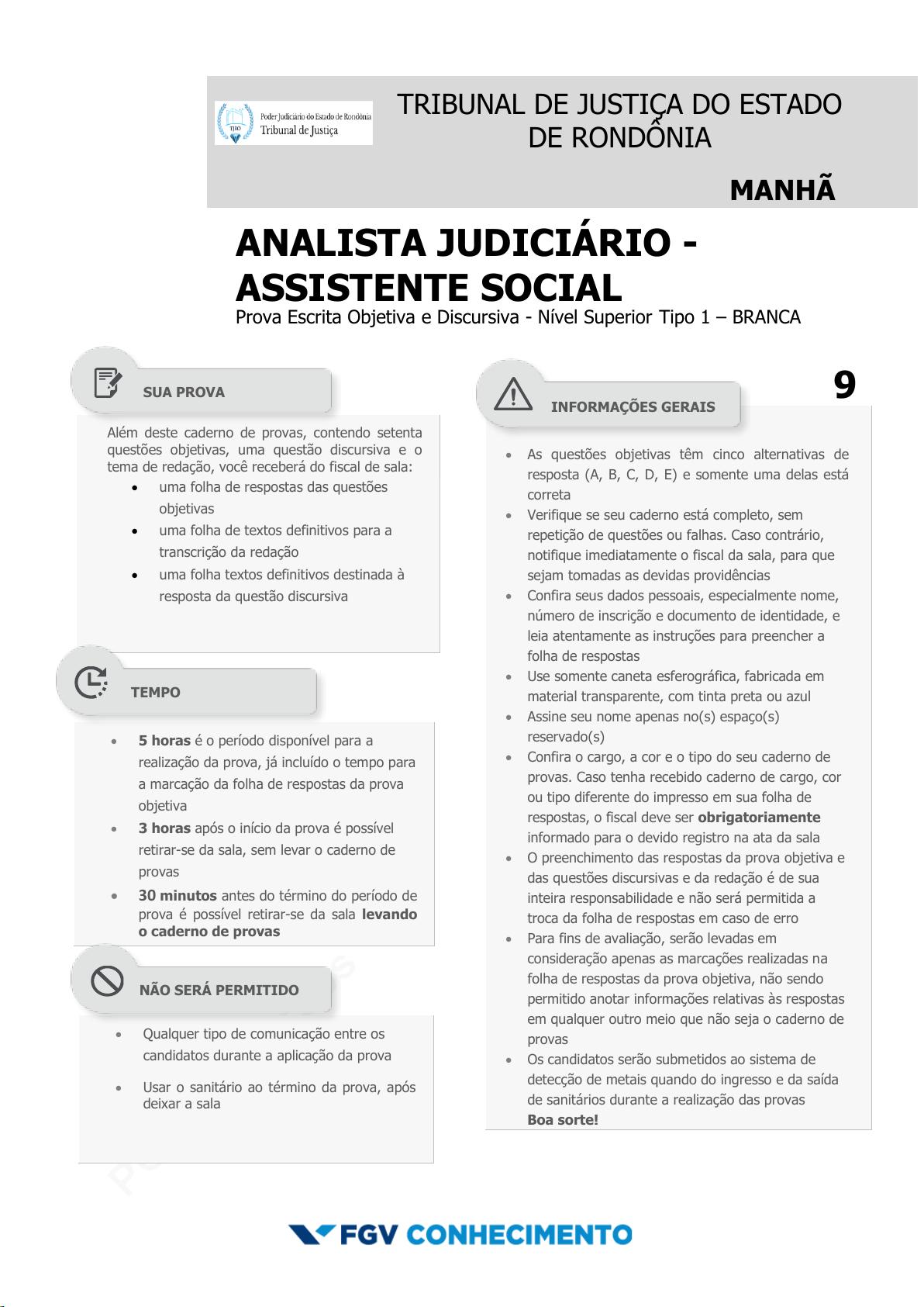 pcimarkpci MjgwNDowMTRkOjU4ODg6NTFhMTpkYWVmOjhmOTY6MDZjMjo4ZTIw:RnJpLCAyNiBEZWMgMjAyNSAxNjo1NDoxNyAtMDMwMA== www.pciconcursos.com.br TRIBUNAL DE JUSTIÇA DO ESTADO DE RONDÔNIA M A N H Ã MANHÃ ANALISTA JUDICIÁRIO - ASSISTENTE SOCIAL Prova Escrita Objetiva e Discursiva - Nível Superior Tipo 1 – BRANCA Além deste caderno de provas, contendo setenta questões objetivas, uma questão discursiva e o tema de redação, você receberá do fiscal de sala: uma folha de respostas das questões objetivas uma folha de textos definitivos para a transcrição da redação uma folha textos definitivos destinada à resposta da questão discursiva 9 As questões objetivas têm cinco alternativas de resposta (A, B, C, D, E) e somente uma delas está correta Verifique se seu caderno está completo, sem repetição de questões ou falhas. Caso contrário, notifique imediatamente o fiscal da sala, para que sejam tomadas as devidas providências Confira seus dados pessoais, especialmente nome, número de inscrição e documento de identidade, e leia atentamente as instruções para preencher a folha de respostas Use somente caneta esferográfica, fabricada em material transparente, com tinta preta ou azul Assine seu nome apenas no(s) espaço(s) reservado(s) Confira o cargo, a cor e o tipo do seu caderno de provas. Caso tenha recebido caderno de cargo, cor ou tipo diferente do impresso em sua folha de respostas, o fiscal deve ser obrigatoriamente informado para o devido registro na ata da sala O preenchimento das respostas da prova objetiva e das questões discursivas e da redação é de sua inteira responsabilidade e não será permitida a troca da folha de respostas em caso de erro Para fins de avaliação, serão levadas em consideração apenas as marcações realizadas na folha de respostas da prova objetiva, não sendo permitido anotar informações relativas às respostas em qualquer outro meio que não seja o caderno de provas Os candidatos serão submetidos ao sistema de detecção de metais quando do ingresso e da saída de sanitários durante a realização das provas Boa sorte! 5 horas é o período disponível para a realização da prova, já incluído o tempo para a marcação da folha de respostas da prova objetiva 3 horas após o início da prova é possível retirar-se da sala, sem levar o caderno de provas 30 minutos antes do término do período de prova é possível retirar-se da sala levando o caderno de provas Qualquer tipo de comunicação entre os candidatos durante a aplicação da prova Usar o sanitário ao término da prova, após deixar a sala SUA PROVA TEMPO NÃO SERÁ PERMITIDO INFORMAÇÕES GERAIS pcimarkpci MjgwNDowMTRkOjU4ODg6NTFhMTpkYWVmOjhmOTY6MDZjMjo4ZTIw:RnJpLCAyNiBEZWMgMjAyNSAxNjo1NDoxNyAtMDMwMA== www.pciconcursos.com.br pcimarkpci MjgwNDowMTRkOjU4ODg6NTFhMTpkYWVmOjhmOTY6MDZjMjo4ZTIw:RnJpLCAyNiBEZWMgMjAyNSAxNjo1NDoxNyAtMDMwMA== www.pciconcursos.com.br TRIBUNAL DE JUSTIÇA DO ESTADO DE RONDÔNIA FGV Conhecimento Analista Judiciário - Assistente Social Tipo 1 – Cor BRANCA – Página 3 Conhecimentos Básicos 1 Observe o seguinte diálogo entre mãe e filha, quando esta volta do cabeleireiro: Mãe: “O que é que houve? Você acabou não indo?” A recomendação sobre a língua escrita que foi seguida nessa pergunta feita pela mãe é que sua fala: (A) seja o mais informativa que requeira o propósito da conversação; (B) seja a expressão da verdade; (C) seja relevante; (D) seja breve; (E) evite a obscuridade. 2 Observe agora um pequeno cartaz na porta de um estacionamento no centro da cidade, voltado para a rua: SAÍDA DE VEÍCULOS OBRIGADO Nesse cartaz, a finalidade maior é: (A) solicitar que não se estacione na saída; (B) alertar para o perigo de atropelamento; (C) avisar que a entrada é localizada em outro lugar; (D) agradecer o uso do estacionamento; (E) evitar a entrada e a saída de veículos simultaneamente. 3 Abaixo estão cinco enunciados seguidos de uma pressuposição necessária para que ele faça sentido; a frase que mostra uma pressuposição adequada é: (A) Heitor lamenta que os pais de sua namorada viajem neste final de semana / A viagem a ser realizada é pouco demorada; (B) Dois amigos meus vão a São Paulo no próximo domingo / Os dois amigos têm namoradas na cidade de São Paulo; (C) Me dá pena que uma moça como ela esteja saindo com o Carlos / Carlos está desempregado e sem dinheiro; (D) Aquele casal pretende bronzear-se em Copacabana / Em Copacabana faz sol constantemente; (E) Deixou de ir ao Rio pelo excesso de calor / A pessoa que viajaria ao Rio não possuía roupas adequadas. 4 Observe a seguinte situação: Guilherme, que está viajando, pede a Magda, por e-mail, que compre para ele uma revista e verifique se foi publicado corretamente o artigo que ele havia escrito e, se isso ocorreu, que lhe envie. Alguns dias depois, Magda responde: “Não me esqueci da revista. Já a comprei.” Ocorre nessa situação uma falha na comunicação, que é certamente devida ao seguinte fato: (A) Magda mentiu sobre o fato de ter comprado a revista; (B) Magda presta informações insuficientes a Guilherme; (C) Guilherme não expõe com clareza seu pedido; (D) Magda constrói sua resposta com ambiguidade; (E) Guilherme é muito prolixo em sua solicitação. 5 Observe a seguinte situação comunicativa: “Roberto envia a Viviane, uma escritora consagrada, um conto escrito por ele, para que ela lhe dê sua opinião. Ao ler o conto, no qual a protagonista é uma caricatura dela mesma, responde a Roberto: ‘Seu conto está muito bom. Estou aliviada de que não tenha sido escrito para publicação, mas como diversão entre nós. Ri muito com a protagonista. Você tem muito senso de humor e isso é bom para quem escreve’.” Pode-se inferir da resposta de Viviane que ela: (A) faz deduções a partir das informações de Roberto; (B) declara que o conto deve conter fatos humorísticos; (C) considera o conto indigno de publicação; (D) reconhe