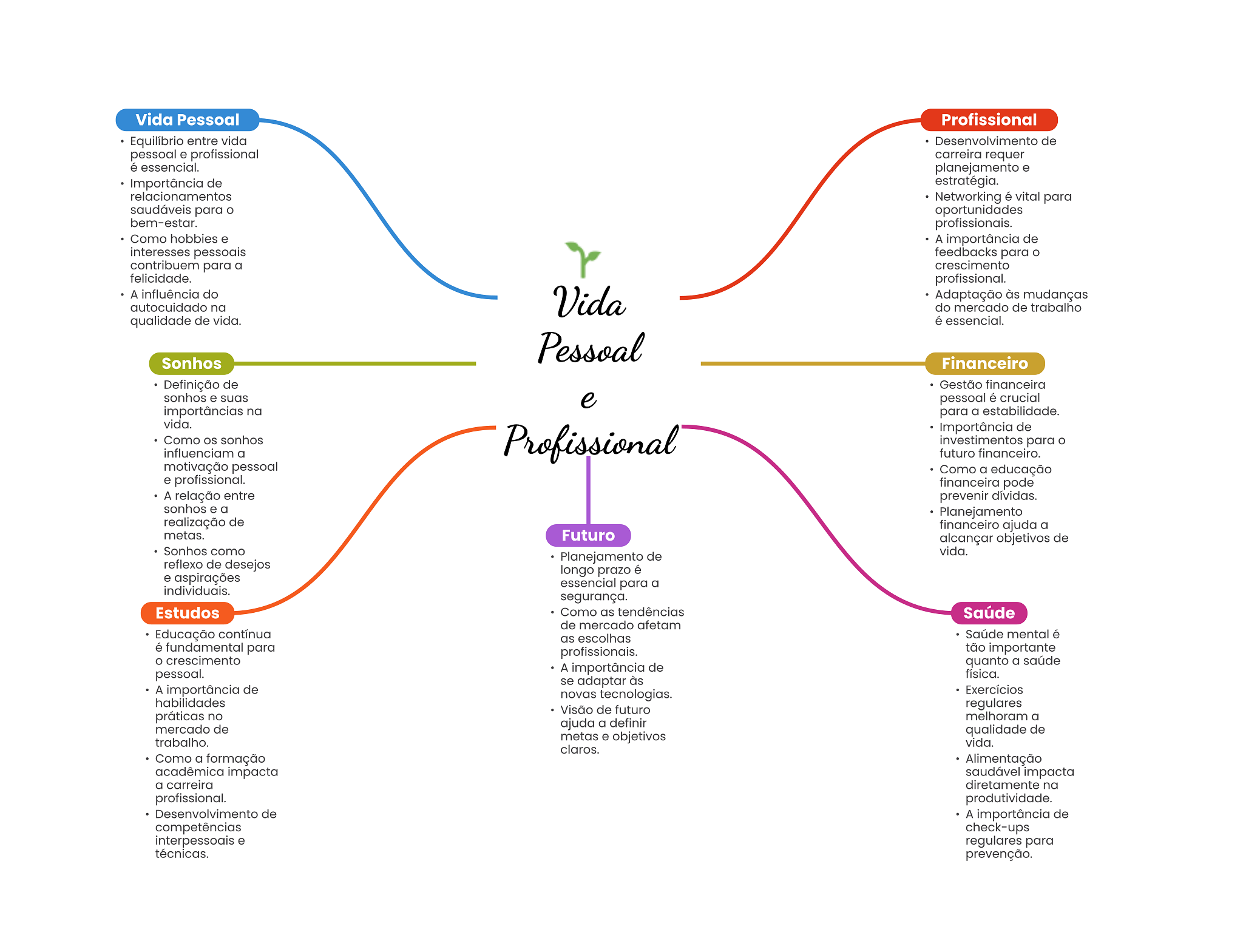 Vida Pessoal Profissional Equilíbrio entre vida Desenvolvimento de pessoal e profissional carreira requer é essencial. planejamento e Importância de estratégia. relacionamentos Networking é vital para saudáveis para oportunidades bem-estar. profissionais. Como hobbies e A importância de interesses pessoais feedbacks para contribuem para a crescimento felicidade. profissional. A influência do autocuidado na Vida Adaptação às mudanças do mercado de trabalho qualidade de vida. é essencial. Pessoal Sonhos Financeiro Definição de Gestão financeira sonhos e suas e pessoal é crucial importâncias na para a estabilidade. vida. Importância de Como os sonhos influenciam a Profissional investimentos para futuro financeiro. motivação pessoal Como a educação e profissional. financeira pode A relação entre prevenir dívidas. sonhos e a Planejamento realização de financeiro ajuda a metas. Futuro alcançar objetivos de Sonhos como Planejamento de vida. reflexo de desejos longo prazo é e aspirações essencial para a individuais. segurança. Estudos Como as tendências Saúde de mercado afetam Educação contínua as escolhas Saúde mental é é fundamental para profissionais. tão importante crescimento pessoal. A importância de quanto a saúde física. se adaptar às A importância de novas tecnologias. Exercícios habilidades Visão de futuro regulares práticas no melhoram a mercado de ajuda a definir trabalho. metas e objetivos qualidade de vida. claros. Como a formação Alimentação acadêmica impacta saudável impacta a carreira diretamente na profissional. produtividade. Desenvolvimento de A importância de competências check-ups interpessoais e regulares para técnicas. prevenção.