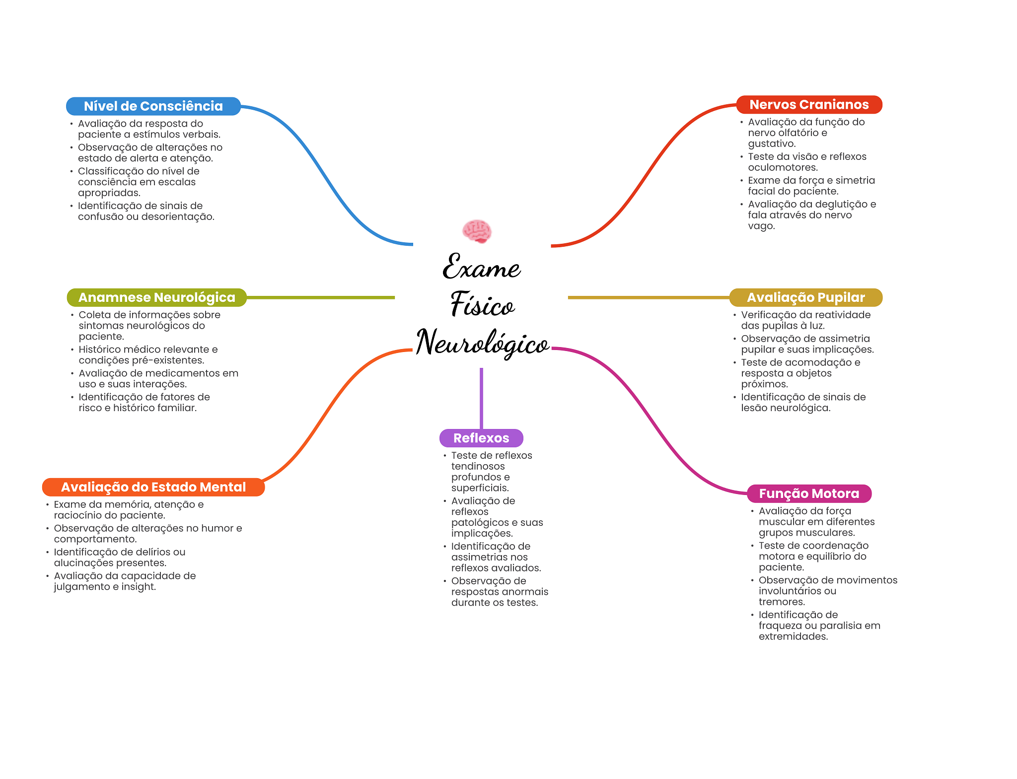 Nível de Consciência Nervos Cranianos Avaliação da resposta do Avaliação da função do paciente a estímulos verbais. nervo olfatório e Observação de alterações no gustativo. estado de alerta e atenção. Teste da visão e reflexos Classificação do nível de oculomotores. consciência em escalas Exame da força e simetria apropriadas. facial do paciente. Identificação de sinais de Avaliação da deglutição e confusão ou desorientação. fala através do nervo vago. Exame Anamnese Neurológica Físico Avaliação Pupilar Coleta de informações sobre Verificação da reatividade sintomas neurológicos do das pupilas à luz. paciente. Histórico médico relevante e Neurológico Observação de assimetria pupilar e suas implicações. condições pré-existentes. Teste de acomodação e Avaliação de medicamentos em resposta a objetos uso e suas interações. próximos. Identificação de fatores de Identificação de sinais de risco e histórico familiar. lesão neurológica. Reflexos Teste de reflexos tendinosos profundos e Avaliação do Estado Mental superficiais. Função Motora Exame da memória, atenção e Avaliação de raciocínio do paciente. reflexos Avaliação da força Observação de alterações no humor e patológicos e suas muscular em diferentes implicações. grupos musculares. comportamento. Identificação de Teste de coordenação Identificação de delírios ou assimetrias nos motora e equilíbrio do alucinações presentes. reflexos avaliados. paciente. Avaliação da capacidade de julgamento e insight. Observação de Observação de movimentos respostas anormais involuntários ou durante testes. tremores. Identificação de fraqueza ou paralisia em extremidades.