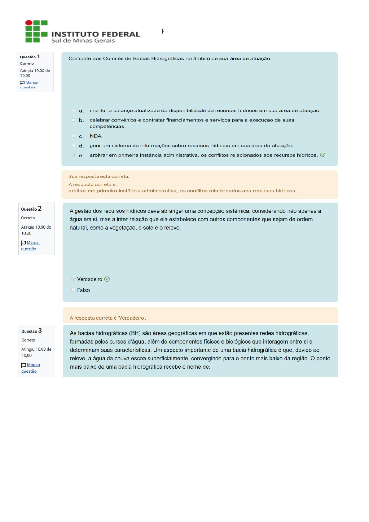 F INSTITUTO FEDERAL Sul de Minas Gerais Questão 1 Compete aos Comitês de Bacias Hidrográficas no âmbito de sua área de atuação: Correto Atingiu 10,00 de 10,00 Marcar questão a. manter o balanço atualizado da disponibilidade de recursos hídricos em sua área de atuação. b. celebrar convênios e contratar financiamentos e serviços para a execução de suas competências. NDA d. gerir um sistema de informações sobre recursos hídricos em sua área de atuação. e. arbitrar em primeira instância administrativa, os conflitos relacionados aos recursos hídricos. Sua resposta está correta. A resposta correta é: arbitrar em primeira instância administrativa, os conflitos relacionados aos recursos hídricos. Questão 2 A gestão dos recursos hídricos deve abranger uma concepção sistêmica, considerando não apenas a Correto água em si, mas a inter-relação que ela estabelece com outros componentes que sejam de ordem Atingiu 10,00 de natural, como a vegetação, o solo e o relevo. 10,00 Marcar questão Verdadeiro Falso A resposta correta é 'Verdadeiro'. Questão 3 As bacias hidrográficas (BH) são áreas geográficas em que estão presentes redes hidrográficas, Correto formadas pelos cursos d'água, além de componentes físicos e biológicos que interagem entre si e Atingiu 10,00 de determinam suas características. Um aspecto importante de uma bacia hidrográfica é que, devido ao 10,00 relevo, a água da chuva escoa superficialmente, convergindo para o ponto mais baixo da região. ponto Marcar mais baixo de uma bacia hidrográfica recebe nome de: questãoa. afluente b. nascente C. NDA d. exutório e. vertente Sua resposta está correta. A resposta correta é: exutório Questão 4 A bacia hidrográfica é a unidade territorial para implementação da Política Nacional de Recursos Hídricos Correto e atuação do Sistema Nacional de Gerenciamento de Recursos Hídricos. Atingiu 10,00 de 10,00 Verdadeiro Falso A resposta correta é 'Verdadeiro'. Questão 5 Uma bacia hidrográfica é uma região de drenagem de um rio principal e seus afluentes, que possuem Correto componentes que vão além dos recursos hídricos, englobando fatores abióticos e bióticos de um Atingiu 10,00 de ecossistema, relacionados entre si. Por se tratarem de áreas geográficas, as bacias possuem limites 10,00 definidos. A respeito da delimitação de bacias, analise as assertivas a seguir: Marcar questão I. A delimitação de uma bacia hidrográfica é um passo primordial para a implantação de programas voltados para a gestão de recursos hídricos e deve levar em consideração conceitos como sub-bacias e microbacias, que se diferenciam, entre outros aspectos, pela extensão geográfica que ocupam. II. A delimitação de uma bacia pode ser feita de forma manual ou automática. A delimitação manual é mais segura e eficiente que a delimitação automática, já que um erro de software pode prejudicar a correta delimitação das bacias. III. Uma região hidrográfica pode englobar mais de um estado após realizada a sua delimitação e, portanto, a gestão deve levar em consideração as características regionais de cada localidade. Após a análise das assertivas, marque a alternativa que contém a resposta correta: a. apenas a alternativa I está correta b. Todas estão Erradas C. Todas estão Corretas d. apenas a alternativa II está correta e. As alternativas e III estão corretas Sua resposta está correta. A resposta correta é: As alternativas e III estão corretas
