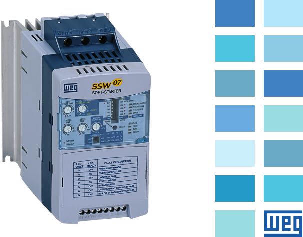 Motors | Automation | Energy | Transmission & Distribution | Coatings Soft-Starter Arrancador Suave Soft-Starter SSW-07 User Manual Manual del Usuario Manual do Usuário 06/2024 Series: SSW-07 Document: 0899.5832 / 16 English - Español - Português SOFT-STARTER USER MANUAL MANUAL DEL USUARIO DEL ARRANCADOR SUAVE MANUAL DO USUÁRIO DA SOFT-STARTER Es pa ño l En gl is h Po rt ug uê s Summary of revisions / Sumario de las revisiones / Sumário das revisões Es pa ño l En gl is h Po rt ug uê s The information below describes the revisions in this manual. Revision Description Chapter 1 First Edition - 2 General Revision - 3 General Revision - 4 Size 4 Included - 5 and 6 Table 3.1 and 8.2 corrected 3 and 8 7 Revision after the Size 4 UL certification. Changed: item 3.2.3; 3.2.4.1; 3.2.4.2; 3.2.7; 4.8; 5.2; E77 in the table 6.1; table 8.1 3, 4, 5, 6 and 8 8 Included new functions of software version V1.4x 3,4 and 5 9 General Revision - 10 Change in table 7.1 7 11 General Revision - 12 General Revision - 13 E19 Included in the table 6.1 6 14 and 15 Changes in item 3.2.4 3 16 Changes in item 3.2.7 3 La información abajo describe las revisiones ocurridas en este manual. A informação abaixo descreve as revisões ocorridas neste manual. Revisão Descrição Capítulo 1 Primeira Edição - 2 Revisão Geral - 3 Revisão Geral - 4 Inclusão da mecânica 4 - 5 e 6 Correções das tabelas 3.1 e 8.2 3 e 8 7 Correção depois da certificação UL da Mecânica 4. Alterado: item 3.2.3; 3.2.4.1; 3.2.4.2; 3.2.7; 4.8; 5.2; E77 na tabela 6.1; tabela 8.1 3, 4, 5, 6 e 8 8 Inclusão das novas funções da versão de software V1.4x 3, 4 e 5 9 Revisão Geral - 10 Alteração na tabela 7.1 7 11 Revisão Geral - 12 Revisão Geral - 13 Inclusão de E19 na tabela 6.1 6 14 e 15 Alterações no item 3.2.4 3 16 Alterações no item 3.2.7 3 Revisión Descripción Capítulo 1 Primer Edición - 2 Revisión General - 3 Revisión General - 4 Inclusión Mecánica 4 - 5 y 6 Correción de las tablas 3.1 y 8.2 3 y 8 7 Corrección luego de la certificación UL de la Mecánica 4. Modificado: ítem 3.2.3; 3.2.4.1; 3.2.4.2; 3.2.7; 4.8; 5.2; E77 en la tabla 6.1; tabla 8.1 3, 4, 5, 6 y 8 8 Inclusión de las nuevas funciones de la version de software V1.4x 3, 4 y 5 9 Revisión General - 10 Alteración en la tabla 7.1 7 11 Revisión General - 12 Revisión General - 13 Inclusión E19 en la tabla 6.1 6 14 y 15 Modificaciones en el ítem 3.2.4 3 16 Modificaciones en el ítem 3.2.7 3 Summary En gl is h CHAPTER 1 Safety Instructions 1.1 Safety Notices in the Manual ................................................5 1.2 Safety Notices on the Product ..............................................5 1.3 Preliminary Recommendations .............................................5 CHAPTER 2 General Information 2.1 About this Manual ................................................................7 2.2 About the Soft-Starter SSW-07 ............................................7 2.3 Soft-Starter SSW-07 Identification Plate ............................8 2.4 Receiving and Storage .......................................................11 CHAPTER 3 Installation and Connection 3.1 Mechanical Installation .......................................................12 3.1.1 Environmental Conditions ............................................12 3.1.2 Soft-Starter SSW-07 Dimensions ................................12 3.1.3 Mounting Specifications ...............................................13 3.1.3.1 Mounting Inside a Panel .....................................14 3.1.3.2 Mounting on Surface ..........................................15 3.2 Electrical Installation ...........................................................15 3.2.1 Power Terminals ...........................................................16 3.2.2 Location of the Grounding, Control and Power Connections ..................................................................17 3.2.3 Recommended Power and Grounding Cables ............18 3.2.4 Power Supply Connection to the Soft-Starter SSW-07 18 3.2.4.1 Short Circuit Capacity, Fuses, ................................ Circuit Breaker – UL ............................................19 3.2.4.2 Input Circuit Breakers and Fuses – IEC ..............20 3.2.4.3 Control Fuse ........................................................21 3.2.5 Soft-Starter SSW-07 Connection to the Motor .............22 3.2.5.1 Standard Three-Wire Connection .......................23 3.2.6 Grounding Connections ...............................................23 3.2.7 Control and Signal Connections ...................................24 3.3 Recommended Set-ups ......................................................25 3.3.1 Recommended Set-up with Command via Two-wire Digital Inputs and Isolation Contactor ..........................26 3.3.2 Recommended Set-up with Command via Three-wire Digital Inputs and Circuit-Breaker ................................26 3.3.3 Recommended Set-up with Command via Two-wire Digital Inputs and Direction of Rotation .......................27 3.3.4 Recommended Set-up with Command via Two-wires Digital Inputs and DC-Braking .....................................28 3.3.5 Symbols .......................................................................29 Summary En gl is h CHAPTER 4 Setting the SSW-07 4.1 Control Type Setting ...........................................................30 4.2 Kick Start ............................................................................31 4.3 Initial Voltage Setting ..........................................................31 4.4 Current Limit Setting ...........................................................32 4.5 Acceleration Ramp Time Setting ........................................31 4.6 Deceleration Ramp Time Setting ........................................31 4.7 Motor Current Setting .........................................................32 4.8 Motor Electronic Overload Protection ................................33