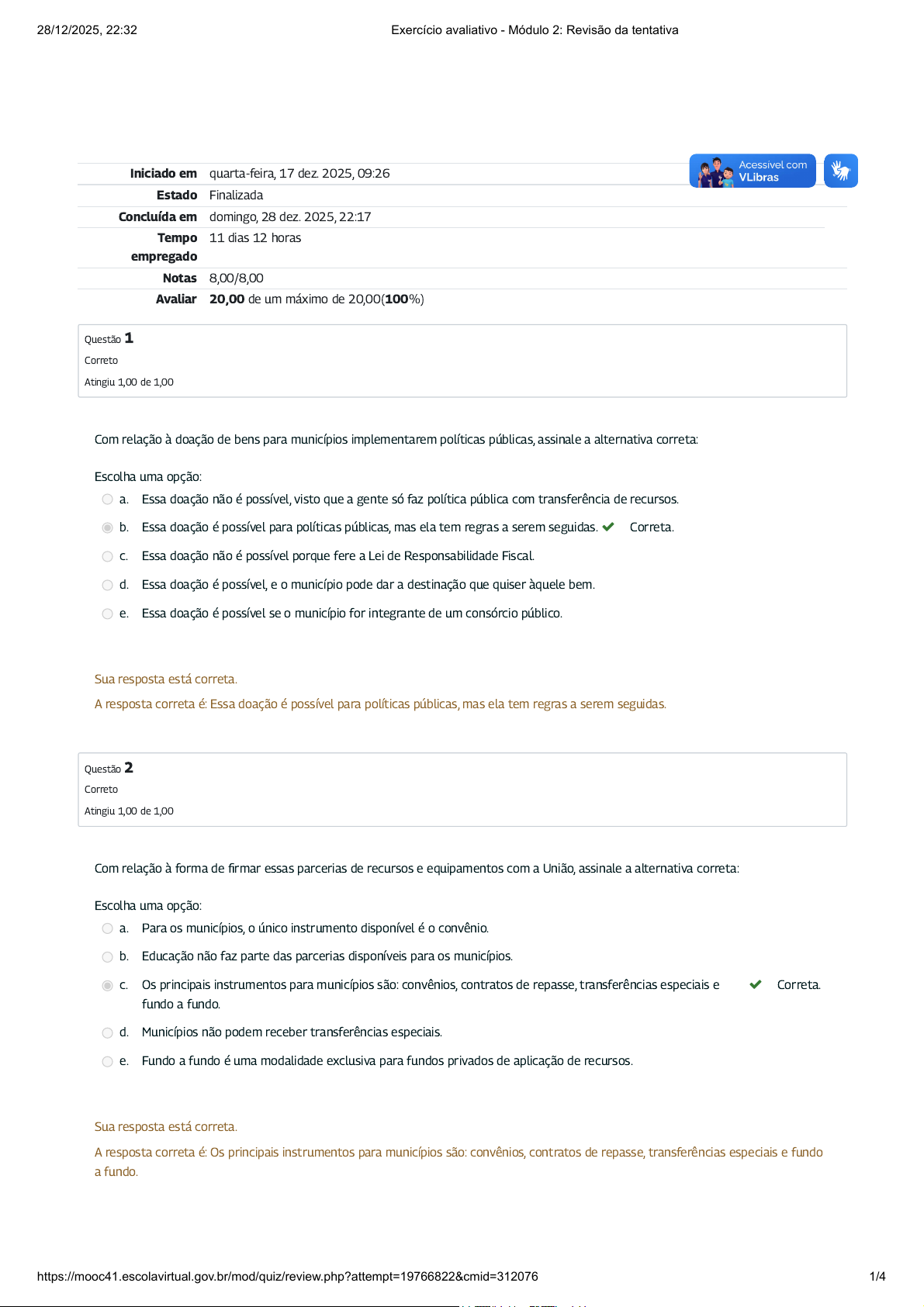 Iniciado em quarta-feira, 17 dez. 2025, 09:26 Estado Finalizada Concluída em domingo, 28 dez. 2025, 22:17 Tempo empregado 11 dias 12 horas Notas 8,00/8,00 Avaliar 20,00 de um máximo de 20,00(100%) Questão 1 Correto Atingiu 1,00 de 1,00 Questão 2 Correto Atingiu 1,00 de 1,00 Com relação à doação de bens para municípios implementarem políticas públicas, assinale a alternativa correta: Escolha uma opção: a. Essa doação não é possível, visto que a gente só faz política pública com transferência de recursos. b. Essa doação é possível para políticas públicas, mas ela tem regras a serem seguidas. Correta. c. Essa doação não é possível porque fere a Lei de Responsabilidade Fiscal. d. Essa doação é possível, e o município pode dar a destinação que quiser àquele bem. e. Essa doação é possível se o município for integrante de um consórcio público. Sua resposta está correta. A resposta correta é: Essa doação é possível para políticas públicas, mas ela tem regras a serem seguidas. Com relação à forma de firmar essas parcerias de recursos e equipamentos com a União, assinale a alternativa correta: Escolha uma opção: a. Para os municípios, o único instrumento disponível é o convênio. b. Educação não faz parte das parcerias disponíveis para os municípios. c. Os principais instrumentos para municípios são: convênios, contratos de repasse, transferências especiais e fundo a fundo. Correta. d. Municípios não podem receber transferências especiais. e. Fundo a fundo é uma modalidade exclusiva para fundos privados de aplicação de recursos. Sua resposta está correta. A resposta correta é: Os principais instrumentos para municípios são: convênios, contratos de repasse, transferências especiais e fundo a fundo. 28/12/2025, 22:32 Exercício avaliativo - Módulo 2: Revisão da tentativa https://mooc41.escolavirtual.gov.br/mod/quiz/review.php?attempt=19766822&cmid=312076 1/4 Questão 3 Correto Atingiu 1,00 de 1,00 Questão 4 Correto Atingiu 1,00 de 1,00 Quanto aos recursos das parcerias firmadas com a União, assinale a alternativa correta: Escolha uma opção: a. O orçamento é a fonte de informação primária e nele constam os recursos de ações da União e as respectivas emendas parlamentares. Correta. b. As emendas são separadas do orçamento geral, com lei própria. c. Não é possível identificar as ações no orçamento da União. d. Só existem recursos de emendas disponíveis para municípios. e. Não existe possibilidade de parceria com municípios. Sua resposta está correta. A resposta correta é: O orçamento é a fonte de informação primária e nele constam os recursos de ações da União e as respectivas emendas parlamentares. Sobre as emendas individuais impositivas, assinale a alternativa correta: Escolha uma opção: a. Os parlamentares possuem cotas diferentes de emendas, a depender do tamanho do estado. b. Não posso estar inadimplente para receber essas emendas. c. Se o parlamentar indicar o município, não precisa fazer mais nada, pois o dinheiro aparece na conta e não tem regra de gasto. d. O parlamentar pode indicar toda a cota dele para uma ação de educação. e. Também podem ser chamadas de emendas RP6. É preciso ficar atento para não perder prazos e cair em impedimento técnico. Correto. Sua resposta está correta. A resposta correta é: Também podem ser chamadas de emendas RP6. É preciso ficar atento para não perder prazos e cair em impedimento técnico. 28/12/2025, 22:32 Exercício avaliativo - Módulo 2: Revisão da tentativa https://mooc41.escolavirtual.gov.br/mod/quiz/review.php?attempt=19766822&cmid=312076 2/4 Questão 5 Correto Atingiu 1,00 de 1,00 Questão 6 Correto Atingiu 1,00 de 1,00 Em relação às emendas de bancadas estaduais impositivas, assinale a alternativa correta: Escolha uma opção: a. São denominadas emendas RP5 porque estão em quinto lugar como mais executadas. b. São as bancadas separadas por partidos políticos dentro do Congresso. c. Não têm caráter impositivo previsto na Constituição. d. São emendas impositivas e também são denominadas RP7. Correto. e. O município precisa estar adimplente para receber. Sua resposta está correta. A resposta correta é: São emendas impositivas e também são denominadas RP7. Em relação às emendas no orçamento geral da União, assinale a alternativa correta: Escolha uma opção: a. Todas as emendas parlamentares são impositivas. b. As emendas de comissão são um subtipo das emendas de bancada. c. Existem outros tipos de emendas, além das individuais e de bancadas impositivas, mas sem caráter de execução obrigatória. Correto. d. Todas as emendas possuem a marcação de RP6. e. Nenhuma emenda precisa de adimplência. Sua resposta está correta. A resposta correta é: Existem outros tipos de emendas, além das individuais e de bancadas impositivas, mas sem caráter de execução obrigatória. 28/12/2025, 22:32 Exercício avaliativo - Módulo 2: Revisão da tentativa https://mooc41.escolavirtual.gov.br/mod/quiz/review.php?attempt=19766822&cmid=312076 3/4 Questão 7 Correto Atingiu 1,00 de 1,00 Questão 8 Correto Atingiu 1,00 de 1,00 No que tange às transferências voluntárias da União, assinale a alternativa correta: Escolha uma opção: a. Sem a senha da Plataforma +Brasil, eu não consigo visualizar as oportunidades de recursos disponibilizados. b. Todas as transferências voluntárias estão disponibilizadas na Plataforma +Brasil. Correto. c. Preciso prever recursos para pagar o pacote do aplicativo do Gestor +Brasil e ficar por dentro dos programas disponibilizados. d. Se eu receber uma emenda, não poderei receber outro tipo de transferência. e. Preciso pagar uma consultoria para acessar a Plataforma +Brasil. Sua resposta está correta. A resposta correta é: Todas as transferências voluntárias estão disponibilizadas na Plataforma +Brasil. Em relação aos repasses de recursos da União para 