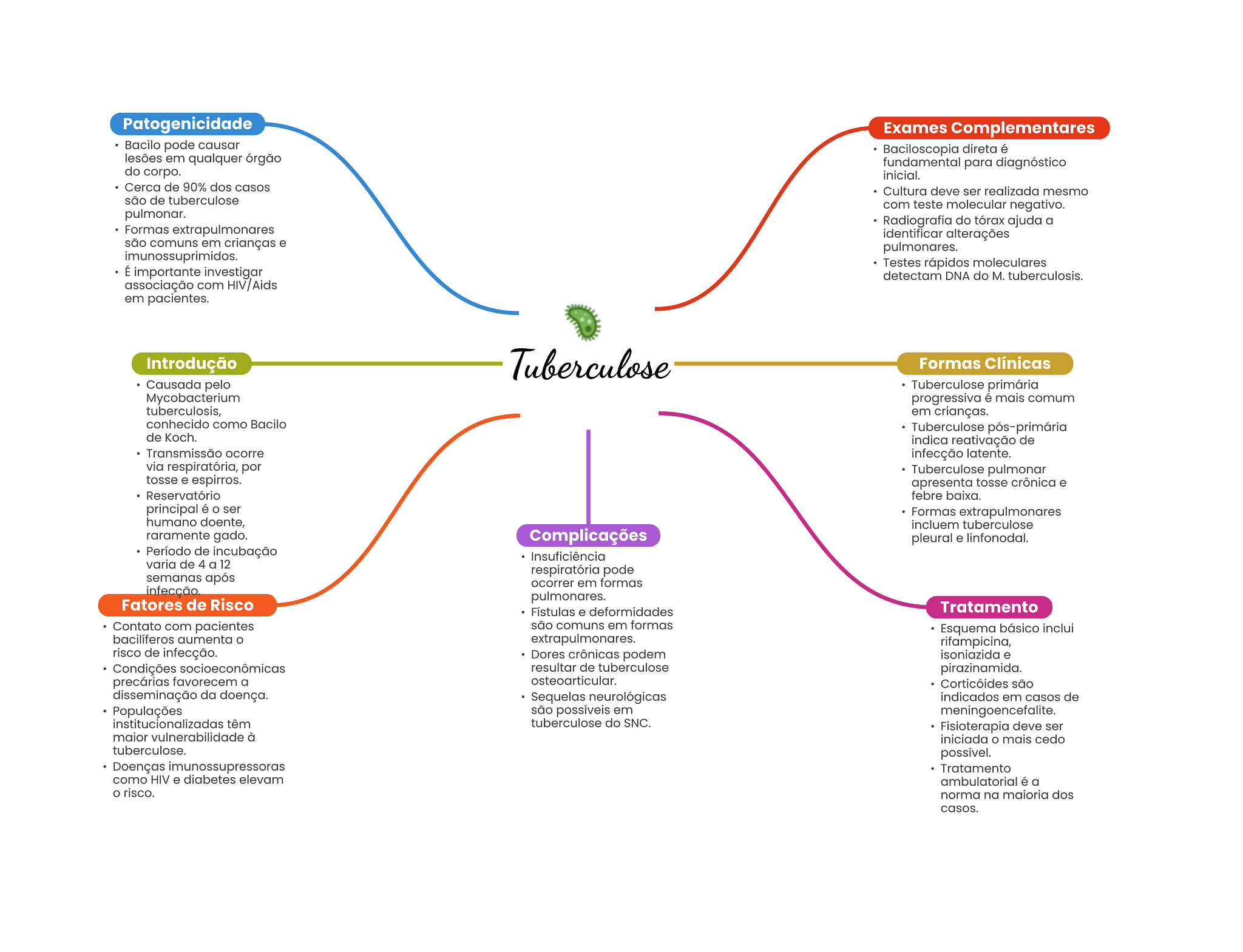 Patogenicidade Exames Complementares Bacilo pode causar Baciloscopia direta é lesões em qualquer órgão fundamental para diagnóstico do corpo. inicial. Cerca de 90% dos casos Cultura deve ser realizada mesmo são de tuberculose com teste molecular negativo. pulmonar. Radiografia do tórax ajuda a Formas extrapulmonares identificar alterações são comuns em crianças e pulmonares. imunossuprimidos. Testes rápidos moleculares É importante investigar detectam DNA do M. tuberculosis. associação com HIV/Aids em pacientes. Introdução Tuberculose Formas Clínicas Causada pelo Tuberculose primária Mycobacterium progressiva é mais comum tuberculosis, em crianças. conhecido como Bacilo Tuberculose pós-primária de Koch. indica reativação de Transmissão ocorre infecção latente. via respiratória, por Tuberculose pulmonar tosse e espirros. apresenta tosse crônica e Reservatório febre baixa. principal é O ser Formas extrapulmonares humano doente, incluem tuberculose raramente gado. Complicações pleural e linfonodal. Período de incubação Insuficiência varia de 4 a 12 respiratória pode semanas após ocorrer em formas infecção Fatores de Risco pulmonares. Fístulas e deformidades Tratamento Contato com pacientes são comuns em formas Esquema básico inclui baciliferos aumenta extrapulmonares. rifampicina, risco de infecção. Dores crônicas podem isoniazida e Condições socioeconômicas resultar de tuberculose pirazinamida. precárias favorecem a osteoarticular. Corticóides são disseminação da doença. Sequelas neurológicas indicados em casos de Populações são possíveis em meningoencefalite. institucionalizadas têm tuberculose do SNC. Fisioterapia deve ser maior vulnerabilidade à iniciada mais cedo tuberculose. possível. Doenças imunossupressoras Tratamento como HIV e diabetes elevam ambulatorial é a risco. norma na maioria dos casos.