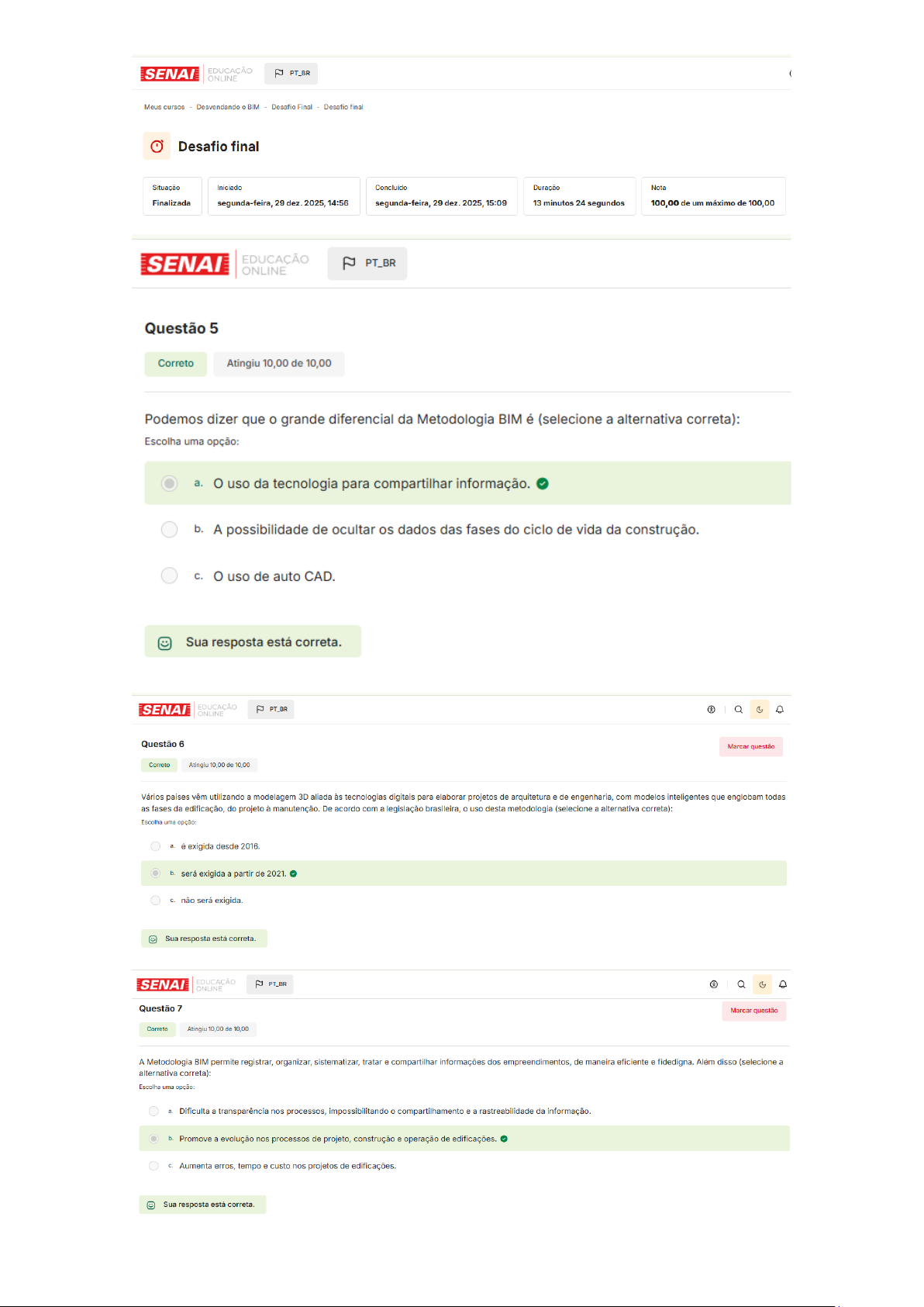 SENAI EDUCAÇÃO PT_BR ( ONLINE Meus cursos Desvendando BIM - Desafio Final Desafio final Desafio final Situação Iniciado Duração Nota Finalizada segunda-feira, 29 dez. 2025, 14:56 segunda-feira, 29 dez. 2025, 15:09 13 minutos 24 segundos 100,00 de um máximo de 100,00 SENAI EDUCAÇÃO PT_BR ONLINE Questão 5 Correto Atingiu 10,00 de 10,00 Podemos dizer que o grande diferencial da Metodologia BIM é (selecione a alternativa correta): Escolha uma opção: a. uso da tecnologia para compartilhar informação. b. A possibilidade de ocultar os dados das fases do ciclo de vida da construção. uso de auto CAD. Sua resposta está correta. SENAI EDUCAÇÃO PT_BR a ONLINE Questão 6 Marcar questão Correto Atingiu 10,00 de 10,00 Vários países vêm utilizando a modelagem 3D aliada às tecnologias digitais para elaborar projetos de arquitetura e de engenharia, com modelos inteligentes que englobam todas as fases da edificação, do projeto manutenção. De acordo com a legislação brasileira, uso desta metodologia (selecione a alternativa correta): Escolha uma opção: a. é exigida desde 2016. b. será exigida a partir de 2021. não será exigida. Sua resposta está correta. SENAI EDUCAÇÃO PT_BR * ONLINE Questão 7 Marcar questão Correto Atingiu 10,00 de 10,00 A Metodologia BIM permite registrar, organizar, sistematizar, tratar e compartilhar informações dos empreendimentos, de maneira eficiente e fidedigna. Além disso (selecione a alternativa correta): Escolha uma opção: Dificulta a transparência nos processos, impossibilitando compartilhamento e a rastreabilidade da informação. b. Promove a evolução nos processos de projeto, construção e operação de edificações. Aumenta erros, tempo e custo nos projetos de edificações. Sua resposta está correta.