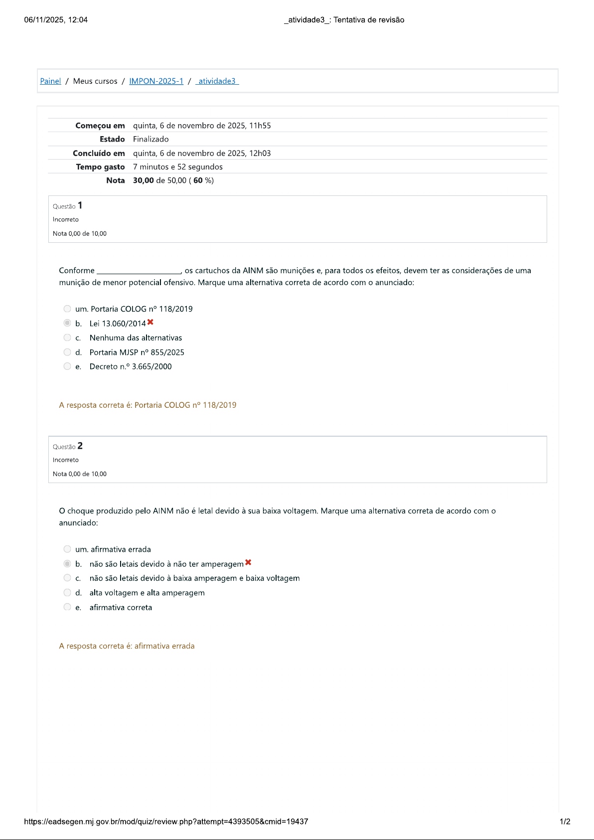 06/11/2025, 12:04 atividade3 Tentativa de revisão Painel / Meus cursos / IMPON-2025-1 / atividade3 Começou em quinta, 6 de novembro de 2025, 11h55 Estado Finalizado Concluído em quinta, 6 de novembro de 2025, 12h03 Tempo gasto 7 minutos e 52 segundos Nota 30,00 de 50,00 Questão 1 Incorreto Nota 0,00 de 10,00 Conforme os cartuchos da AINM são munições e, para todos os efeitos, devem ter as considerações de uma munição de menor potencial ofensivo. Marque uma alternativa correta de acordo com o anunciado: um. Portaria COLOG n° 118/2019 b. Lei 13.060/2014 C. Nenhuma das alternativas d. Portaria MJSP n° 855/2025 e. Decreto 3.665/2000 A resposta correta é: Portaria COLOG n° 118/2019 Questão 2 Incorreto Nota 0,00 de 10,00 choque produzido pelo AINM não é letal devido à sua baixa voltagem. Marque uma alternativa correta de acordo com o anunciado: um. afirmativa errada b. não são letais devido à não ter amperagem C. não são letais devido à baixa amperagem e baixa voltagem d. alta voltagem e alta amperagem e. afirmativa correta A resposta correta é: afirmativa errada 1/206/11/2025, 12:04 atividade3 Tentativa de revisão Questão 3 Correto Nota 10,00 de 10,00 Certo profissional de segurança pública se deparou com uma ocorrência com sujeito de intenção suicida. Visivelmente transtornado o sujeito mantém contra a sua cabeça uma arma de fogo engatilhada e com seu dedo na tecla do gatilho. Diante desse cenário o profissional de segurança pública deverá na primeira oportunidade, utilizar seu AINM disparando no centro de massa do sujeito com intenção suicida. Marque uma alternativa correta de acordo com anunciado: um. afirmativa correta, pois ao receber a descarga eletroeletrônica, não há contrações musculares involuntárias b. afirmativa errada, pois ao receber a descarga eletroeletrônica, há contrações musculares involuntárias C. disparar na arma do suicida d. as alternativas estão corretas e. certamente das alternativas A resposta correta é: afirmativa errada, pois ao receber a descarga eletroeletrônica, há contrações musculares involuntárias Questão 4 Correto Nota 10,00 de 10,00 É prejudicado a aplicação da AINM em sujeitos portando misto de baixa velocidade, pois estes produtos não são enquadrados como explosivos. Marque uma alternativa correta de acordo com anunciado: um. certamente das alternativas b. afirmativa errada, pois, não se deve utilizar em pessoas que estão portando dispositivos explosivos C. poderá desde que sujeito não esteja em um posto de combustível d. mistos explosivos, não são considerados explosivos e. afirmativa correta A resposta correta é: afirmativa errada, pois, não se deve utilizar em pessoas que estão portando dispositivos explosivos Questão 5 Correto Nota 10,00 de 10,00 Tomando os procedimentos corretos sobre a aplicação do AINM, estes podem ser empregados contra infrator ativo de mãos livres aplicando golpe letal em terceira pessoa. Marque uma alternativa correta de acordo com anunciado: um. certamente das alternativas b. a verbalização clara com o sujeito é totalmente dispensável C. aplicação correta d. só em sujeito ativo na iminência de deferir ou desferindo golpes com um bastão ou instrumento perfurante cortante. e. sim! independentemente de estarem esgotados todos os meios de persuasão A resposta correta é: aplicação correta 2/2