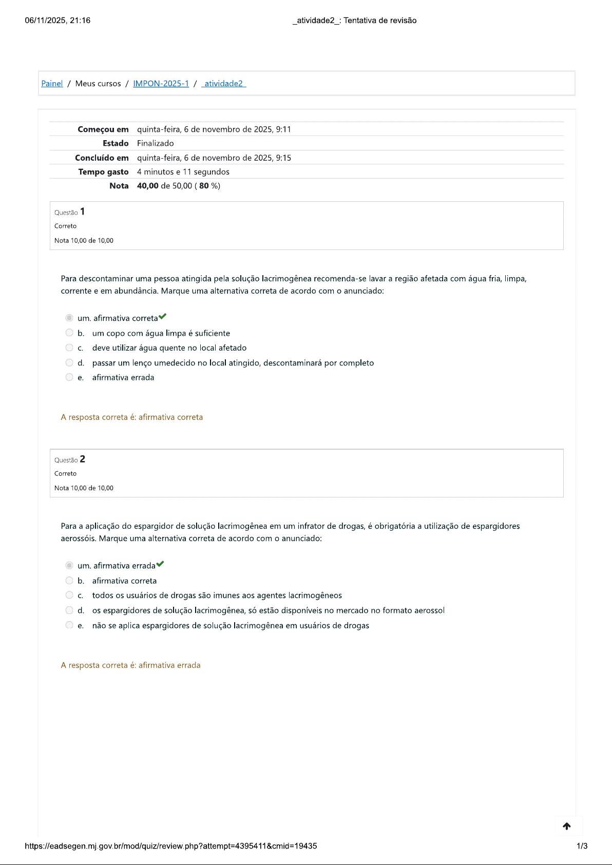 06/11/2025, 21:16 atividade2 Tentativa de revisão Painel / Meus cursos / IMPON-2025-1 / atividade2 Começou em quinta-feira, 6 de novembro de 2025, 9:11 Estado Finalizado Concluído em quinta-feira, 6 de novembro de 2025, 9:15 Tempo gasto 4 minutos e 11 segundos Nota 40,00 de 50,00 Questão 1 Correto Nota 10,00 de 10,00 Para descontaminar uma pessoa atingida pela solução lacrimogênea recomenda-se lavar a região afetada com água fria, limpa, corrente e em abundância. Marque uma alternativa correta de acordo com o anunciado: um. afirmativa correta b. um copo com água limpa é suficiente C. deve utilizar água quente no local afetado d. passar um lenço umedecido no local atingido, descontaminará por completo e. afirmativa errada A resposta correta é: afirmativa correta Questão 2 Correto Nota 10,00 de 10,00 Para a aplicação do espargidor de solução lacrimogênea em um infrator de drogas, é obrigatória a utilização de espargidores aerossóis. Marque uma alternativa correta de acordo com o anunciado: um. afirmativa errada b. afirmativa correta C. todos os usuários de drogas são imunes aos agentes lacrimogêneos d. os espargidores de solução lacrimogênea, só estão disponíveis no mercado no formato aerossol e. não se aplica espargidores de solução lacrimogênea em usuários de drogas A resposta correta é: afirmativa errada 1/306/11/2025, 21:16 atividade2 Tentativa de revisão Questão 3 Incorreto Nota 0,00 de 10,00 De acordo com a estrutura mecânica e química dos espargidores, associe a segunda coluna de acordo com a primeira: A É um gás pressurizado em equilíbrio com a solução lacrimogênea. Tem a função de provocar a saída da solução lacrimogênea para o meio externo. 1 Atuador ou botão de acionamento Estrutura responsável pelo funcionamento do espargidor. É sobre ele que dedo do operador exerce pressão fazendo espargir a solução lacrimogênea. 2 Dispersador () - É a abertura que permite a saída da solução lacrimogênea. Nos espargidores aerossóis, 3 Propelente esta estrutura provoca a dispersão cônica da solução lacrimogênea (semelhante aos sprays desodorantes). De outra forma, nos espargidores de solução lacrimogênea em espuma ou gel o dispersador cria um jato direcionado, pontual. b. C. d. TÁXI e. B,C,A A resposta correta é: B, Questão 4 Correto Nota 10,00 de 10,00 Os principais efeitos fisiológicos dos agentes lacrimogêneos são: ardor, lacrimejamento, contração involuntária das provas, lances, espirros, rinorréia e efeitos dermatológicos. Marque uma alternativa correta de acordo com o anunciado: um. tosse, febre e dores no corpo b. não há efeitos fisiológicos em seres humanos C. afirmativa errada d. afirmativa correta e. só lacrimejamento A resposta correta é: afirmativa correta 2/306/11/2025, 21:16 _atividade2_ Tentativa de revisão Questão 5 Correto Nota 10,00 de 10,00 Os espargidores de solução lacrimogênea em espuma ou gel são altamente recomendados para controle de grupos numerosos de infratores, tendo em vista sua efetividade contra alvos múltiplos. Marque uma alternativa correta de acordo com anunciado: um. afirmativa correta b. são empregados para contaminação da atmosfera C. afirmativa errada d. são empregados sem seletividade do alvo e. só em ambiente aberto A resposta correta é: afirmativa errada 3/3