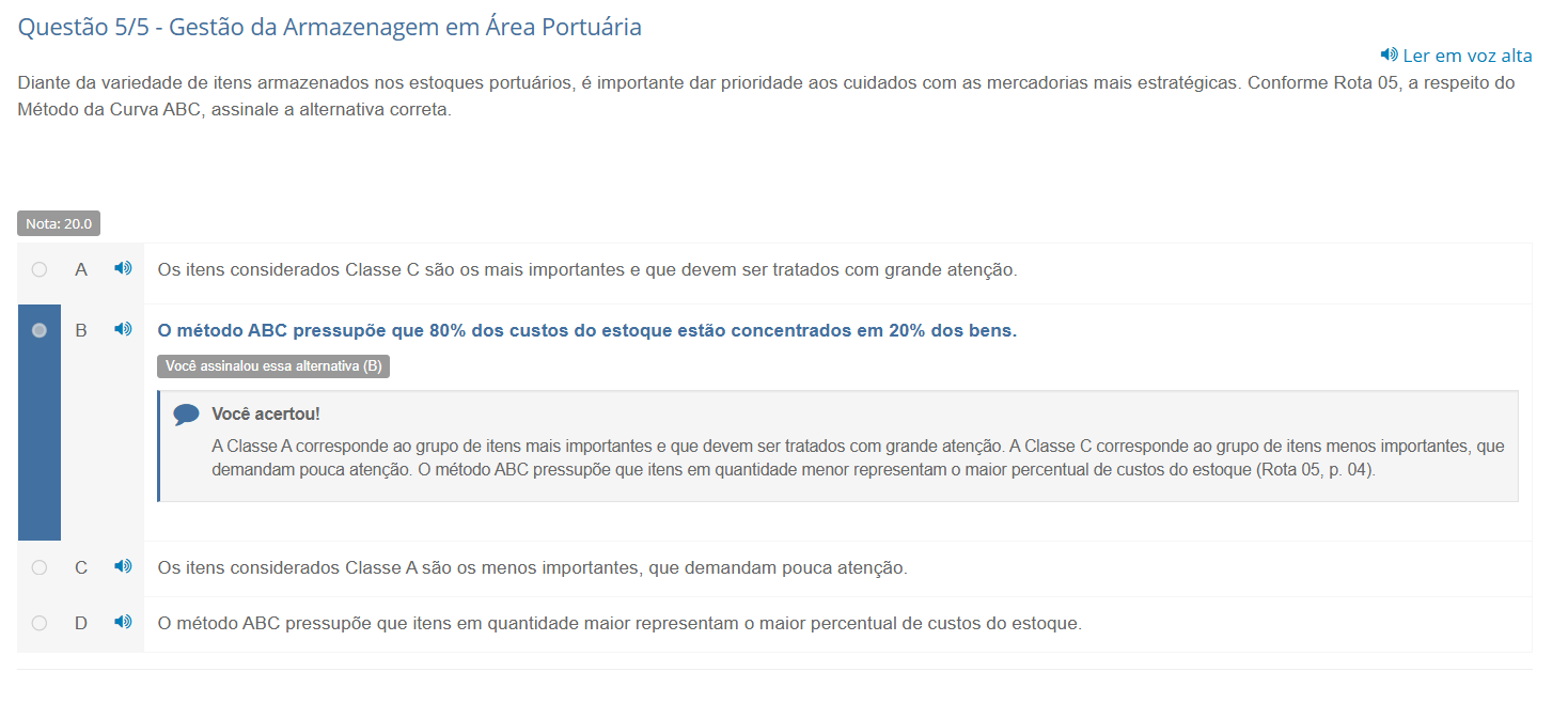 Questão 5/5 Gestão da Armazenagem em Área Portuária Ler em voz alta Diante da variedade de itens armazenados nos estoques portuários, é importante dar prioridade aos cuidados com as mercadorias mais estratégicas. Conforme Rota 05, a respeito do Método da Curva ABC, assinale a alternativa correta. Nota: 20.0 A Os itens considerados Classe C são mais importantes e que devem ser tratados com grande atenção. B método ABC pressupõe que 80% dos custos do estoque estão concentrados em 20% dos bens. Você assinalou essa alternativa (B) Você acertou! A Classe A corresponde ao grupo de itens mais importantes e que devem ser tratados com grande atenção. A Classe C corresponde ao grupo de itens menos importantes, que demandam pouca atenção. método ABC pressupõe que itens em quantidade menor representam 0 maior percentual de custos do estoque (Rota 05, p. 04). C Os itens considerados Classe A são menos importantes, que demandam pouca atenção. D método ABC pressupõe que itens em quantidade maior representam 0 maior percentual de custos do estoque.