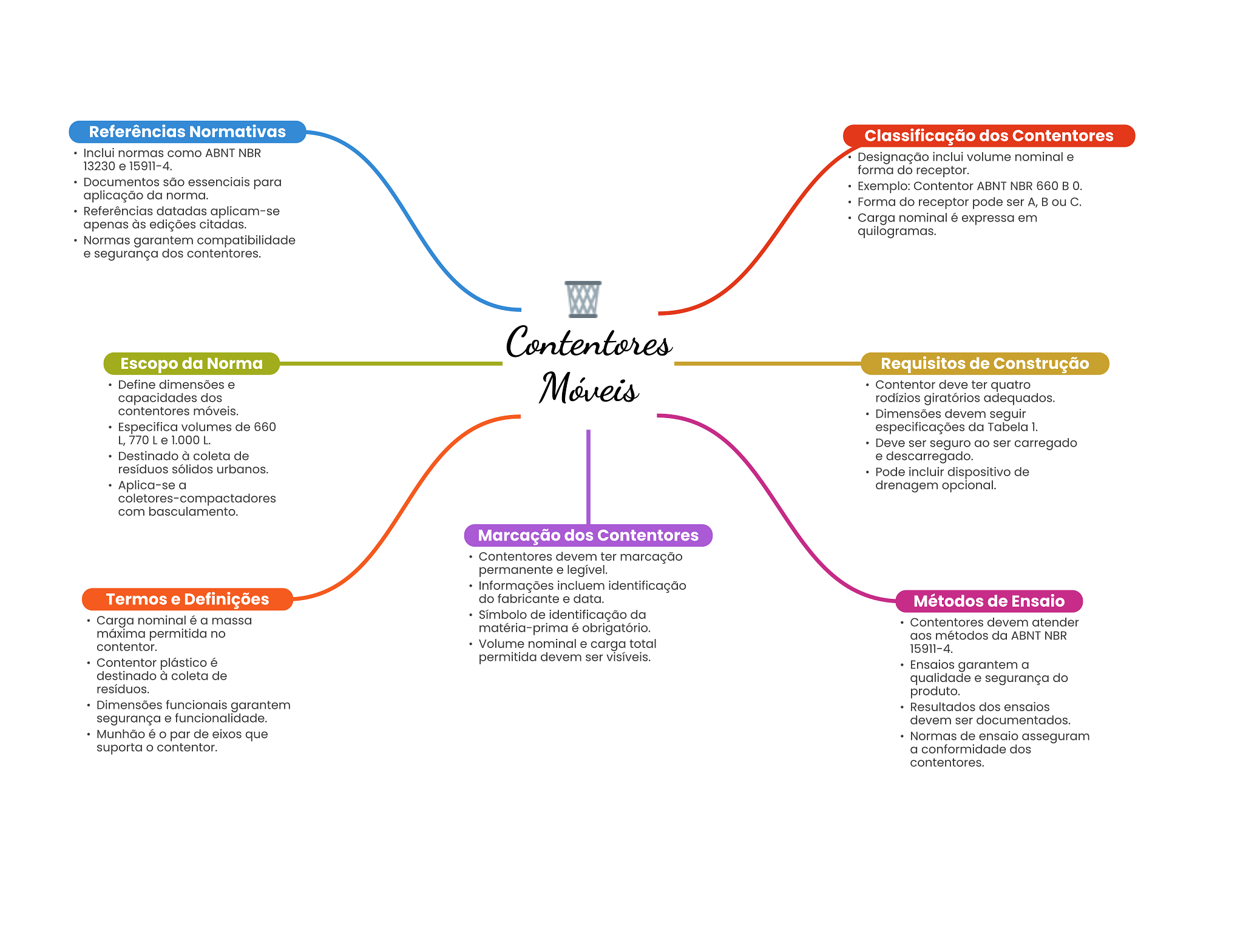 Referências Normativas Classificação dos Contentores Inclui normas como ABNT NBR Designação inclui volume nominal e 13230 e 15911-4. forma do receptor. Documentos são essenciais para Exemplo: Contentor ABNT NBR 660 B 0. aplicação da norma. Forma do receptor pode ser A, ou C. Referências datadas aplicam-se apenas às edições citadas. Carga nominal é expressa em quilogramas. Normas garantem compatibilidade e segurança dos contentores. Contentores Escopo da Norma Requisitos de Construção Define dimensões e capacidades dos Móveis Contentor deve ter quatro rodízios giratórios adequados. contentores móveis. Dimensões devem seguir Especifica volumes de 660 especificações da Tabela 1. L, 770 L e 1.000 L. Deve ser seguro ao ser carregado Destinado à coleta de e descarregado. resíduos sólidos urbanos. Pode incluir dispositivo de Aplica-se a drenagem opcional. coletores-compactadores com basculamento. Marcação dos Contentores Contentores devem ter marcação permanente e legível. Informações incluem identificação Termos e Definições do fabricante e data. Métodos de Ensaio Carga nominal é a massa Símbolo de identificação da Contentores devem atender máxima permitida no matéria-prima é obrigatório. aos métodos da ABNT NBR contentor. Volume nominal e carga total 15911-4. Contentor plástico é permitida devem ser visíveis. Ensaios garantem a destinado à coleta de qualidade e segurança do resíduos. produto. Dimensões funcionais garantem Resultados dos ensaios segurança e funcionalidade. devem ser documentados. Munhão é par de eixos que Normas de ensaio asseguram suporta contentor. a conformidade dos contentores.